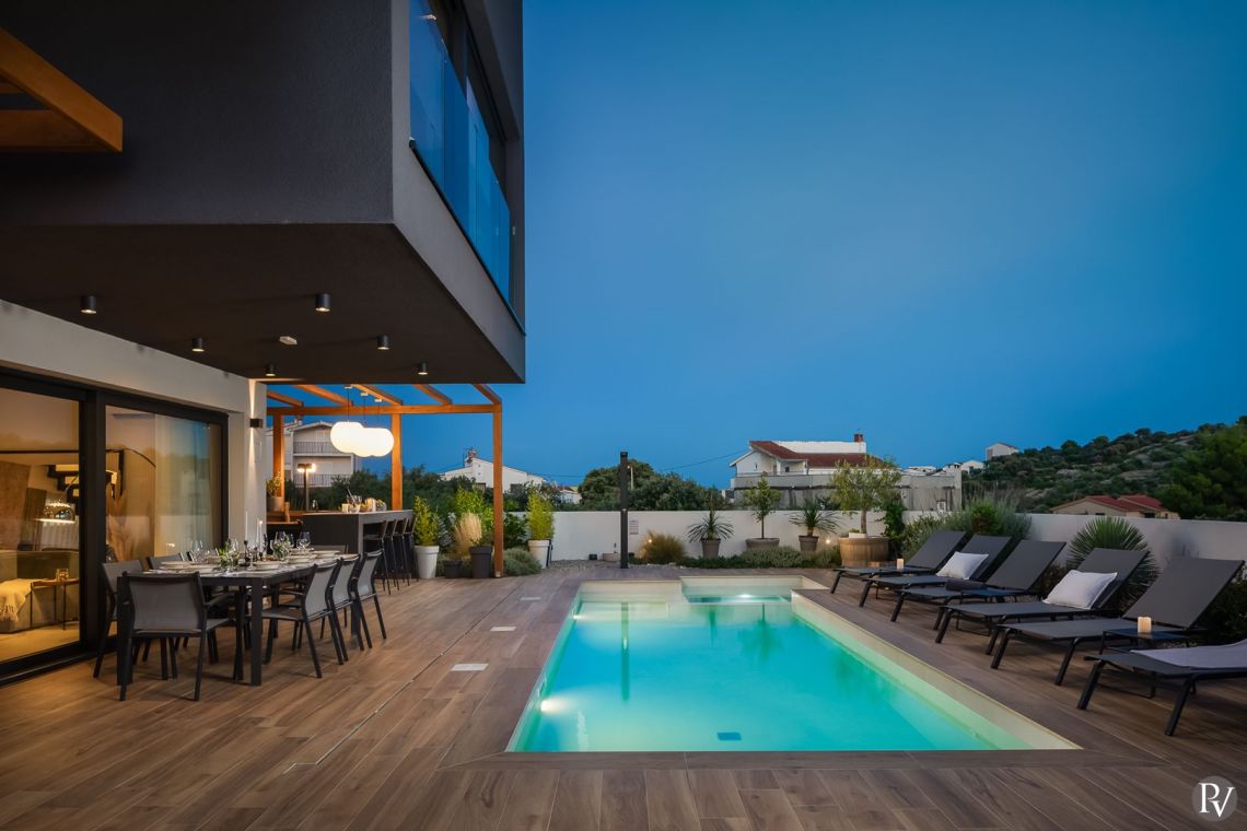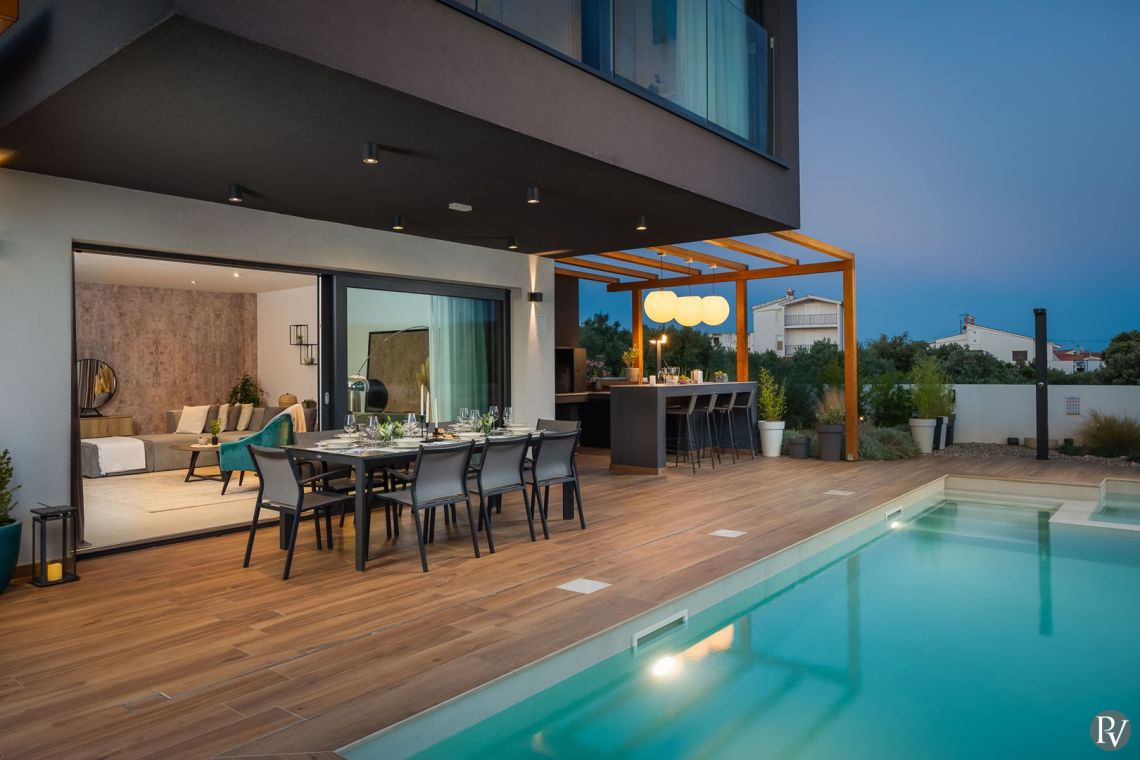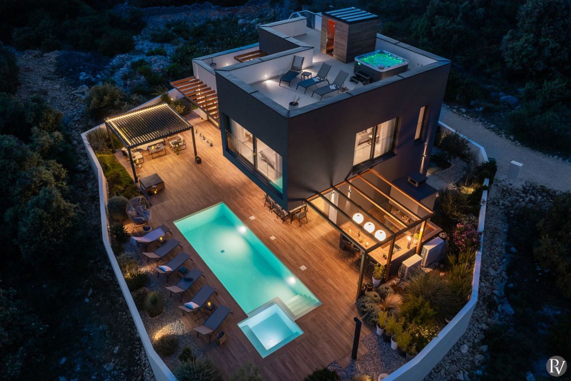 Designed for comfort and style, the villa accommodates up to 8 guests and features a heated private pool with jacuzzi section, rooftop terrace with jacuzzi and sauna, and stylish indoor and outdoor living spaces. With its peaceful surroundings and close proximity to the sea, Villa Roko is ideal for families, couples, or small groups looking to experience the beauty of Dalmatia in comfort and privacy.