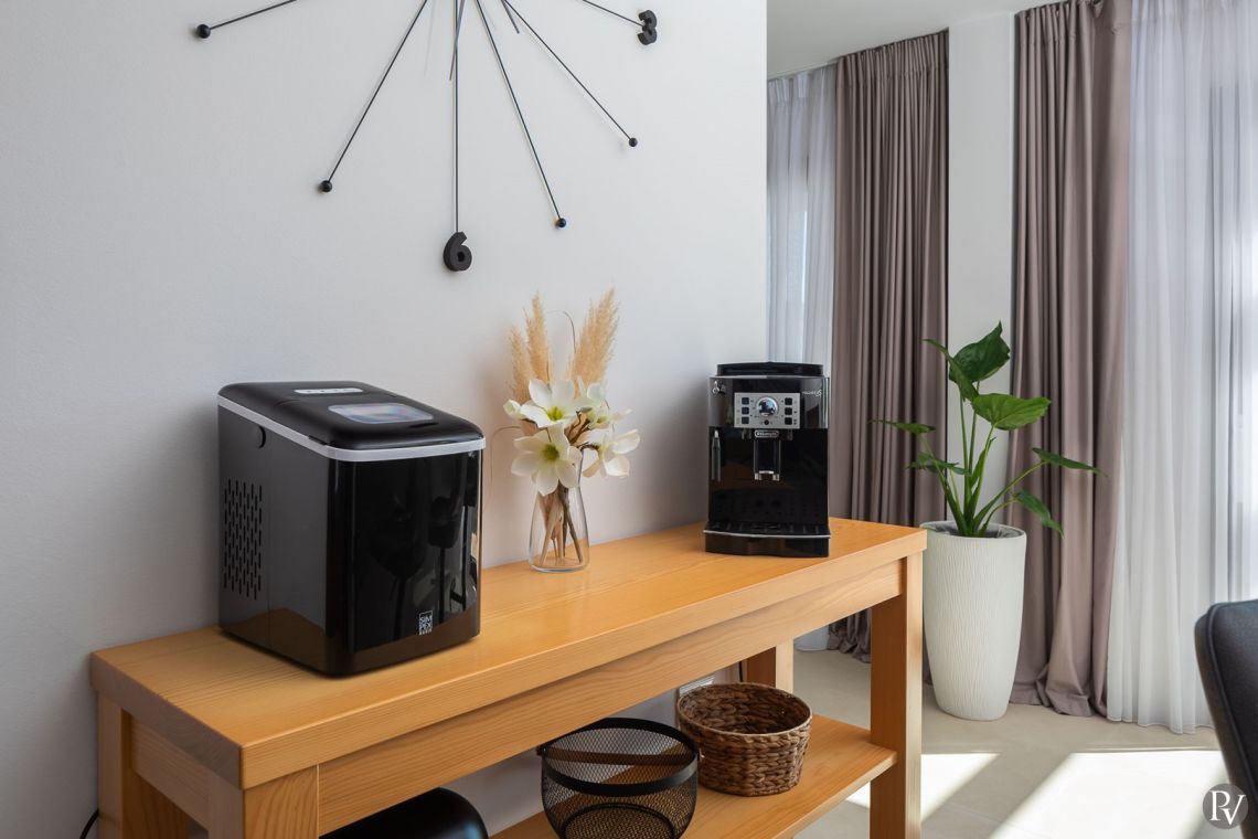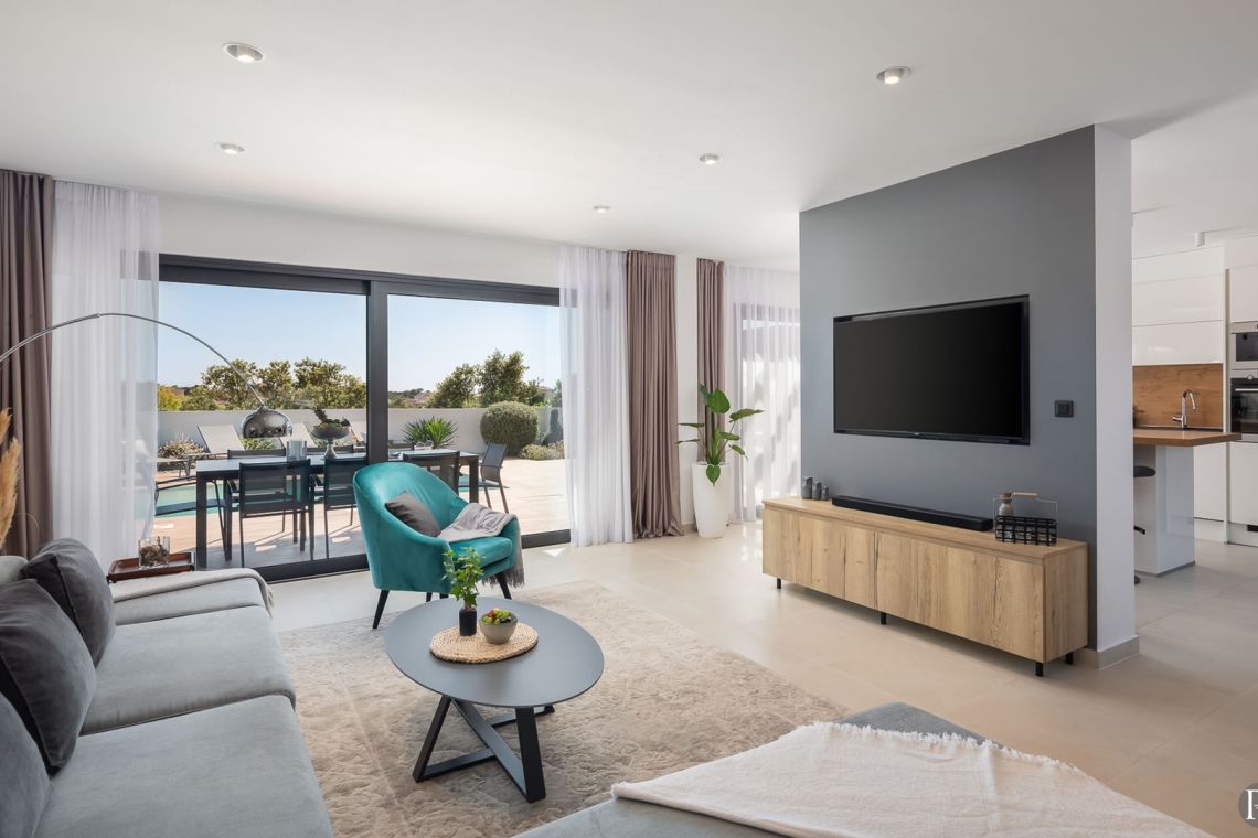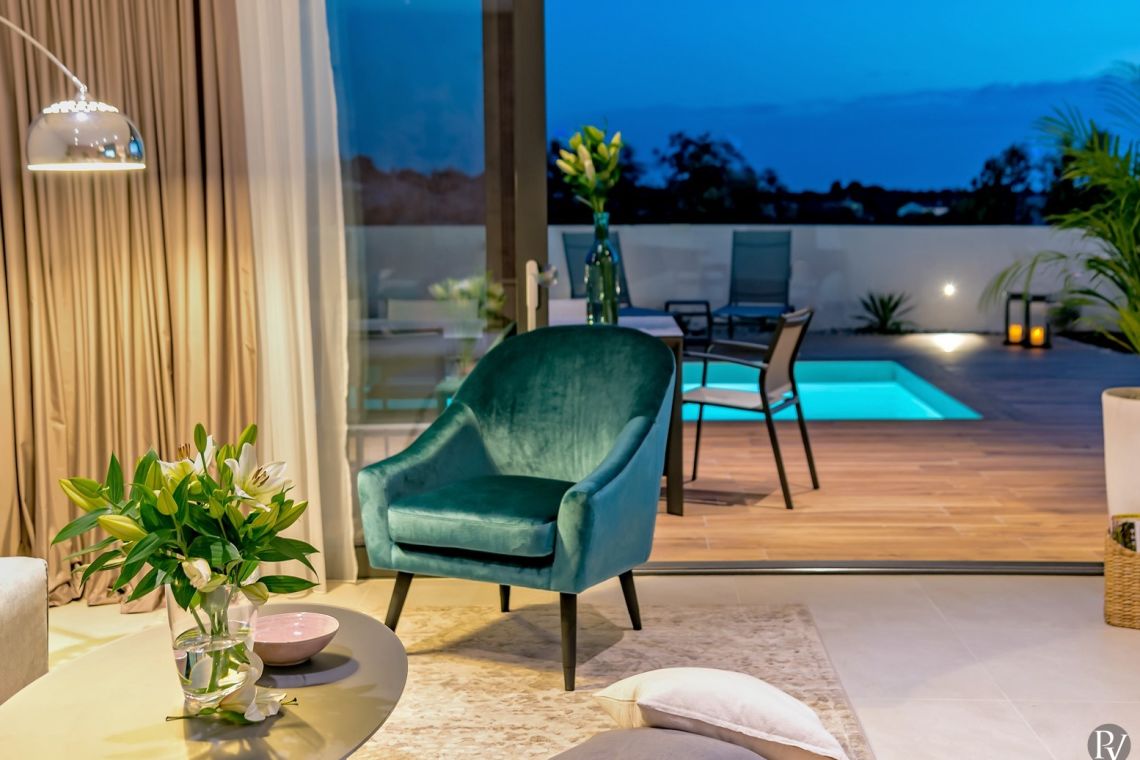 Villa Roko combines contemporary design with comfortable living spaces across two levels. The villa features a bright open-plan living area with a stylish lounge, SAT TV, dining space, and a fully equipped modern kitchen. Large glass doors connect the interior with the outdoor pool terrace, allowing plenty of natural light and seamless indoor–outdoor living.