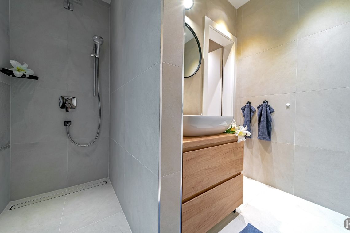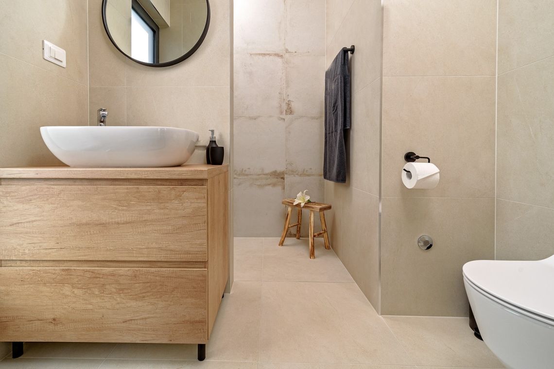 All bedrooms are air-conditioned and equipped with SAT TV, providing a comfortable retreat after a day at the beach or exploring the surrounding coastline. The villa also includes three bathrooms in total plus an additional guest toilet on the ground floor.