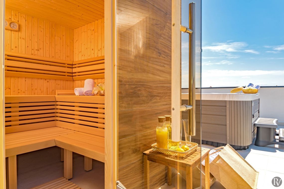 A highlight of the property is the rooftop terrace, which features a private jacuzzi and sauna overlooking panoramic views of the Adriatic Sea. This elevated space offers a peaceful setting for sunset relaxation and memorable moments during your stay.