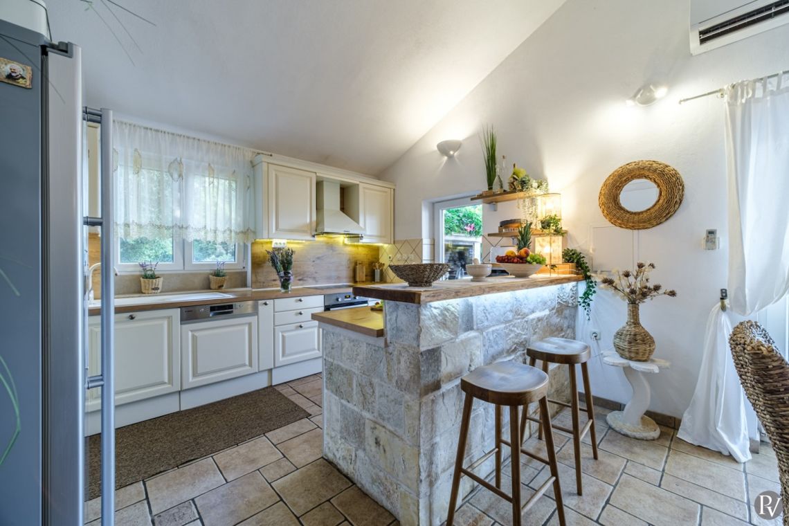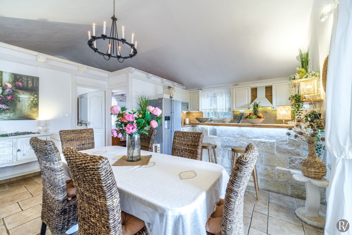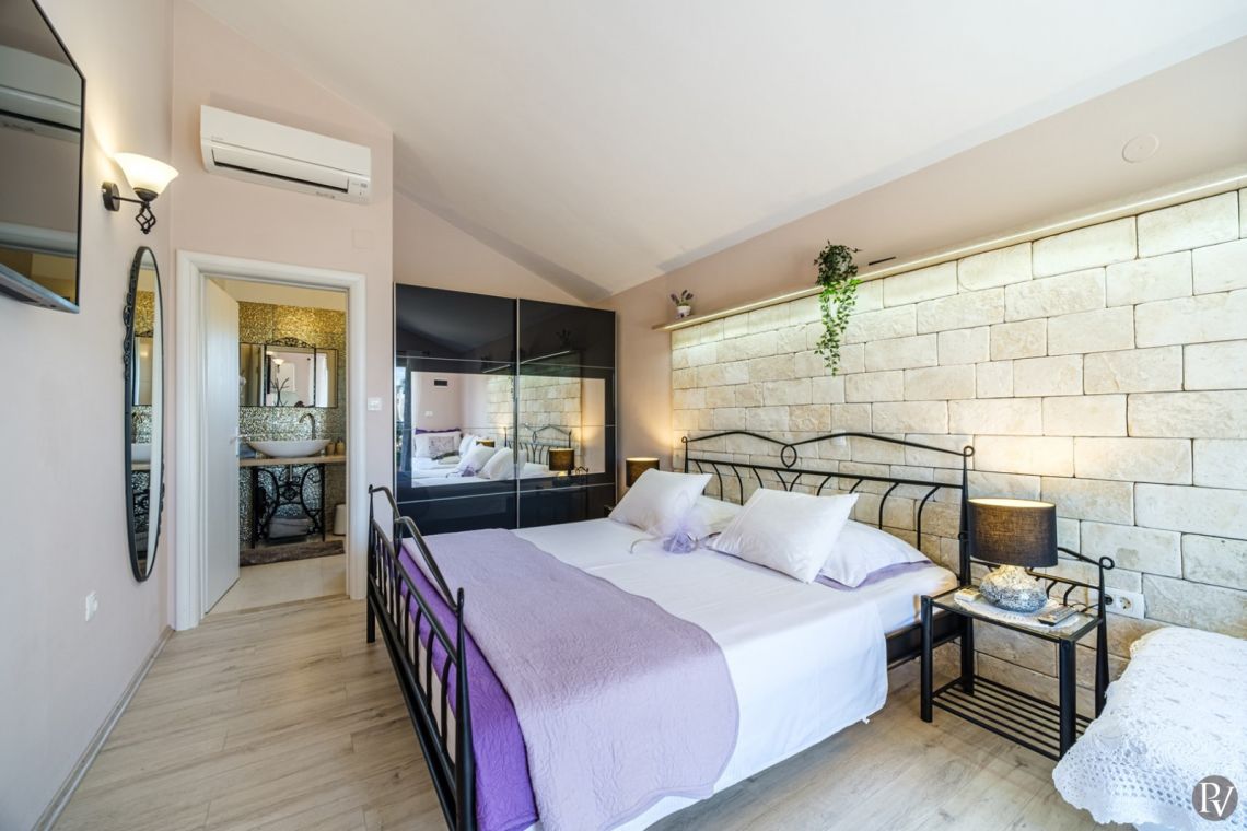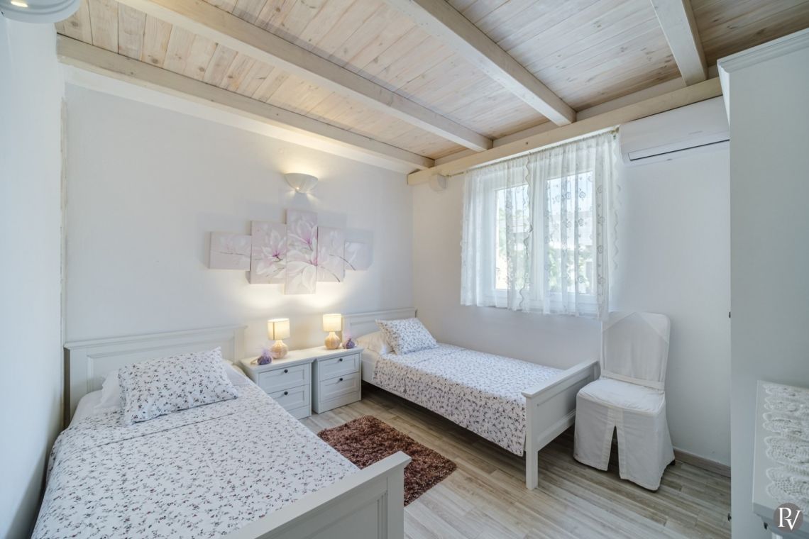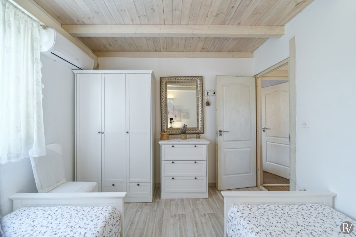 The villa accommodates up to 8 + 2 guests and is designed as two connected residential units, offering both shared living areas and private spaces. This layout is perfect for larger families or groups of friends. The interiors include fully equipped kitchens, comfortable living areas, and air conditioning throughout, ensuring a pleasant stay with all modern comforts in a traditional Mediterranean setting.