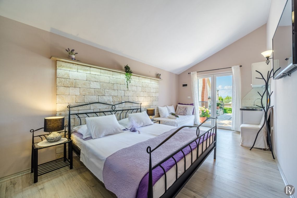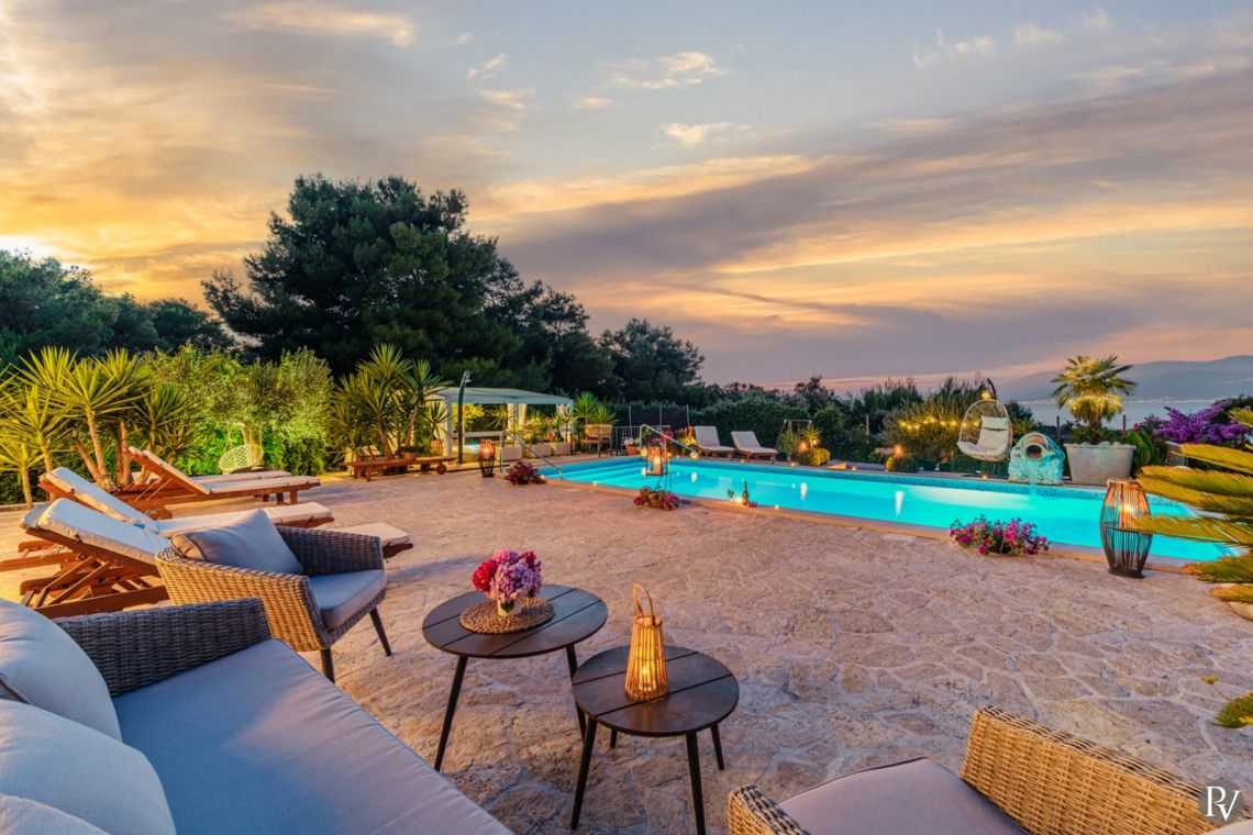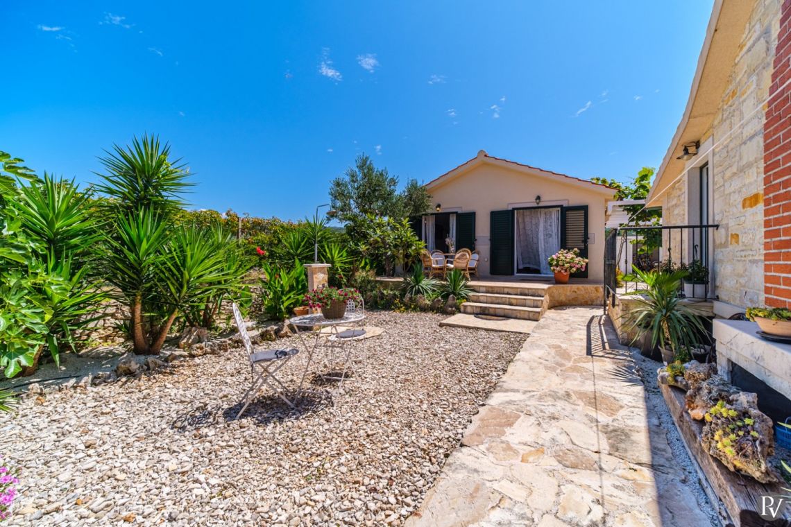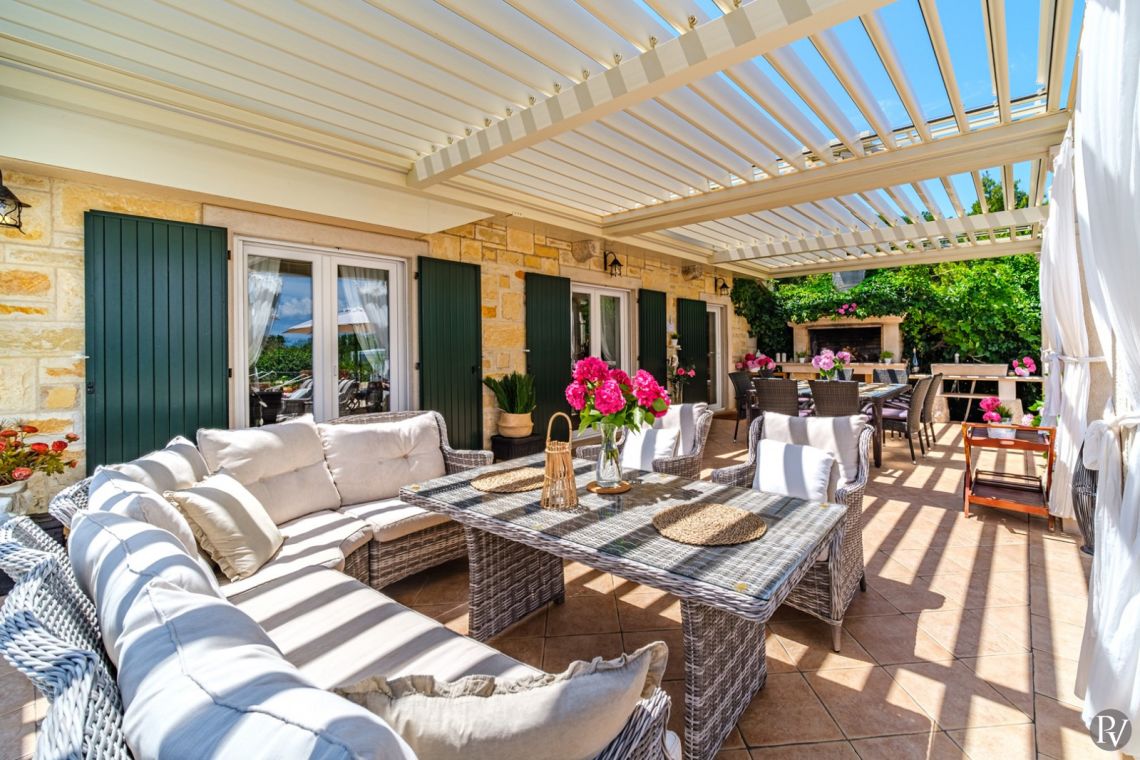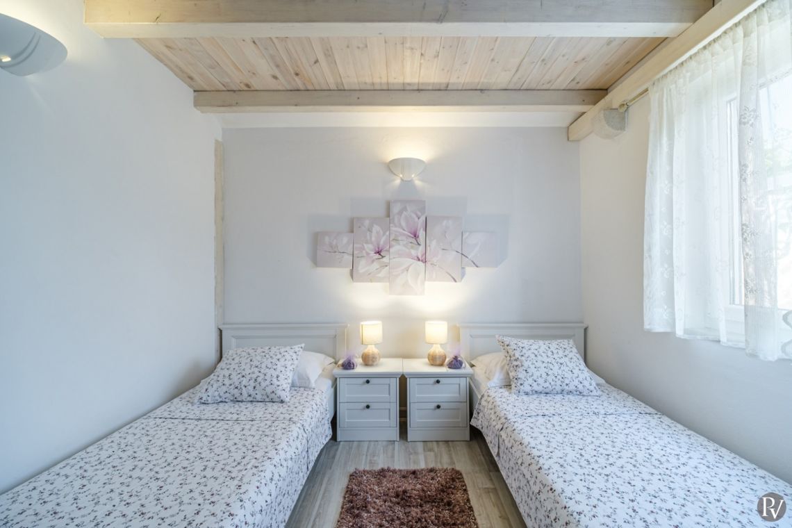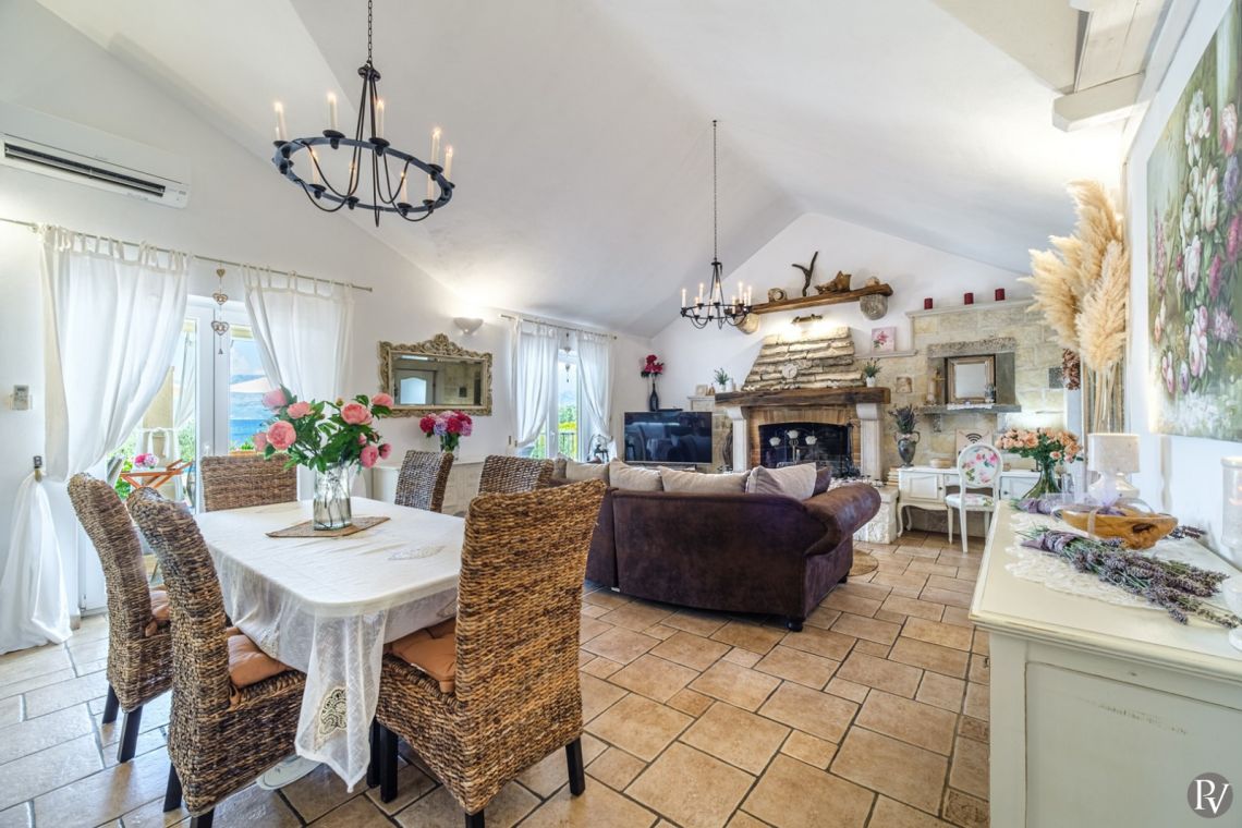The villa accommodates up to 8 + 2 guests and is designed as two connected residential units, offering both shared living areas and private spaces. This layout is perfect for larger families or groups of friends. The interiors include fully equipped kitchens, comfortable living areas, and air conditioning throughout, ensuring a pleasant stay with all modern comforts in a traditional Mediterranean setting.