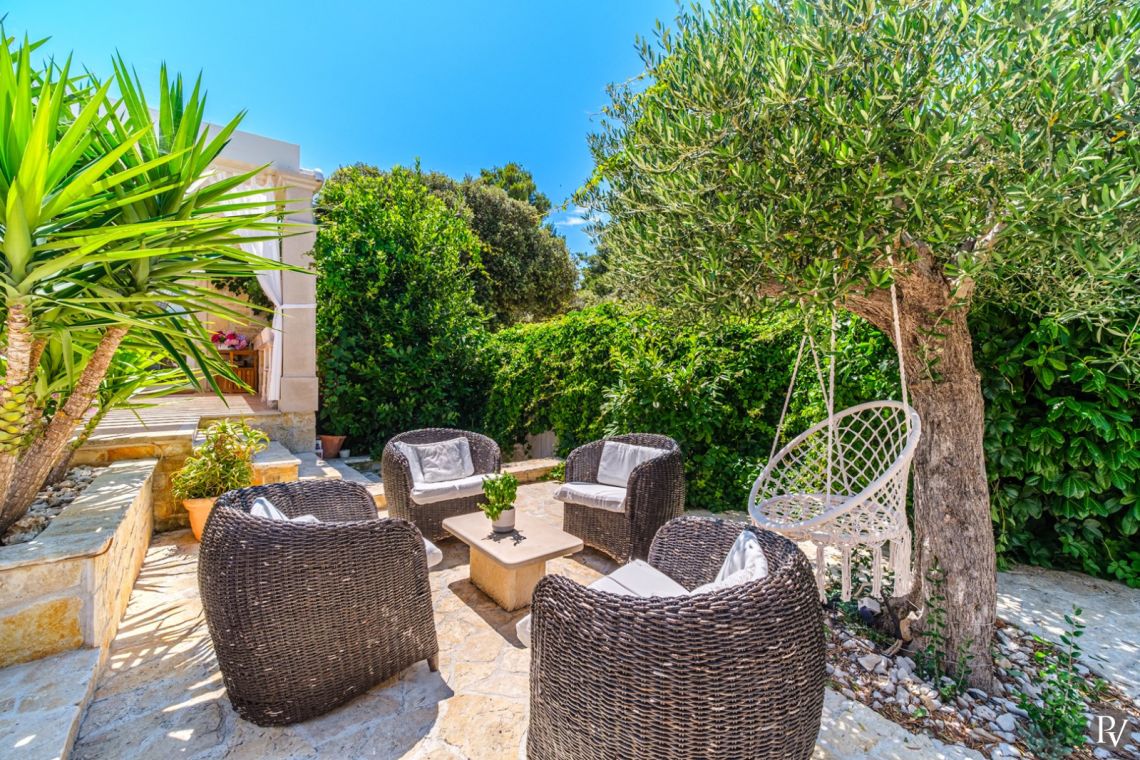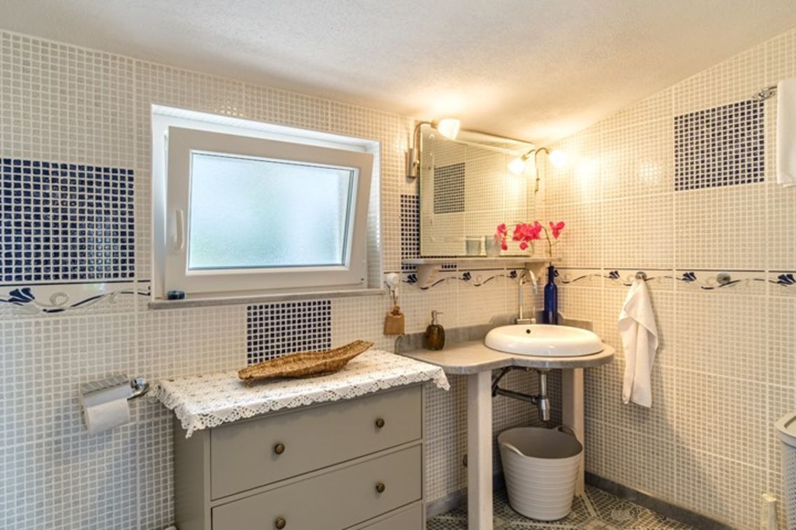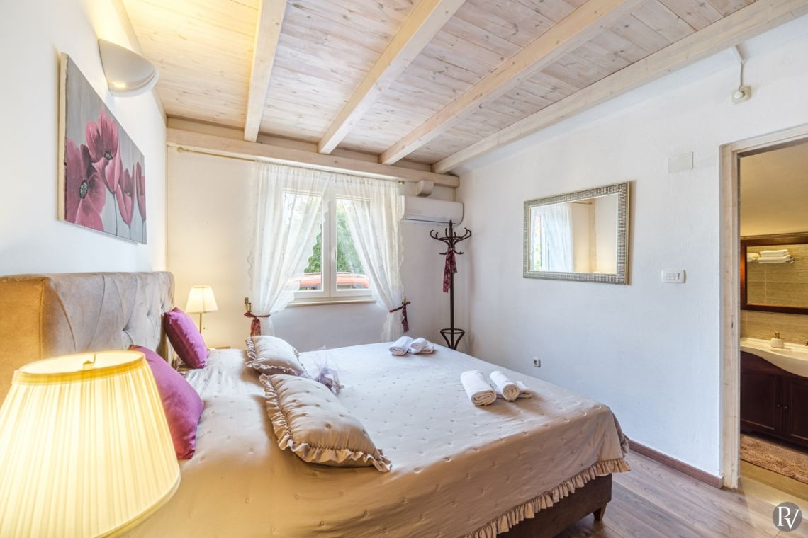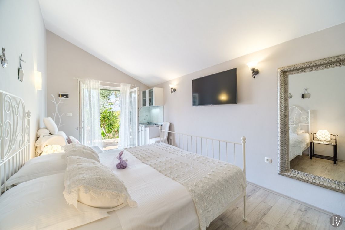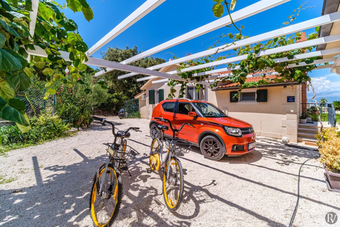 The villa accommodates up to 8 + 2 guests and is designed as two connected residential units, offering both shared living areas and private spaces. This layout is perfect for larger families or groups of friends. The interiors include fully equipped kitchens, comfortable living areas, and air conditioning throughout, ensuring a pleasant stay with all modern comforts in a traditional Mediterranean setting.