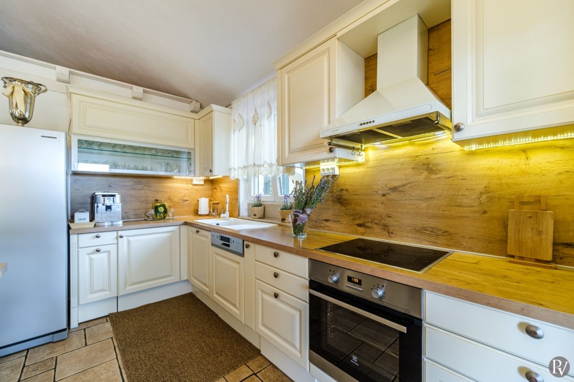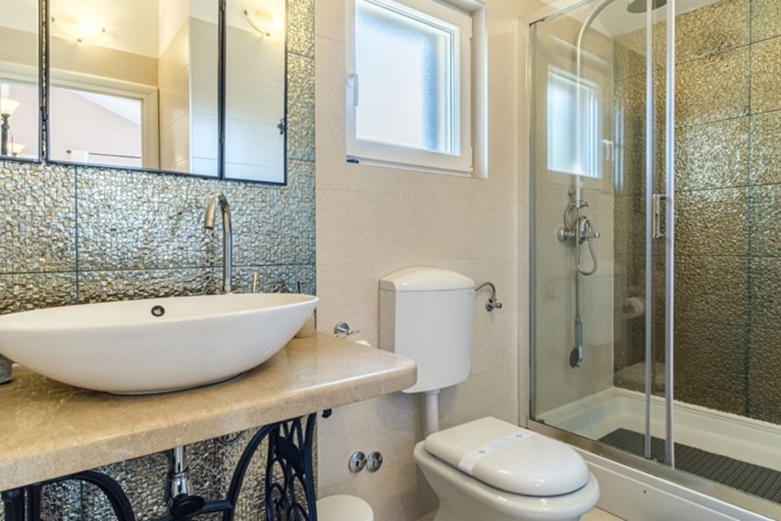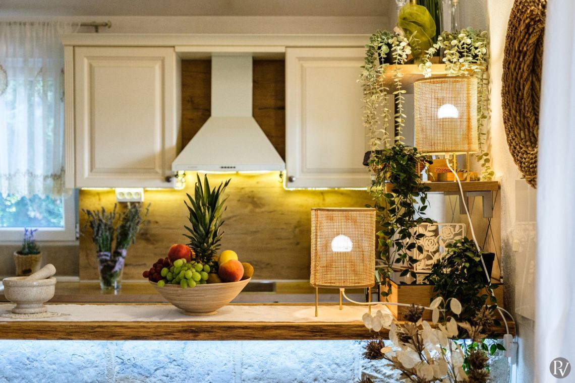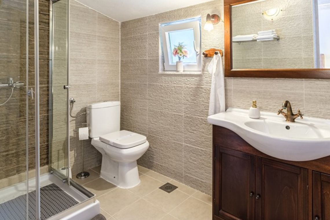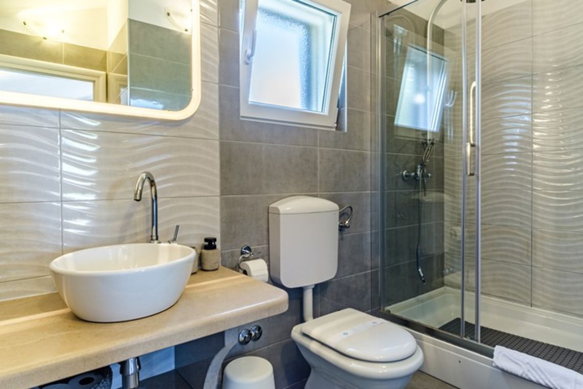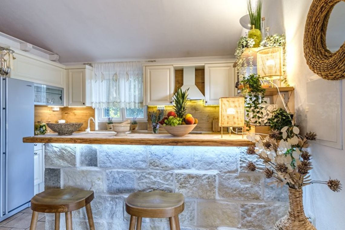 The villa accommodates up to 8 + 2 guests and is designed as two connected residential units, offering both shared living areas and private spaces. This layout is perfect for larger families or groups of friends. The interiors include fully equipped kitchens, comfortable living areas, and air conditioning throughout, ensuring a pleasant stay with all modern comforts in a traditional Mediterranean setting.