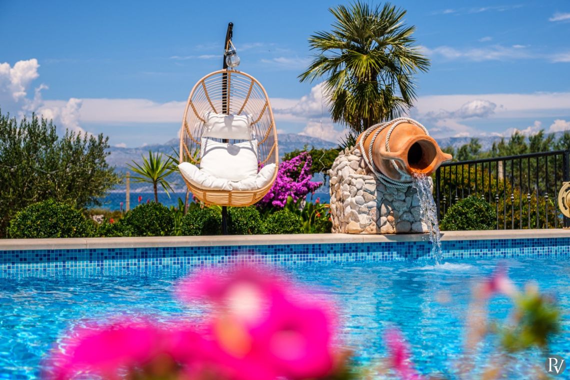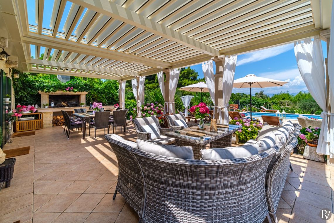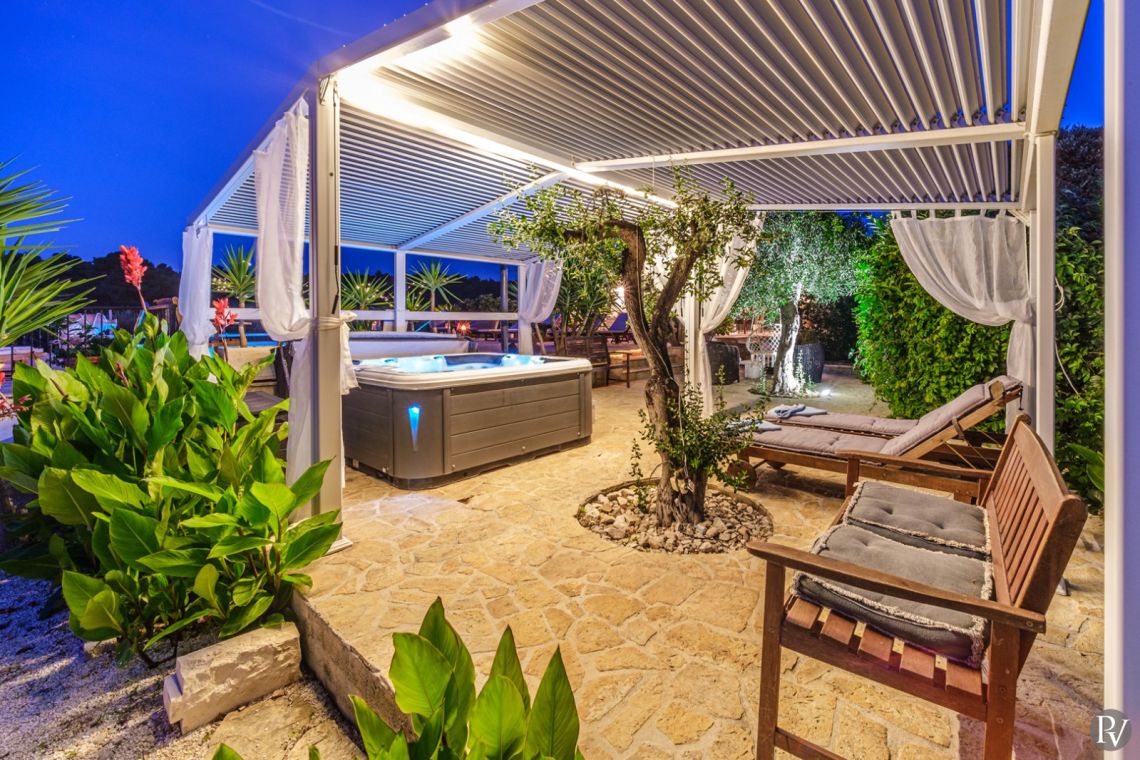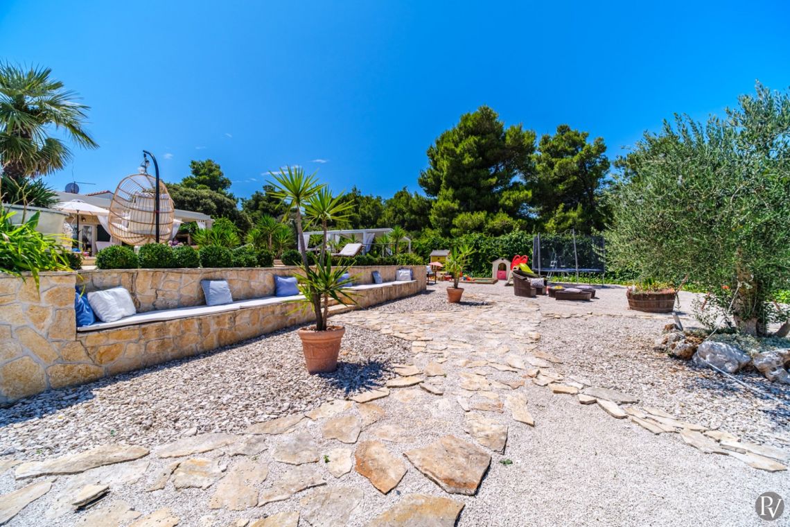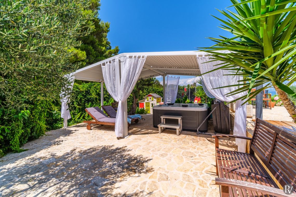The outdoor area is the highlight of the villa, featuring a private heated swimming pool (approx. 4 x 10 m) set on a spacious sun deck with loungers and umbrellas. An outdoor jacuzzi offers additional relaxation, while a covered terrace with a dining area and traditional Dalmatian fireplace and grill is perfect for al fresco meals. The 1000 m² beachfront plot also includes a children’s playground and direct access to the pebble beach, just steps away, creating an ideal setting for a true seaside holiday.