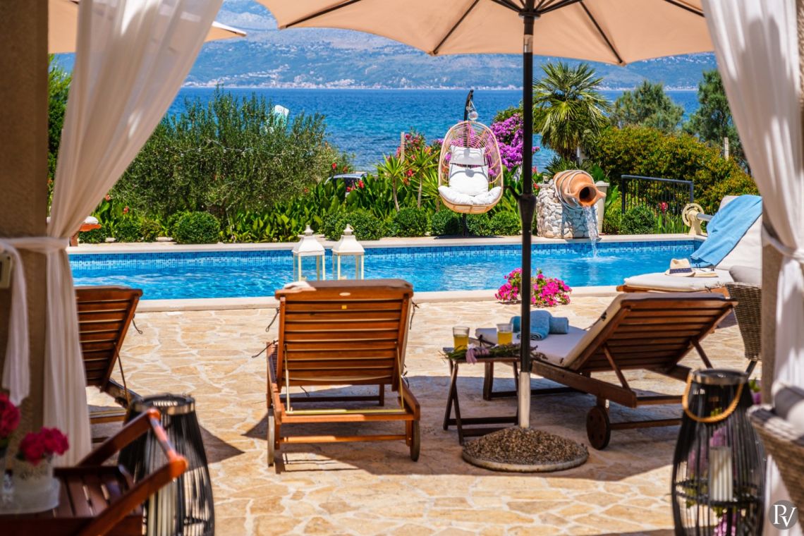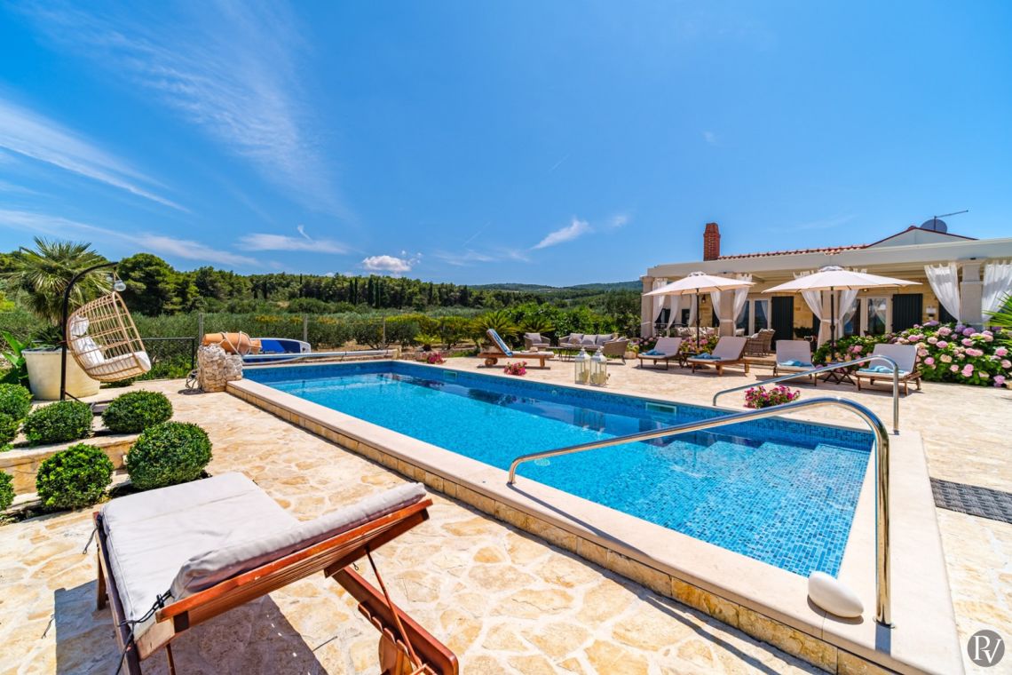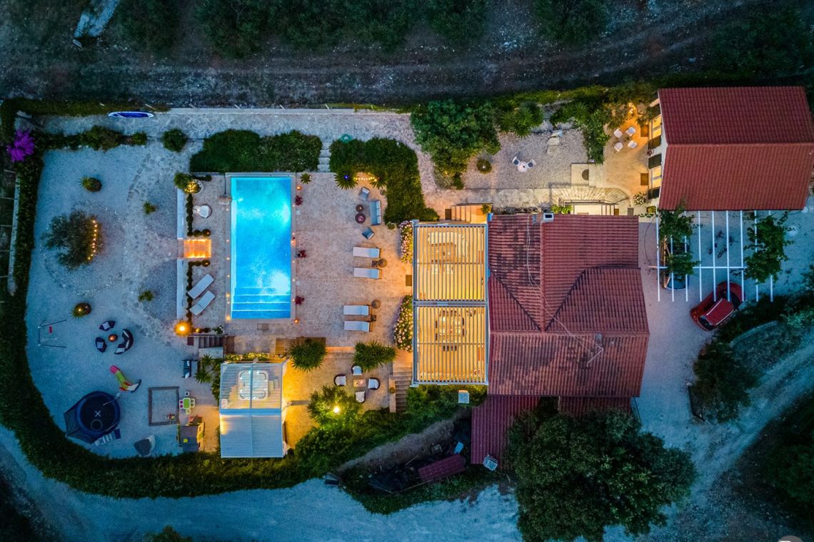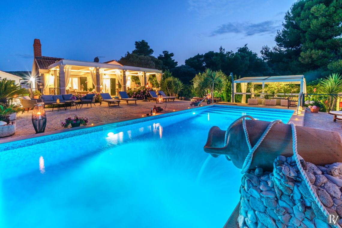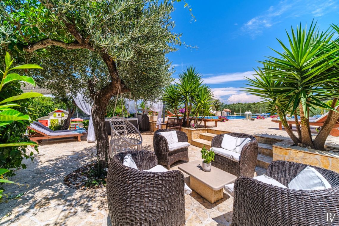 The outdoor area is the highlight of the villa, featuring a private heated swimming pool (approx. 4 x 10 m) set on a spacious sun deck with loungers and umbrellas. An outdoor jacuzzi offers additional relaxation, while a covered terrace with a dining area and traditional Dalmatian fireplace and grill is perfect for al fresco meals. The 1000 m² beachfront plot also includes a children’s playground and direct access to the pebble beach, just steps away, creating an ideal setting for a true seaside holiday.