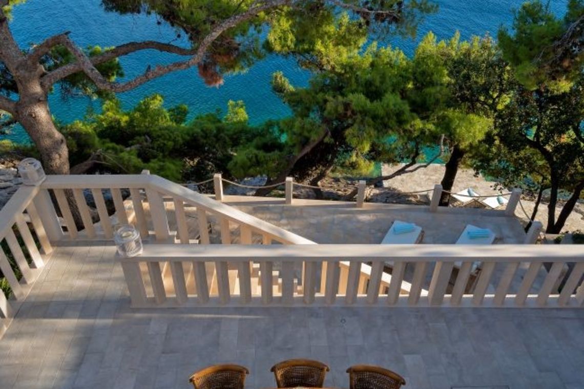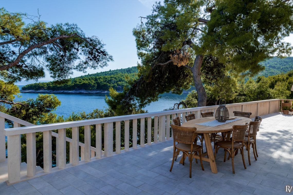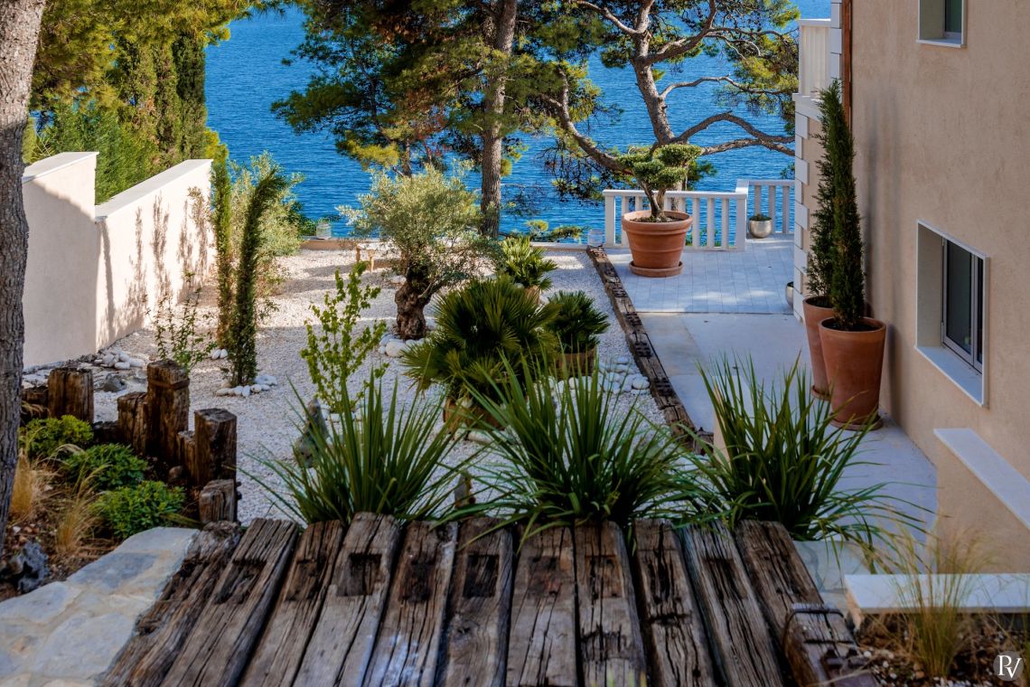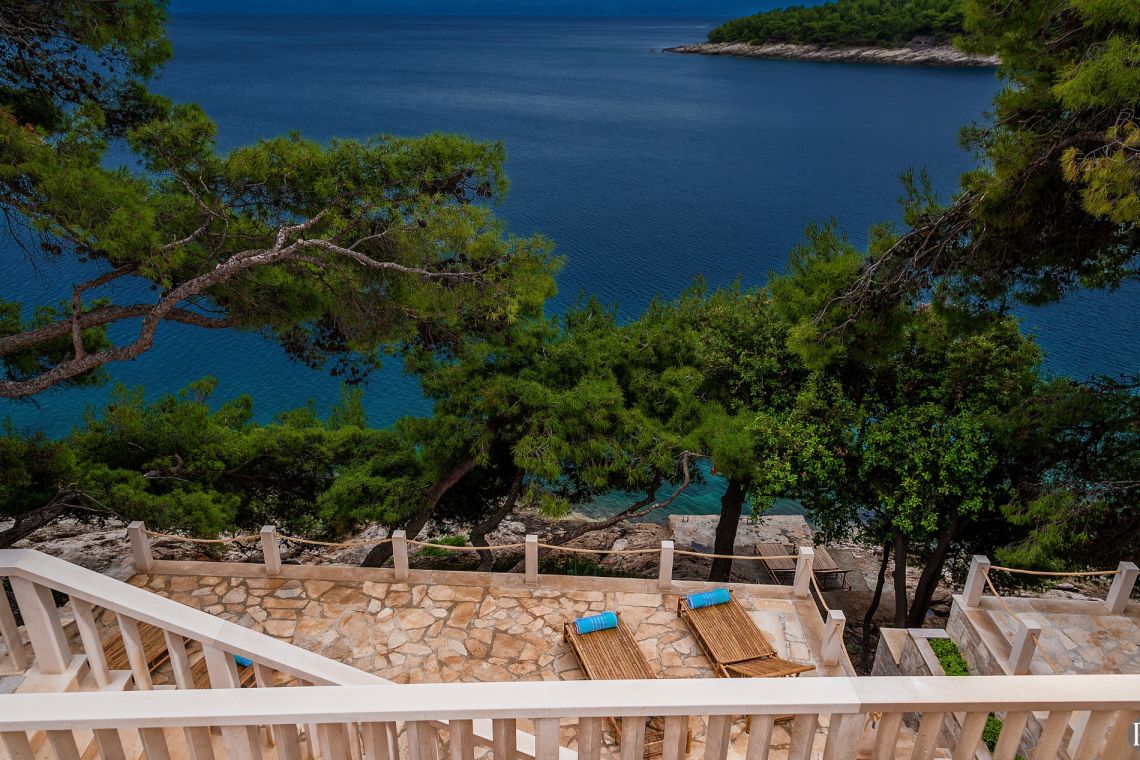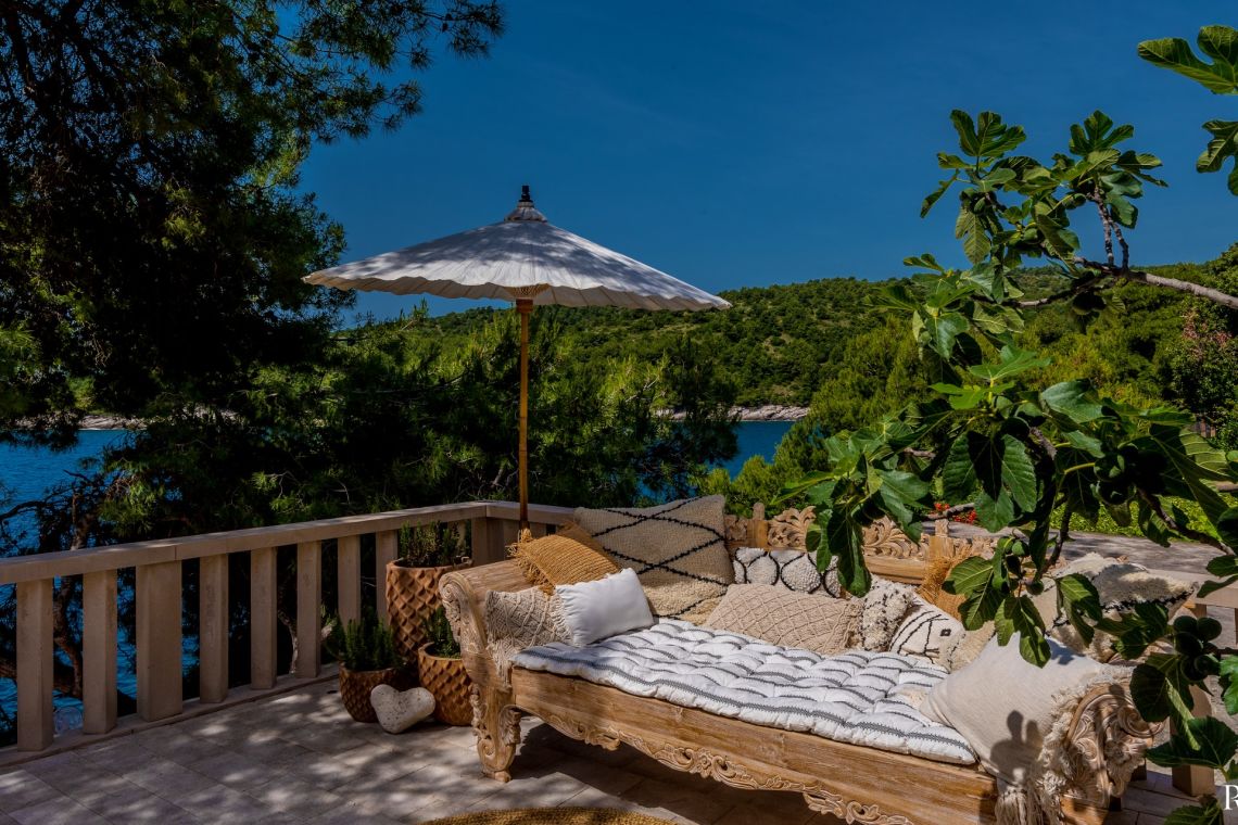 The exterior of Vila Obala Mira is designed to maximise its exceptional seaside location. The villa boasts three traditional stone terraces set among Mediterranean vegetation, offering multiple spaces for relaxation and dining. From the lower terrace, guests can step almost directly into the turquoise sea.