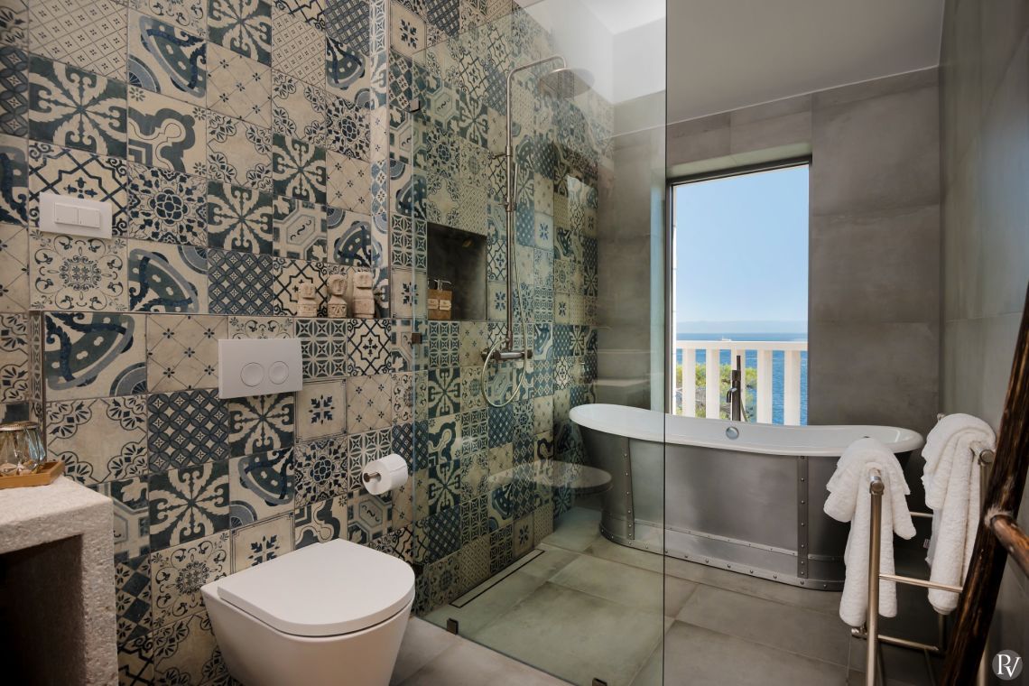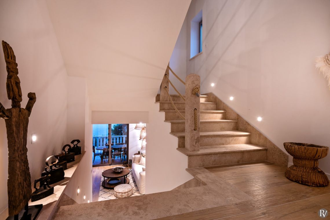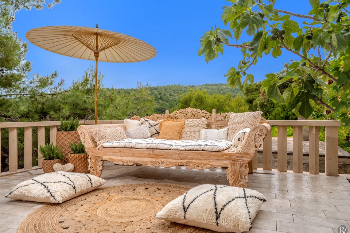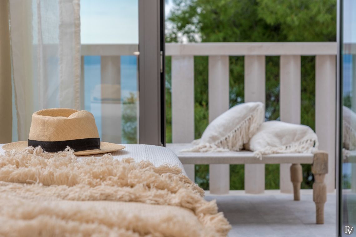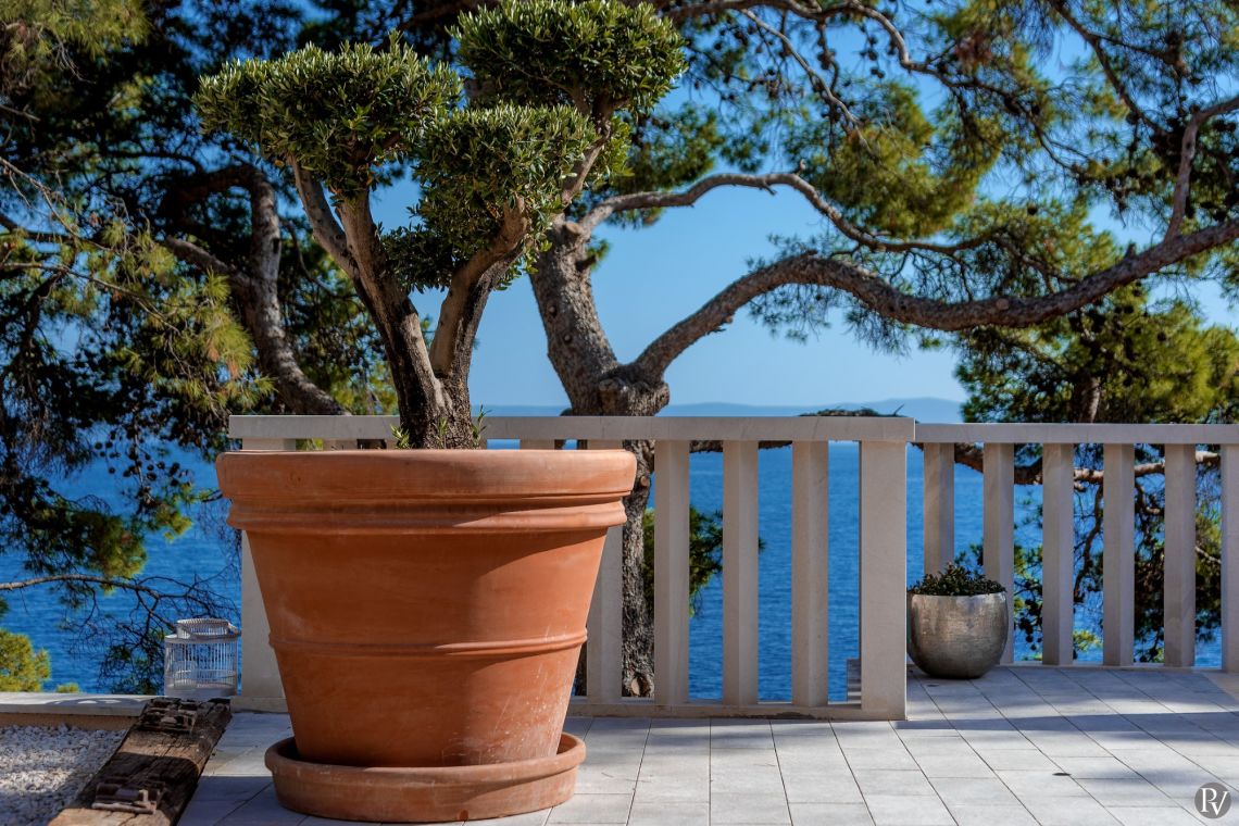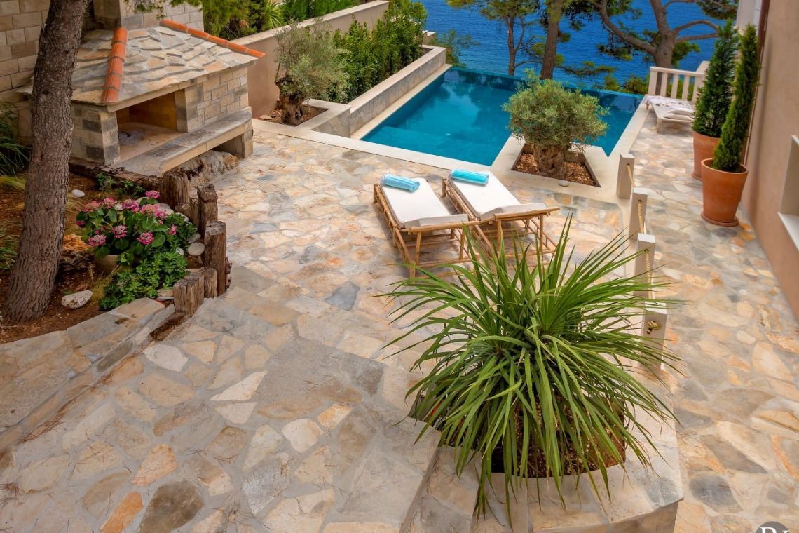 The exterior of Vila Obala Mira is designed to maximise its exceptional seaside location. The villa boasts three traditional stone terraces set among Mediterranean vegetation, offering multiple spaces for relaxation and dining. From the lower terrace, guests can step almost directly into the turquoise sea.