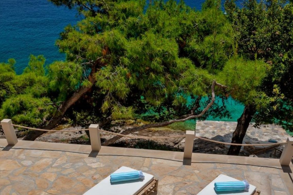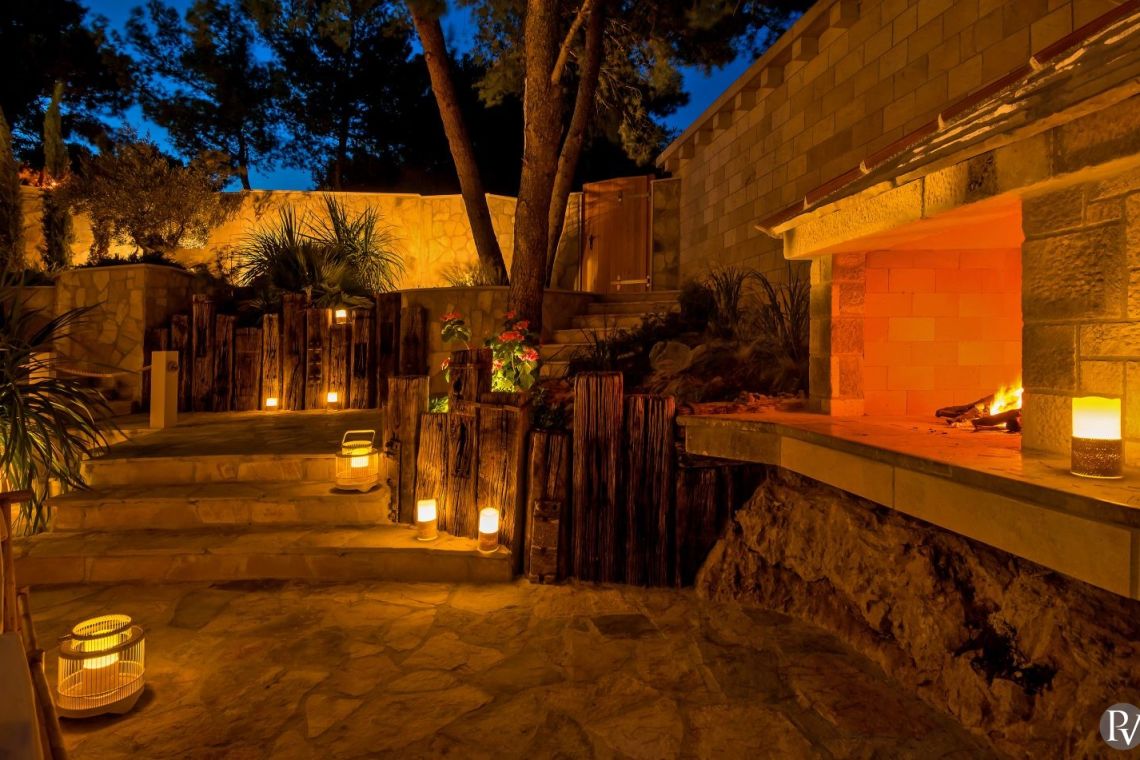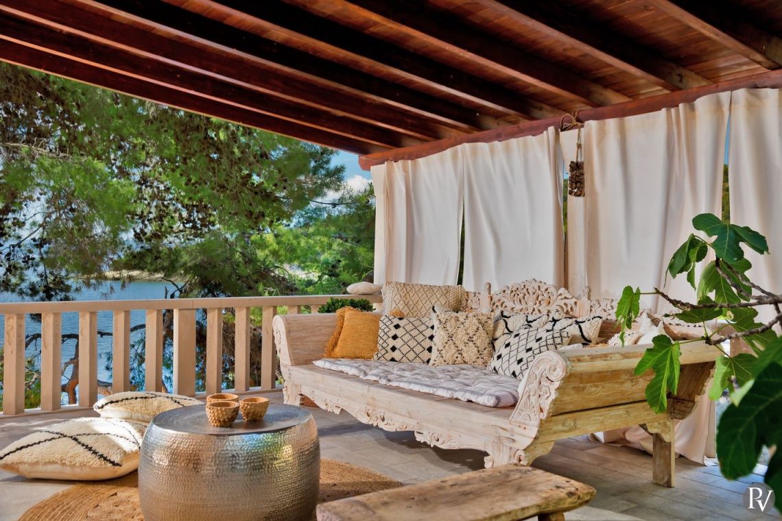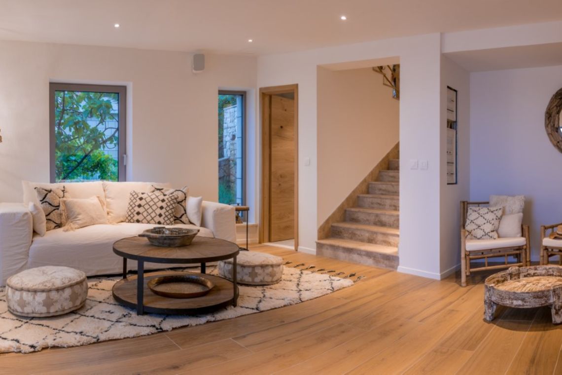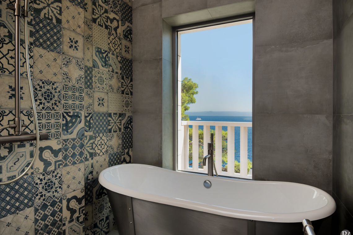 The exterior of Vila Obala Mira is designed to maximise its exceptional seaside location. The villa boasts three traditional stone terraces set among Mediterranean vegetation, offering multiple spaces for relaxation and dining. From the lower terrace, guests can step almost directly into the turquoise sea.