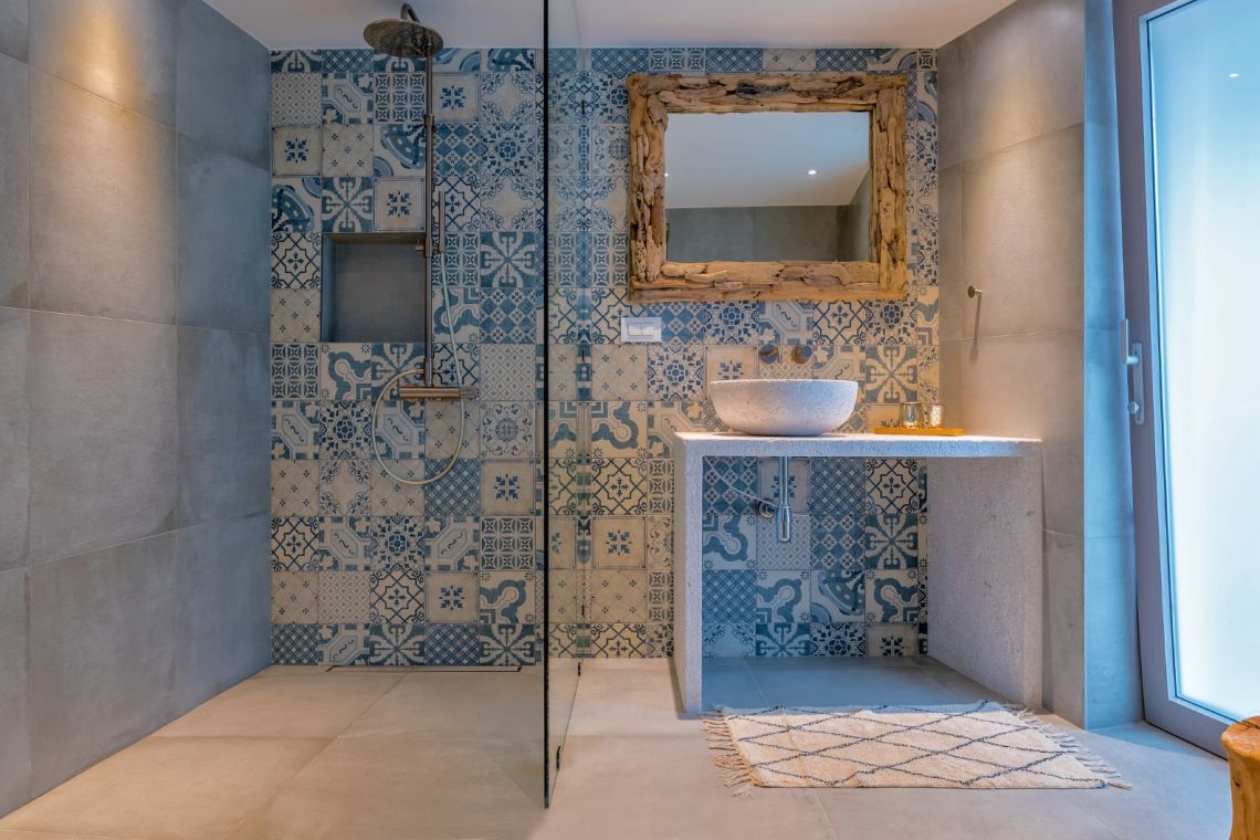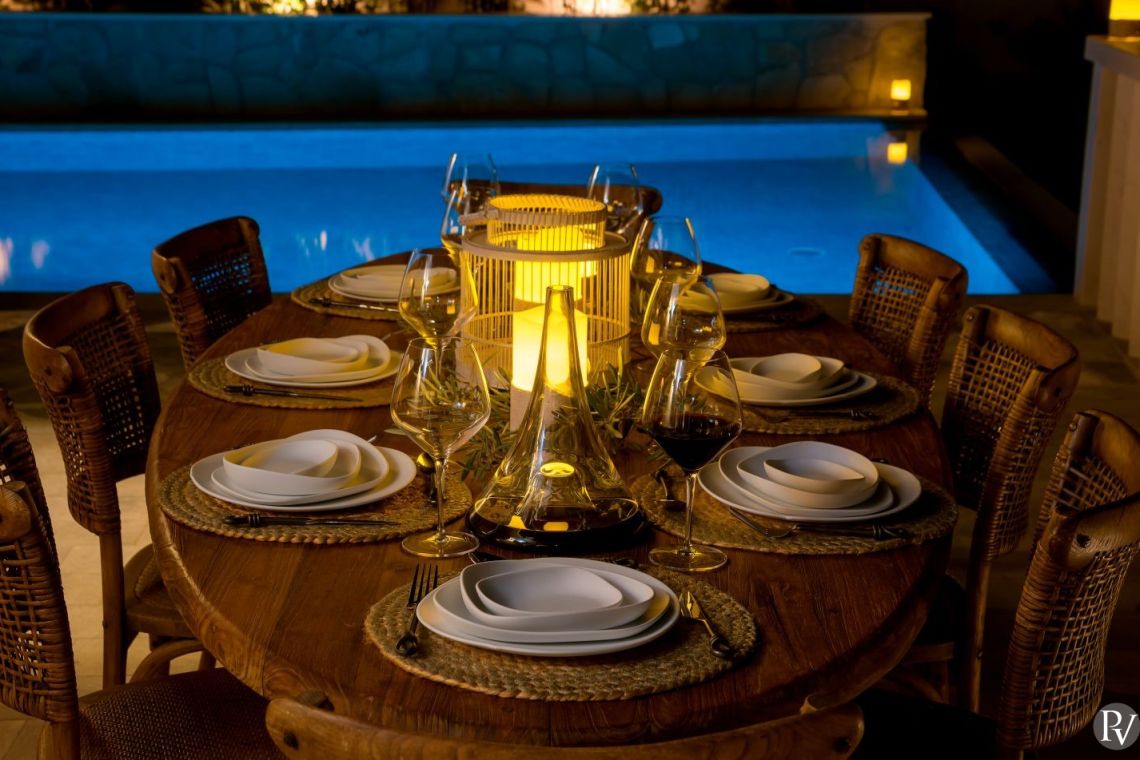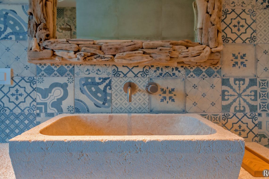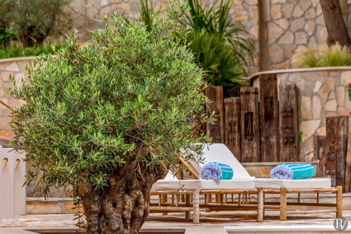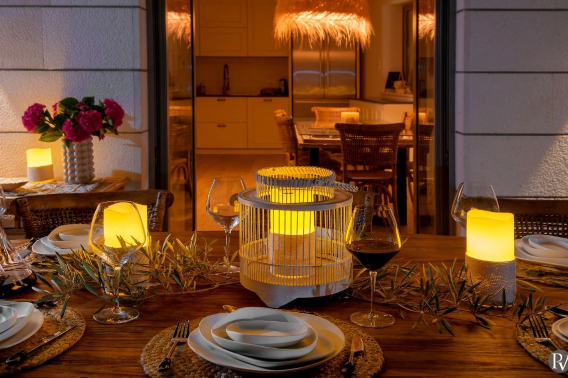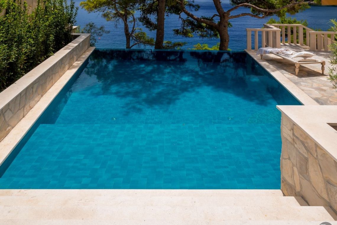 The exterior of Vila Obala Mira is designed to maximise its exceptional seaside location. The villa boasts three traditional stone terraces set among Mediterranean vegetation, offering multiple spaces for relaxation and dining. From the lower terrace, guests can step almost directly into the turquoise sea.