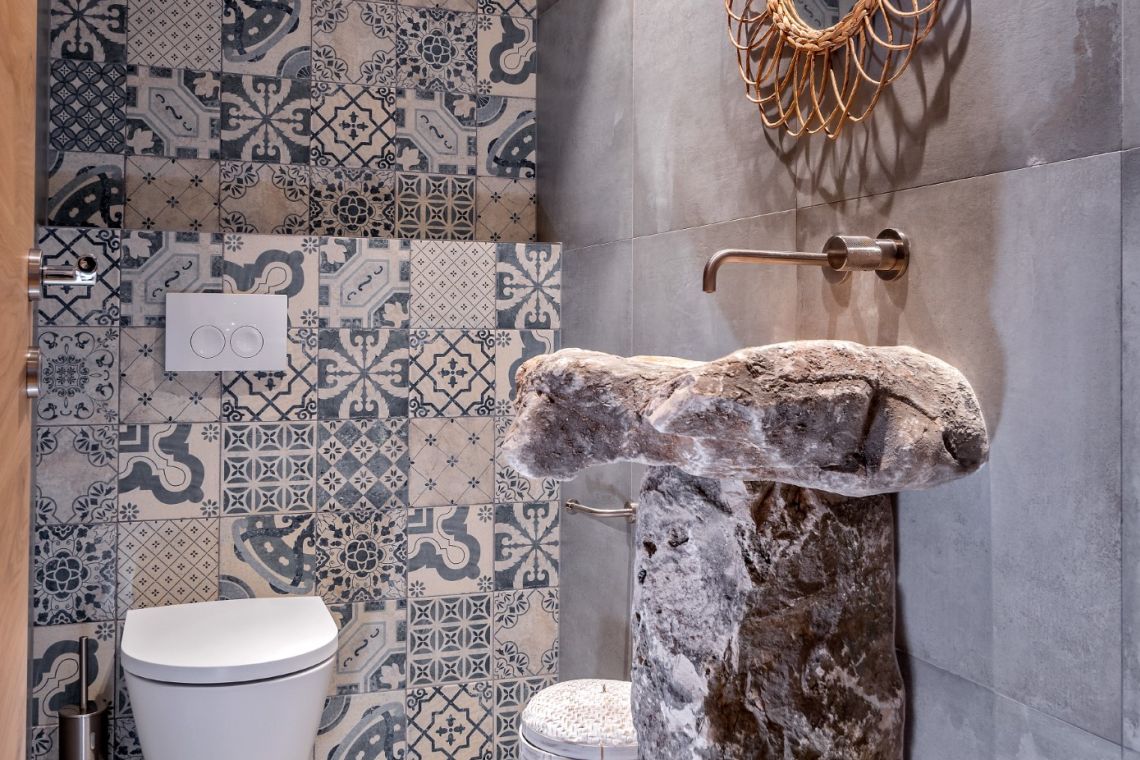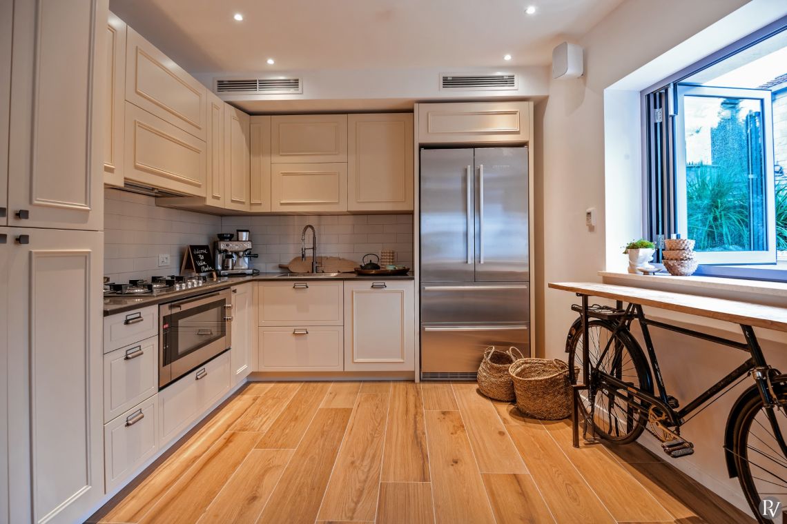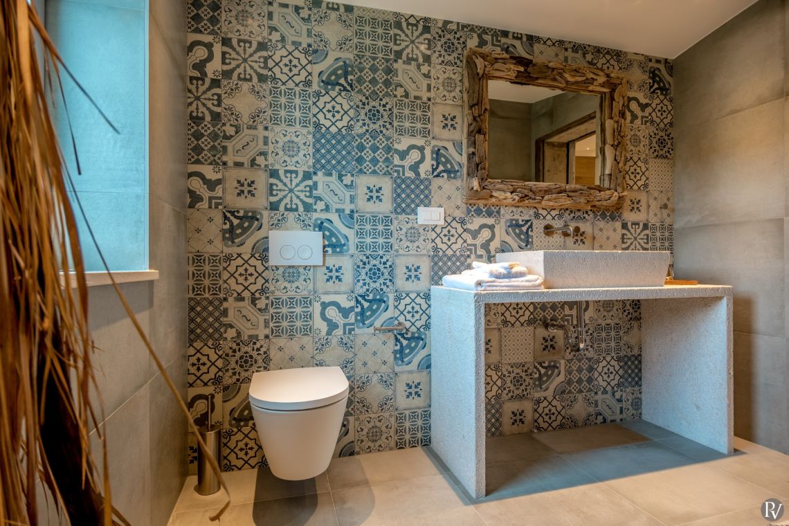 The ground floor features a spacious and elegantly designed living area with direct access to the main terrace, offering stunning sea views. This level also includes a guest toilet and a fully equipped, high-end kitchen fitted with premium appliances and bespoke handmade dining furniture.