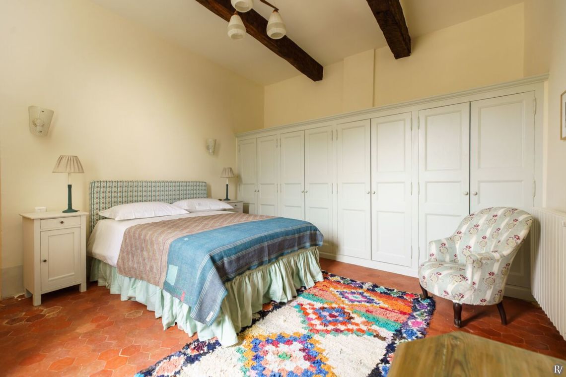 The master bedroom is located on the first floor and features a king-size bed, television, and an en-suite bathroom with a separate shower and WC. Also on the first floor is a twin bedroom with television and direct access to a furnished terrace overlooking the pool and countryside, served by a separate shower room with WC.