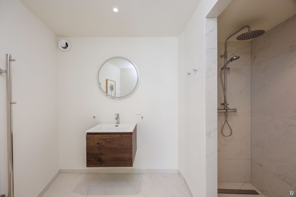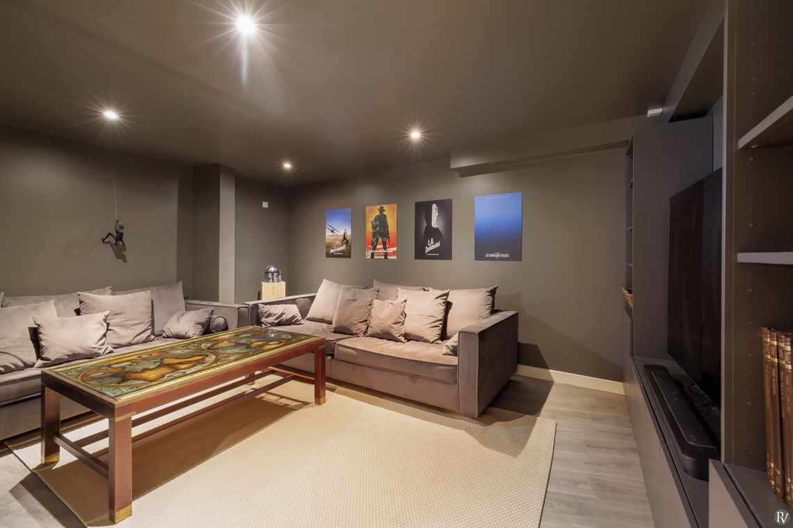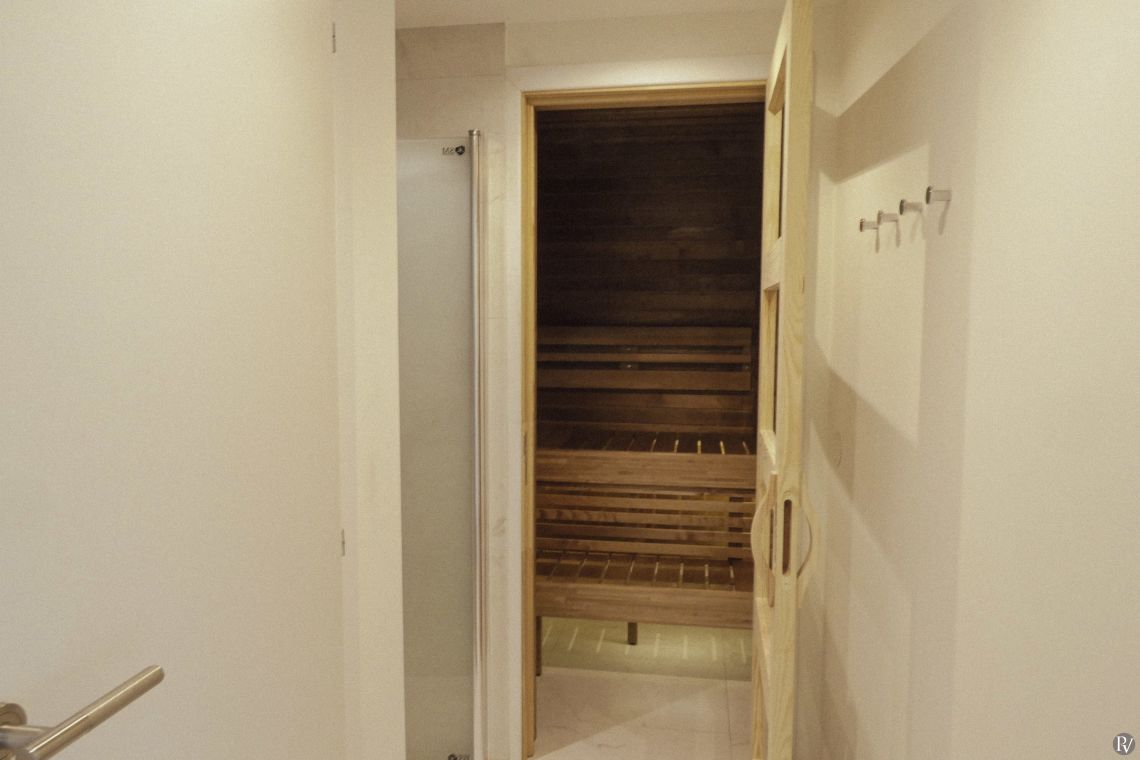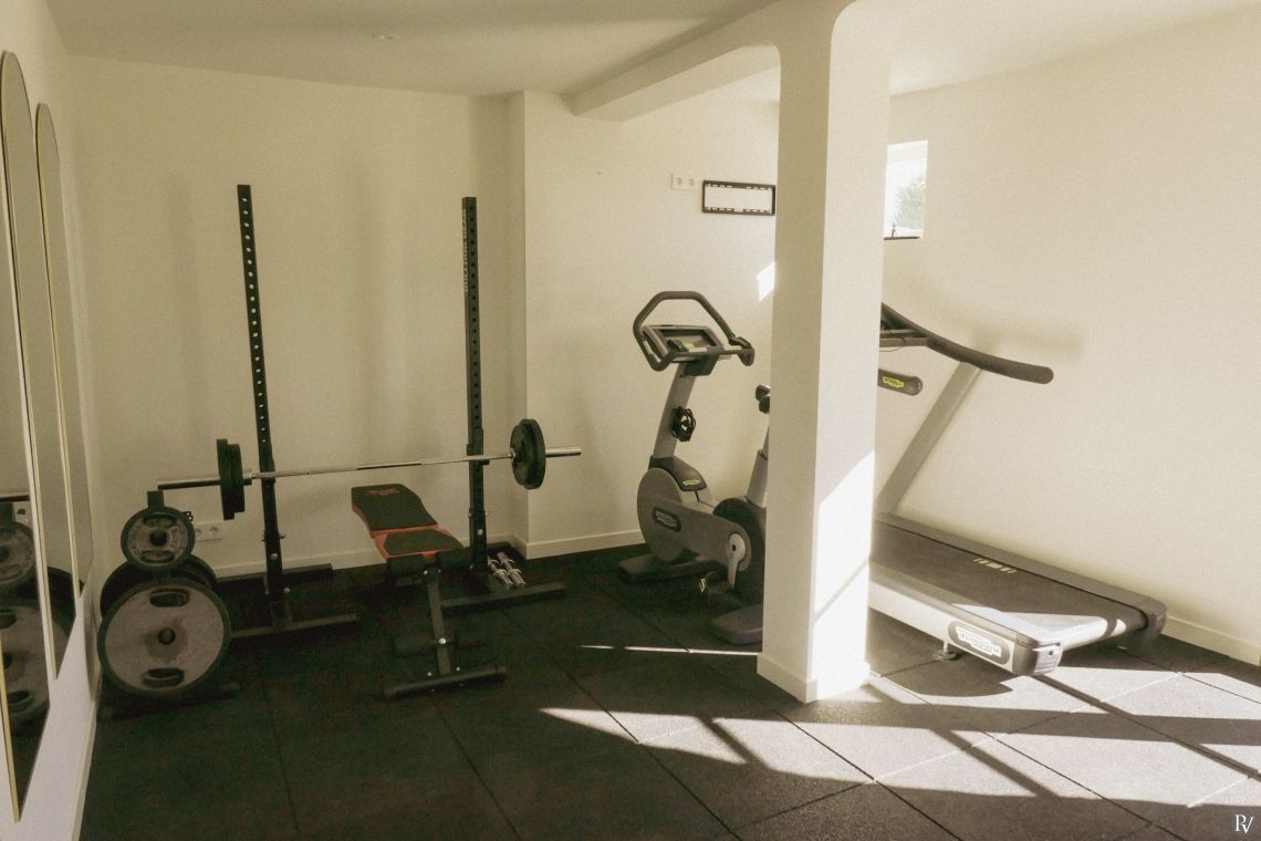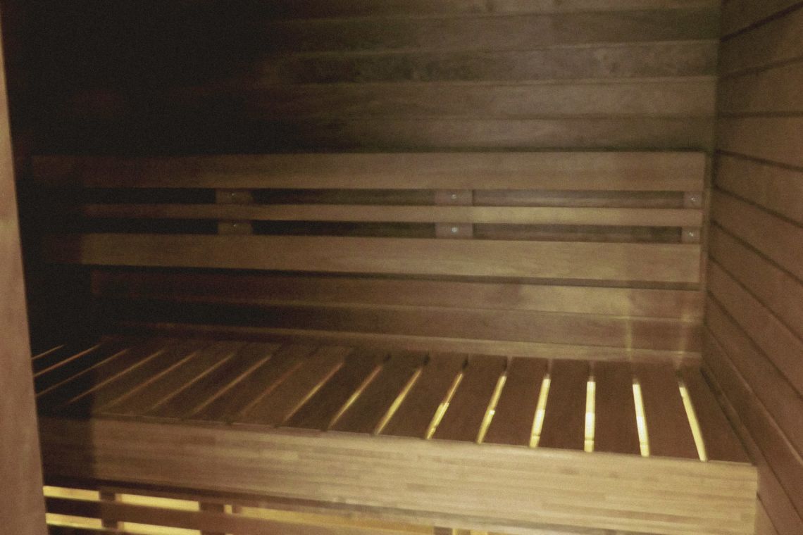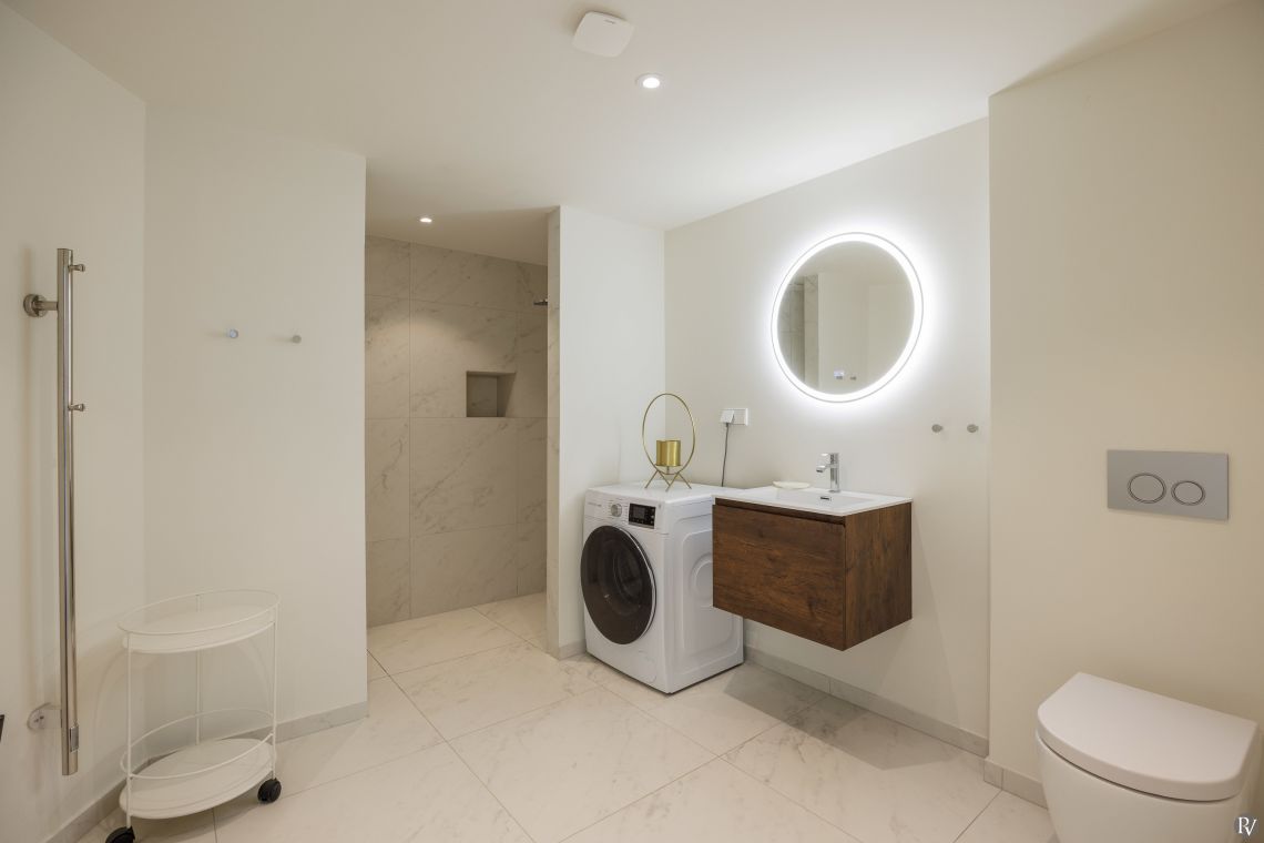 Additional facilities on this level include a convenient kitchenette with access to a garden terrace and an ensuite bathroom. Guests can also enjoy a fully equipped gym with a treadmill and cycling machine, a relaxing sauna room, and a cinema lounge for home entertainment. A utility room adds further practicality for everyday needs.