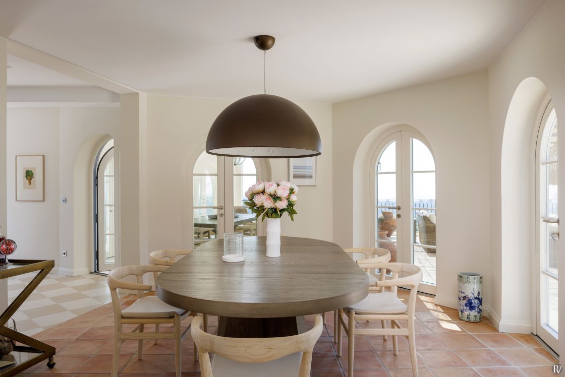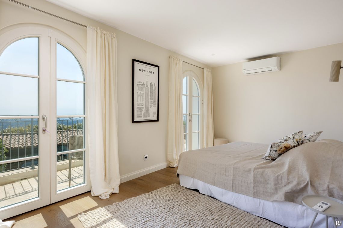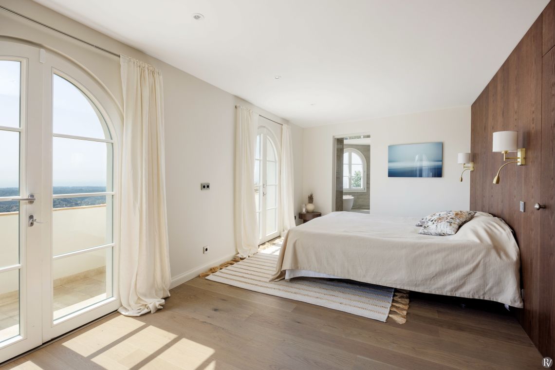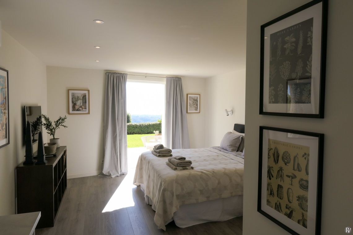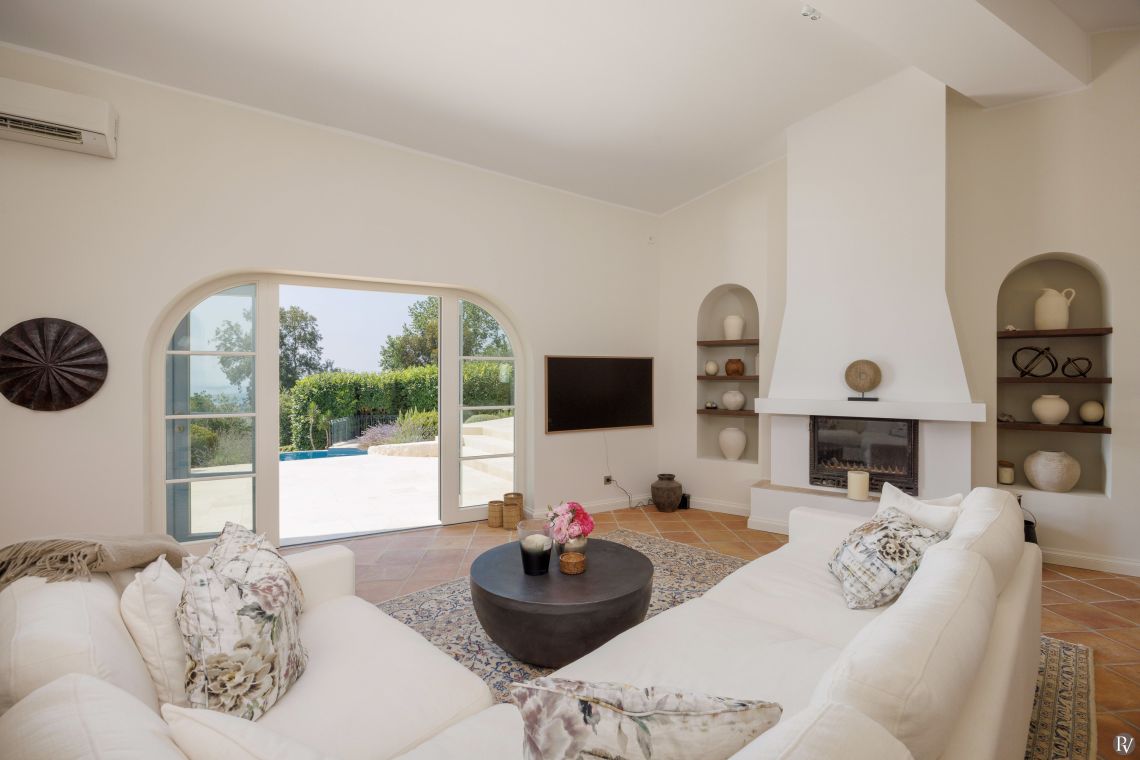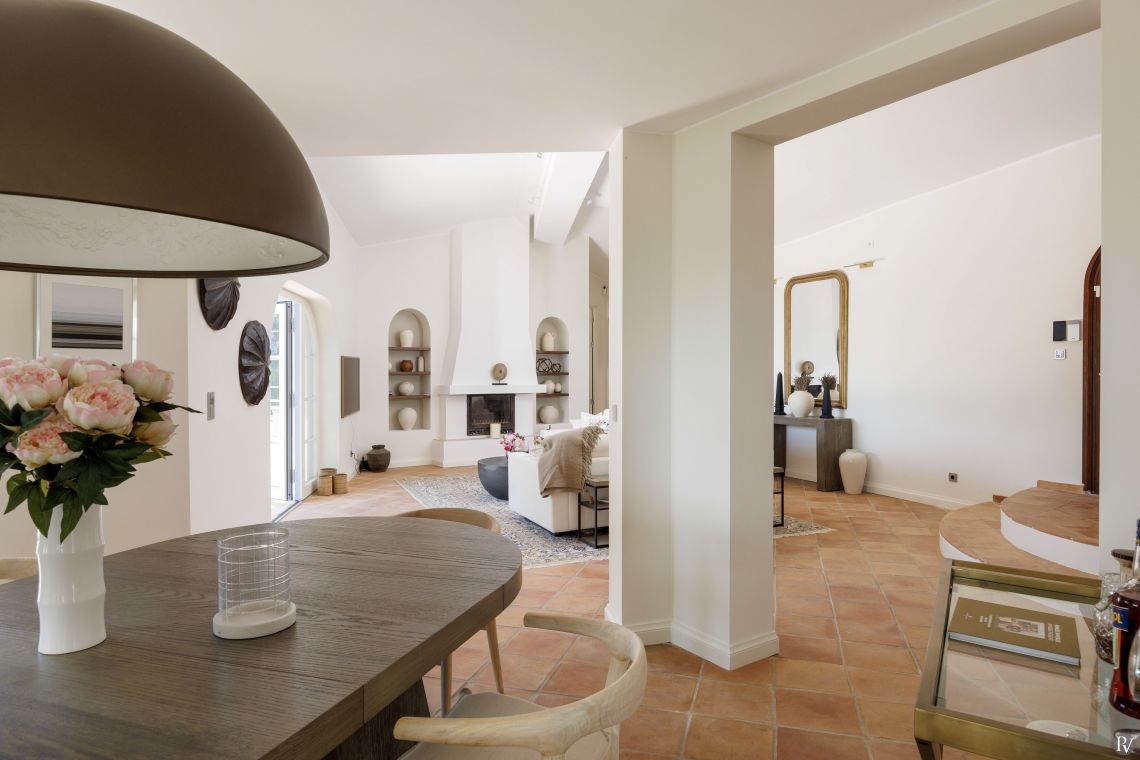 This villa beautifully combines French charm with Nordic inspired design, offering sweeping views of the sea and countryside. It features an infinity pool, gym, sauna, and six ensuite bedrooms spread across three levels. The interiors are bright, elegant, and spacious, with an open plan living area complete with a fireplace and direct access to the pool, a dining area, and a fully equipped main kitchen, along with a smaller secondary kitchen for added convenience. A utility room and guest WC provide practicality for everyday living.