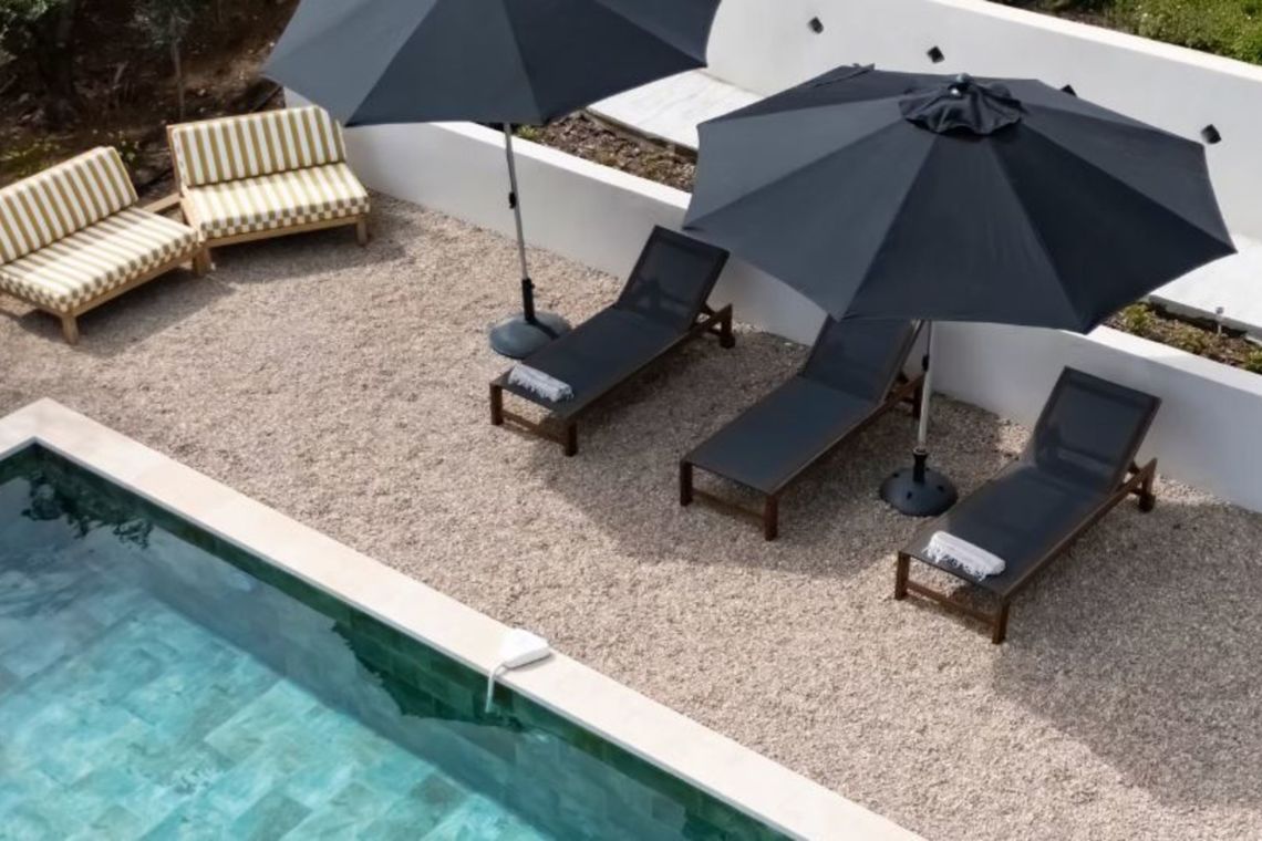 The villa is set within beautifully terraced grounds and features a heatable swimming pool with Roman steps. A large terrace provides the perfect space for al fresco dining, complemented by comfortable outdoor lounge areas, sun loungers, and umbrellas for relaxing in the Mediterranean sun.