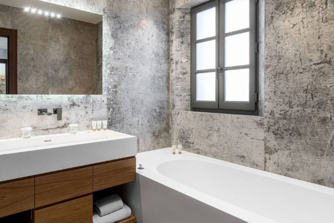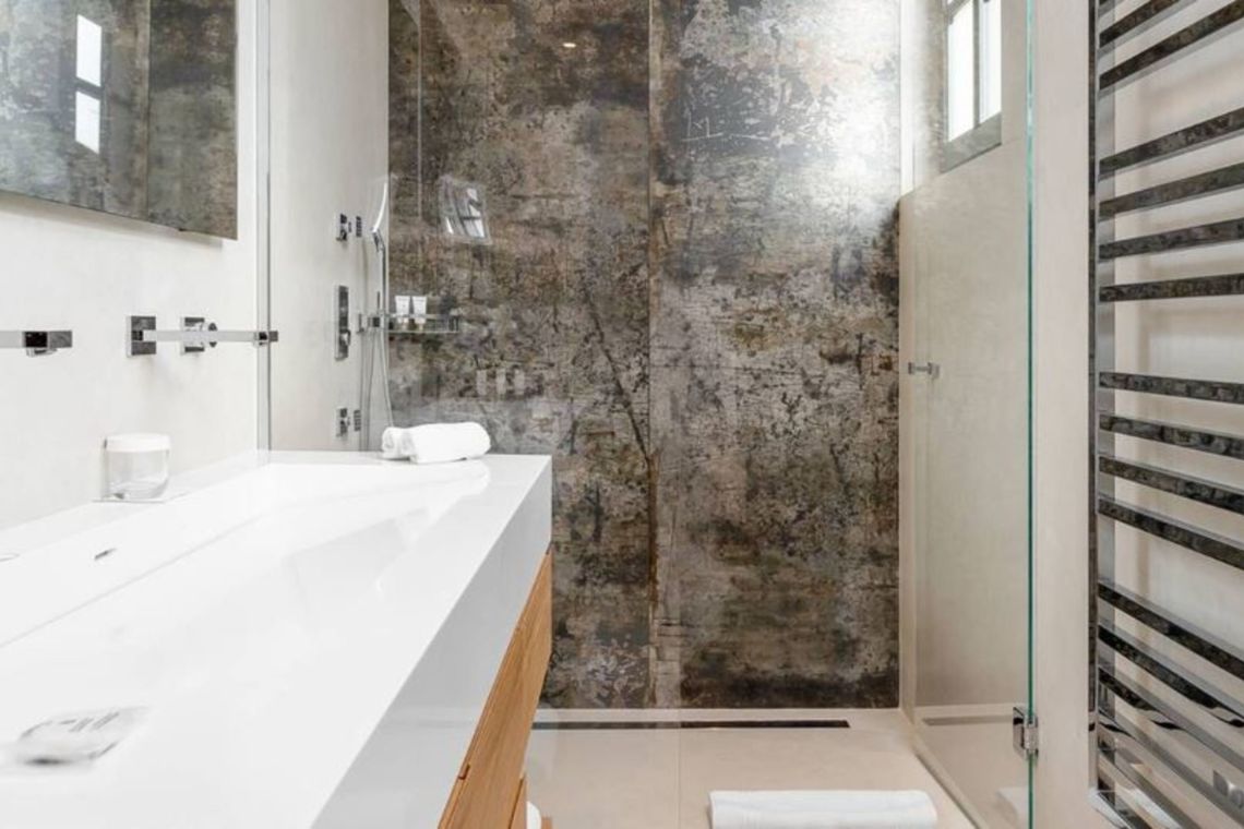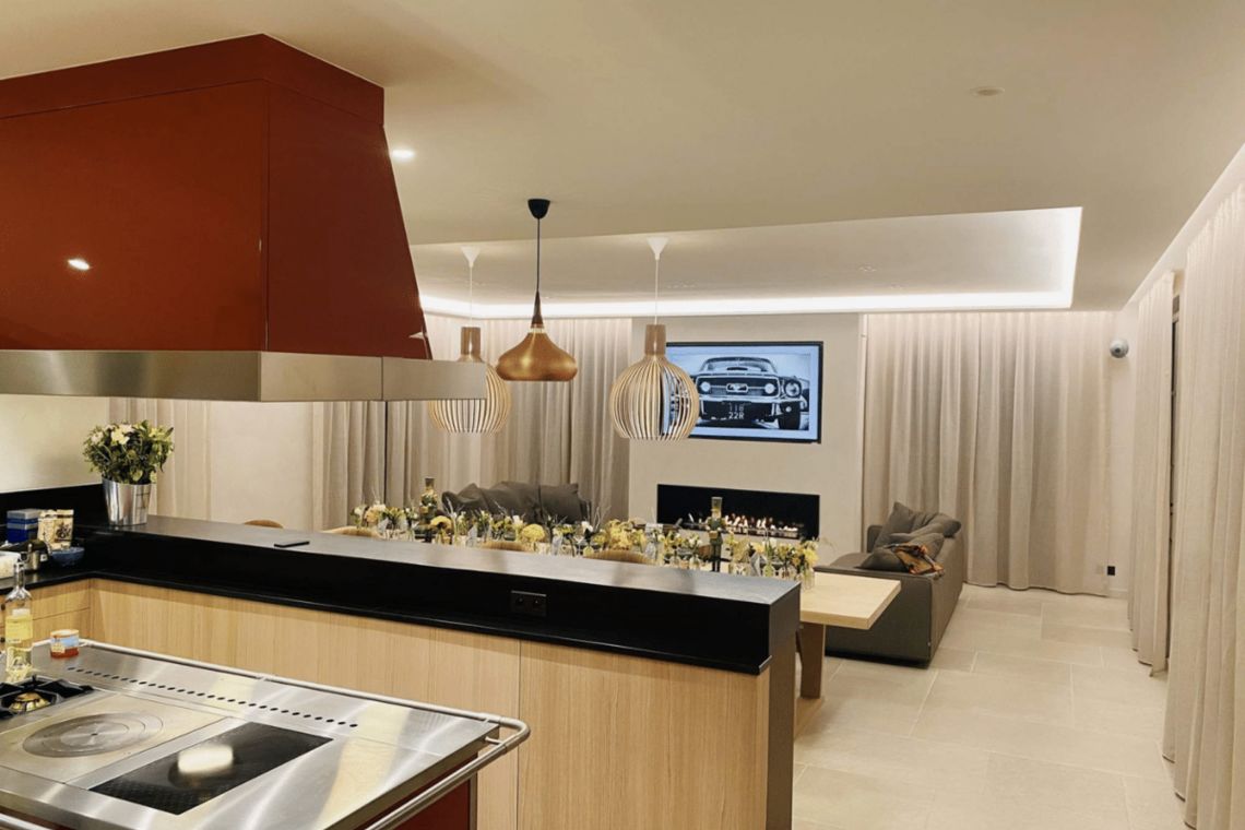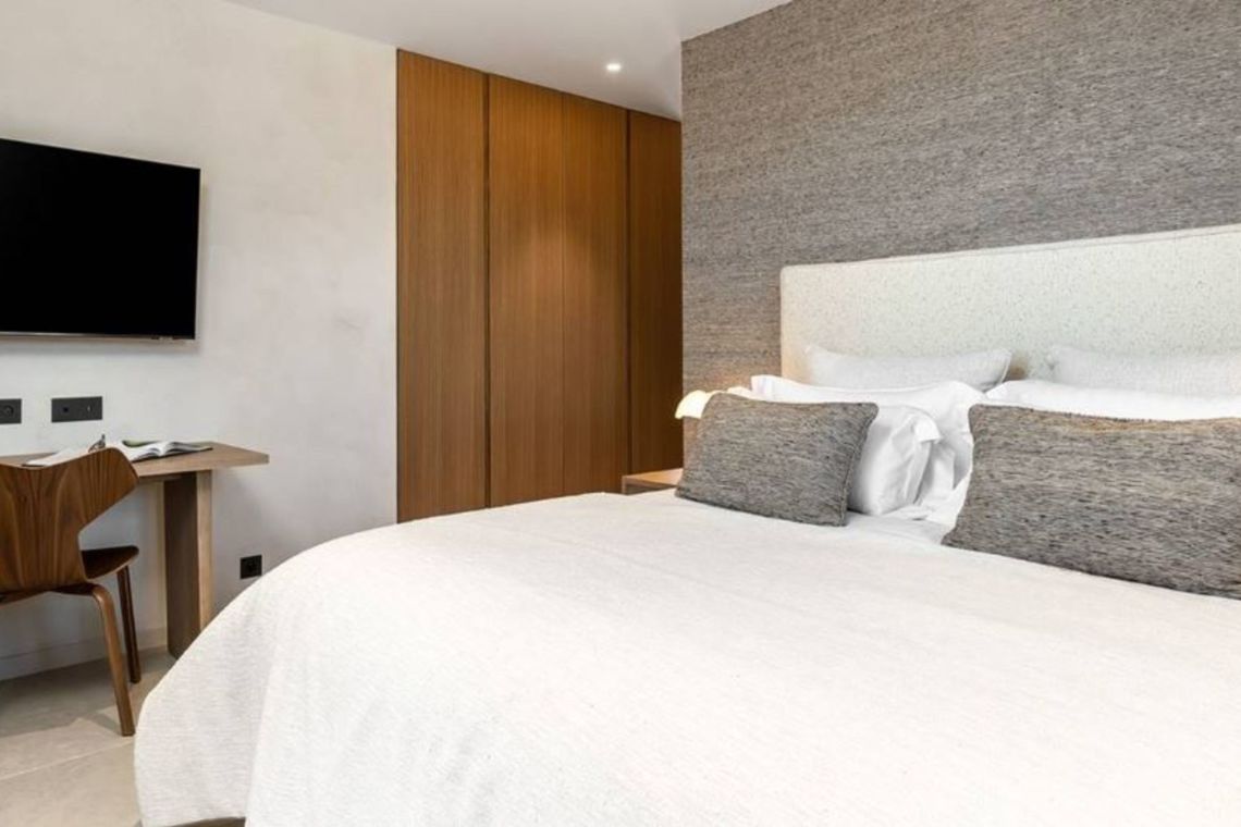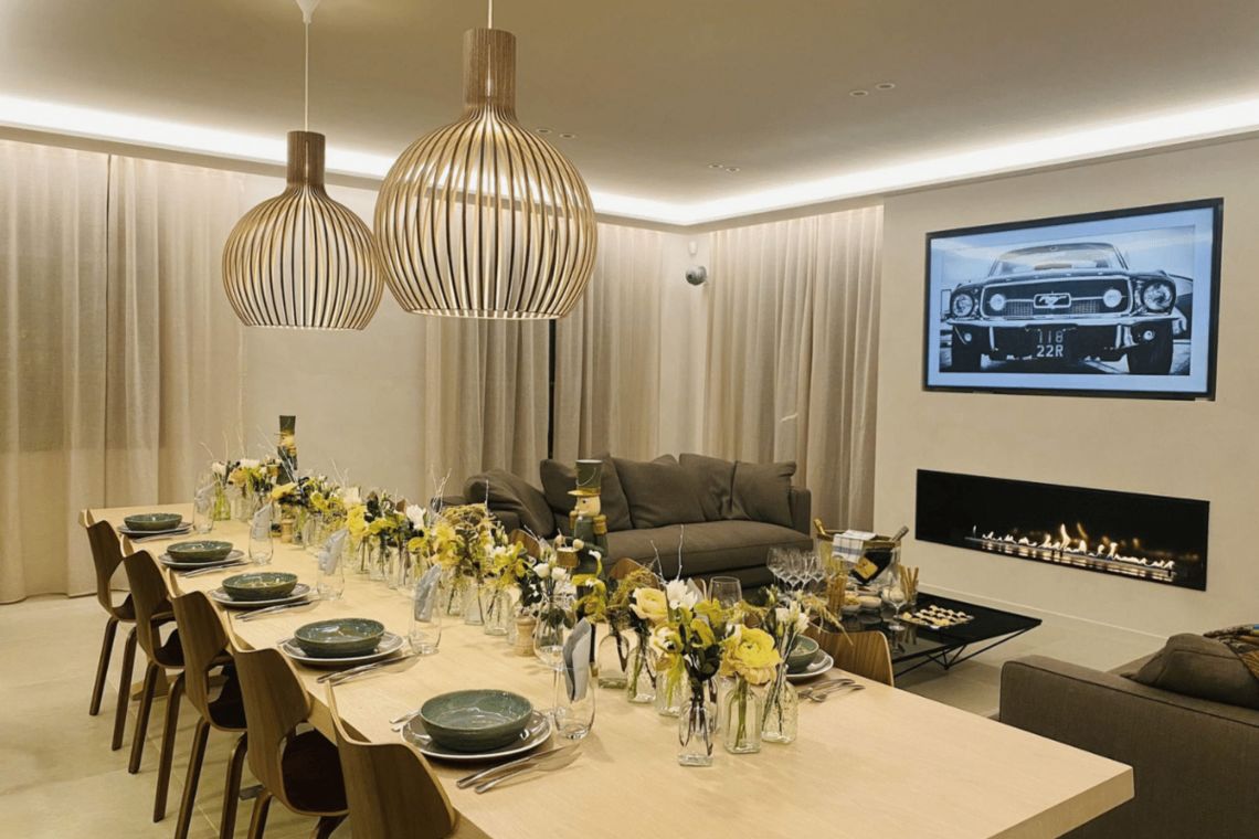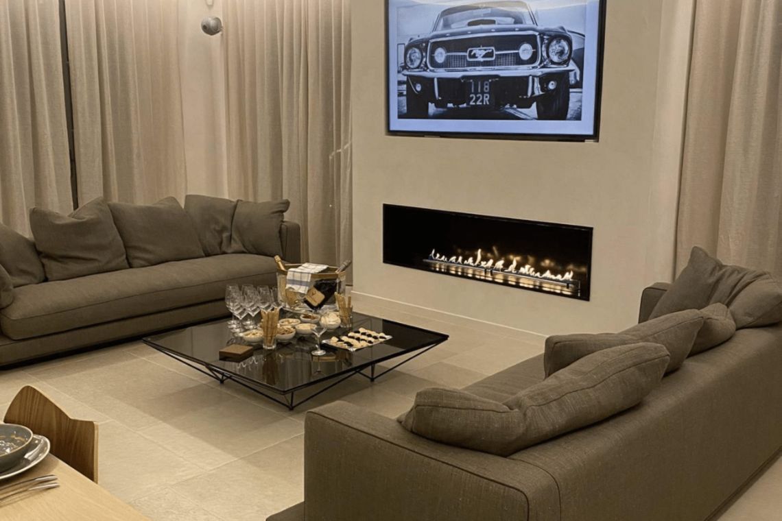On the ground floor there is an open plan living area comprising a living room, dining room, kitchen, and bar, complete with large, comfortable sofas, a design fireplace, and a hidden TV. Sliding doors open onto the garden and pool area, while the dining table accommodates up to 14 guests, perfect for entertaining in style.