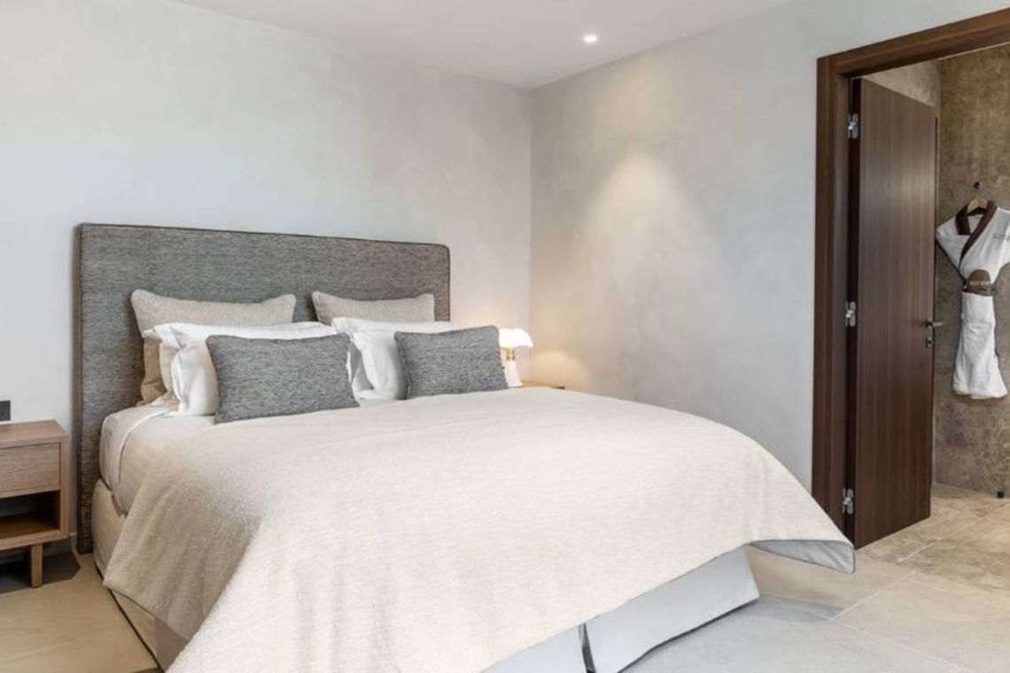 The villa features 5 guest bedrooms with en suite bathrooms on the ground and first floors, plus 2 additional bedrooms on the lower level, ideal for staff or teenagers. All bedrooms are furnished with king size beds that can be converted to twins on request. The master suite boasts an office area, full bathroom with jacuzzi and shower enclosure, and views of both the pool and the village.