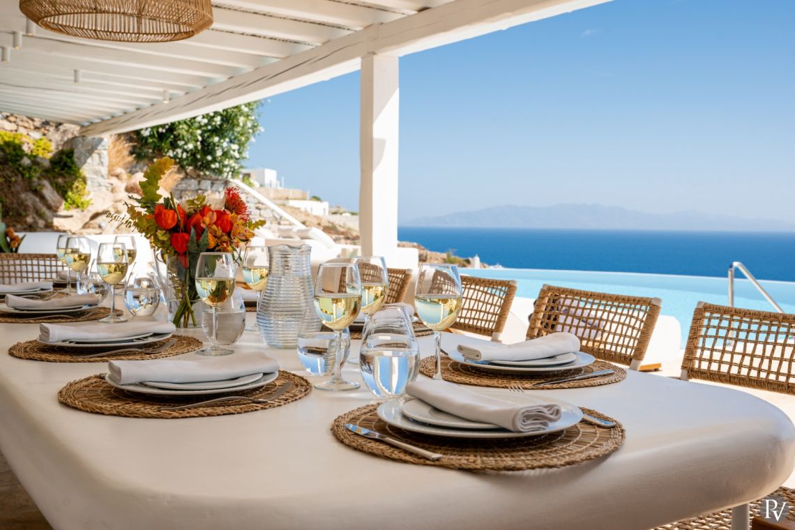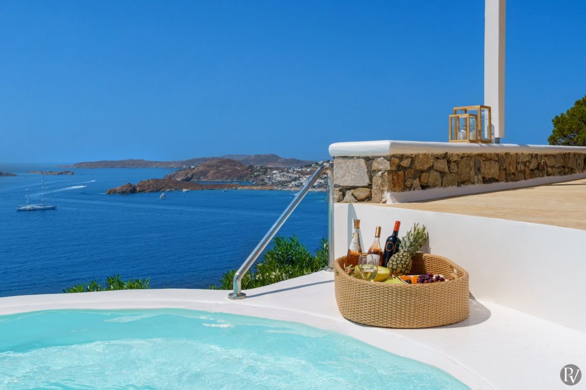 Stepping out on Carmina’s impressive multi-level terrace will have you wondering what the best place is to bask in the views. You'll have to choose for yourself between the turquoise infinity pool, the heated jacuzzi or the big alfresco dining table under the shade of a wooden pergola. You phone will be filled with photos in blue, that’s for sure; press the escape button and let the Aegean breeze travel your senses. As the golden hour approaches, sink in the heated jacuzzi with a glass of champagne and enjoy one of the most breath-taking sunsets you will have ever experienced.