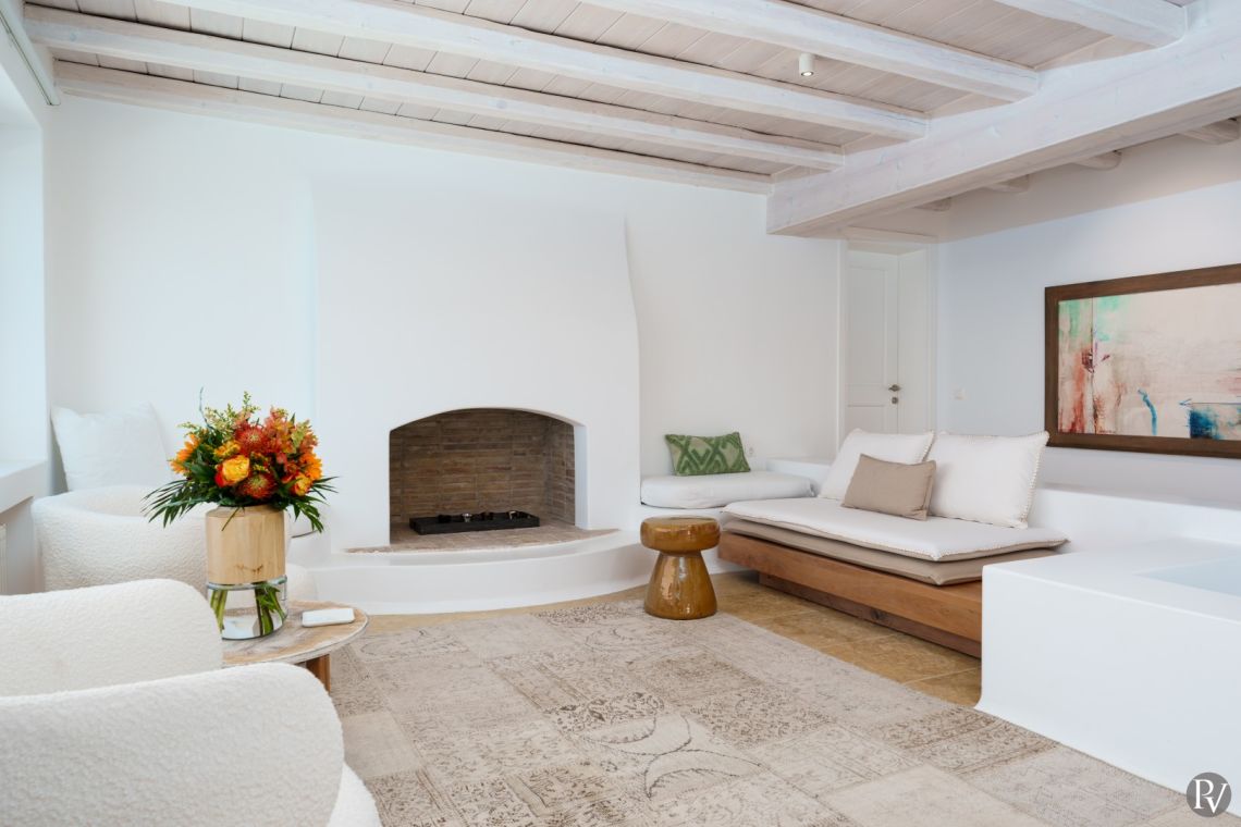 Dressed in white and stone, Horatia’s exterior was designed to offer its guests maximum relaxation. After soaking up the sun on the comfy loungers by the large infinity pool, which gives the illusion of overflowing directly into the sea, it’s time to enjoy a sizzling and tasty BBQ at one of the shaded patios, while the fresh Aegean breeze caresses your skin. With Ornos and its yachts illuminating the sea under the moonlight, this luxury Mykonos villa enjoys spectacular night views from the pool terrace, where you will host fancy island parties your guests will talk about for a long time.