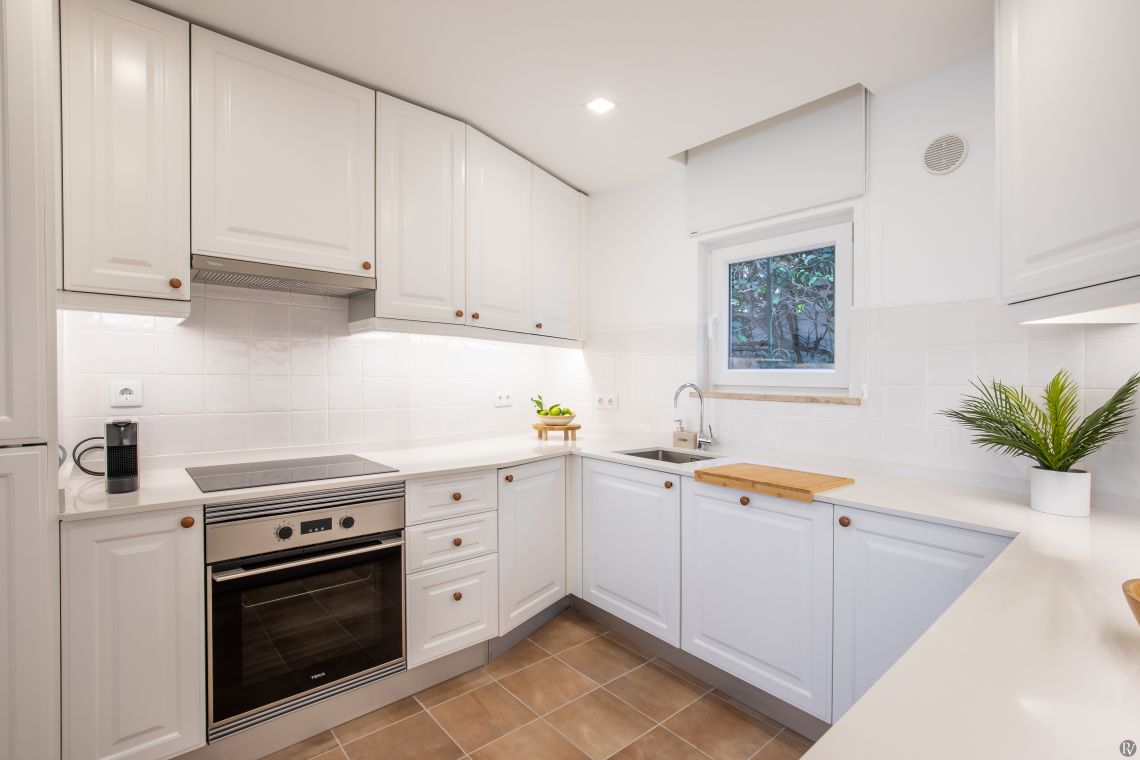 The modern kitchen is fully equipped with brand-new appliances — fridge, freezer, oven, microwave, dishwasher and coffee machine.