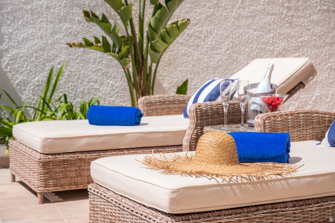 Slide open the glass doors and step onto the balcony, where an endless ocean view awaits. The terrace, complete with a dining table, chairs, and sun loungers.