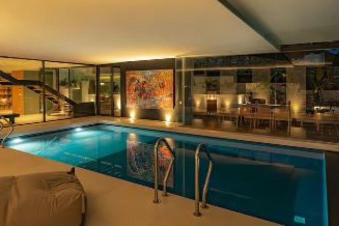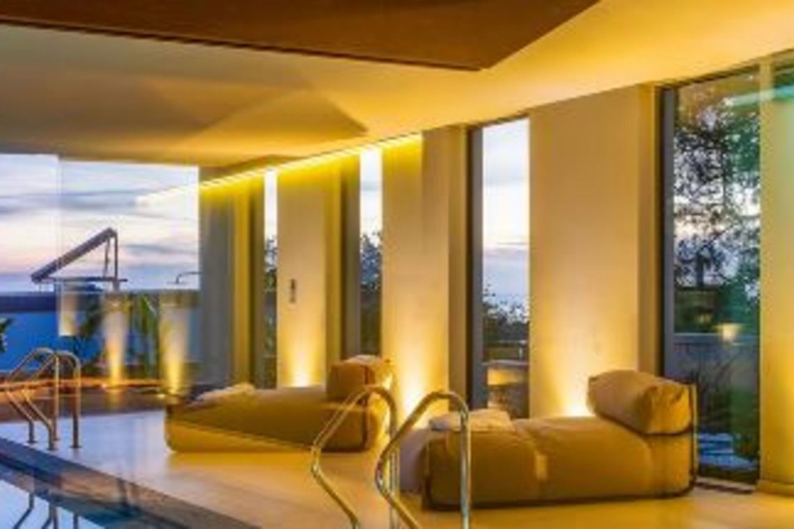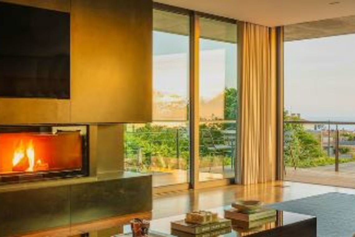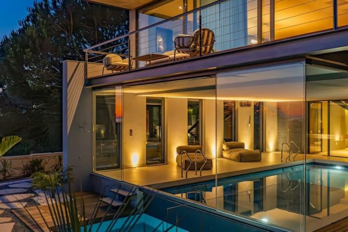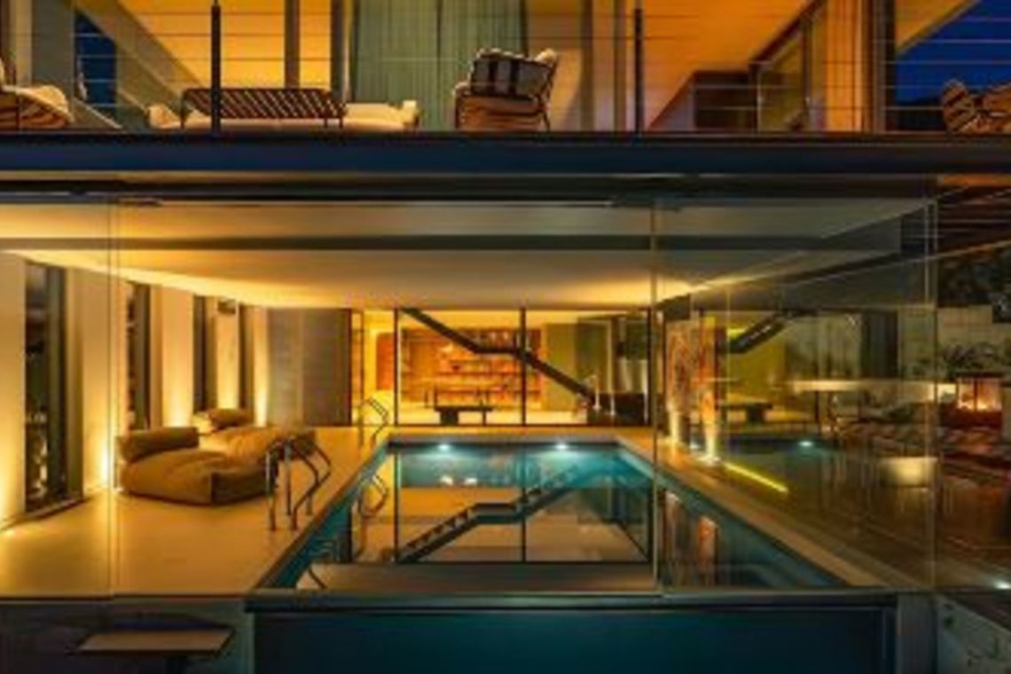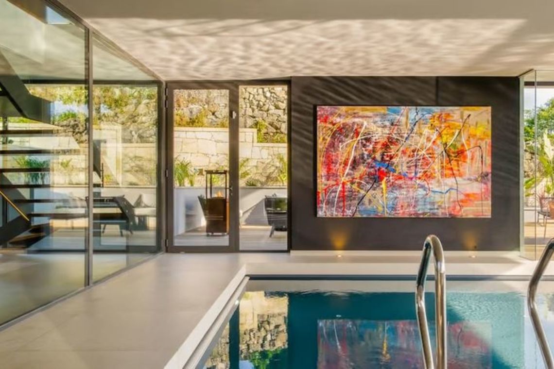 The 400 sqm villa features a spacious living room with a fireplace, comfortable seating area, TV, and large glass sliding doors opening onto a balcony with beautiful views. There is a dining area and an open plan kitchen equipped with Smeg appliances. The property also offers a games room with a pool table and TV, as well as a unique indoor/outdoor swimming pool with a pool ladder, separated by large glass panels.