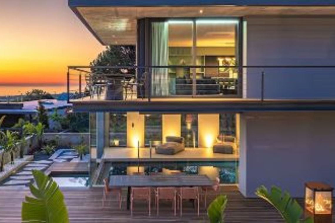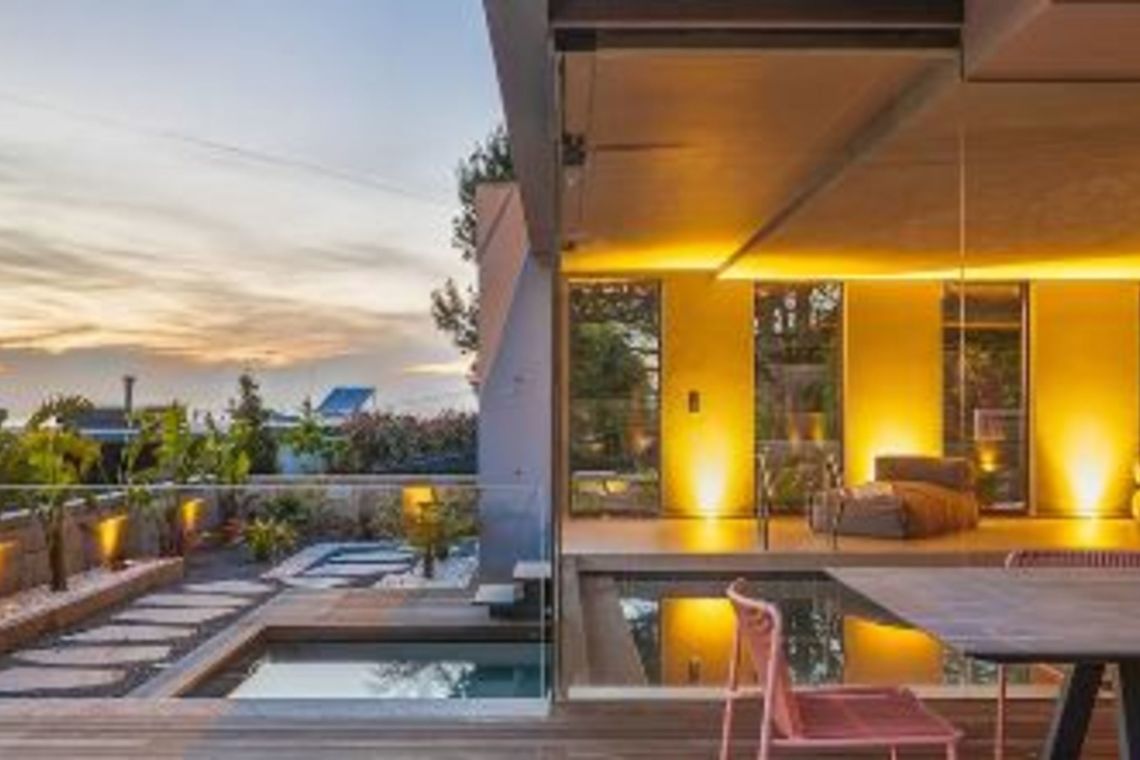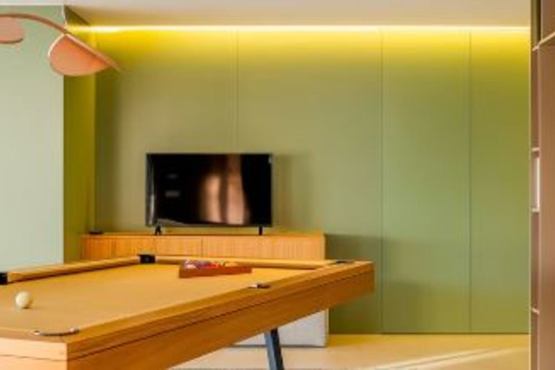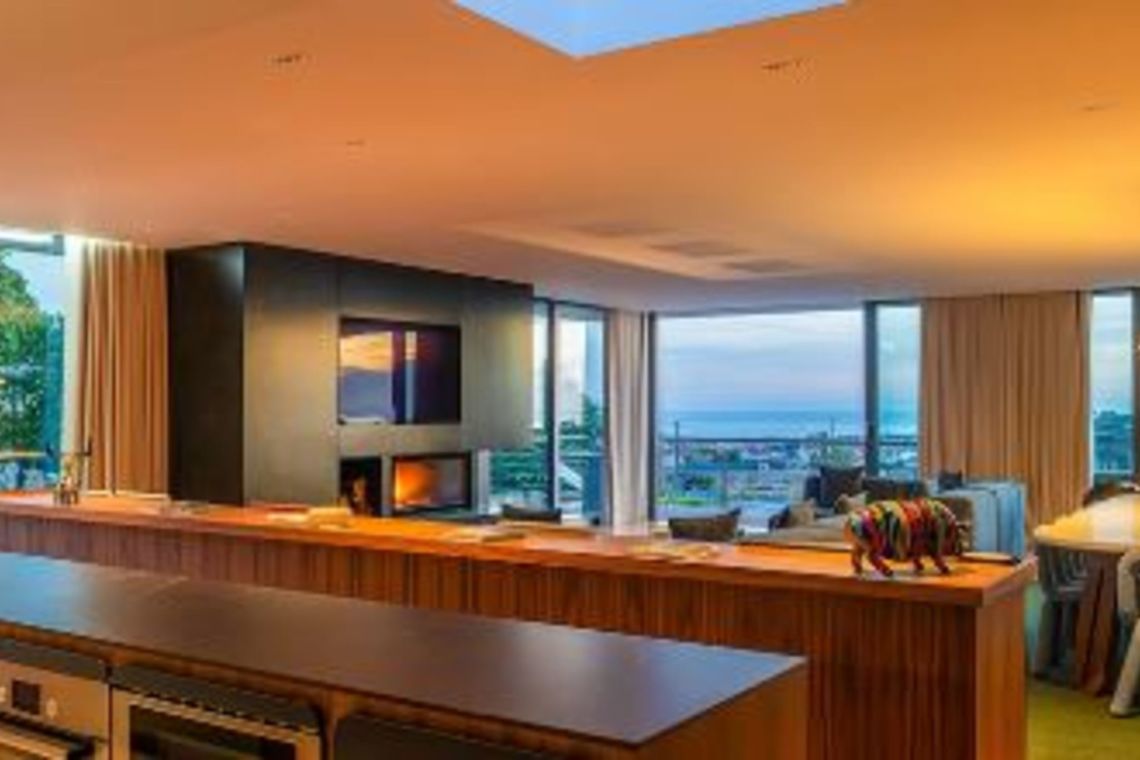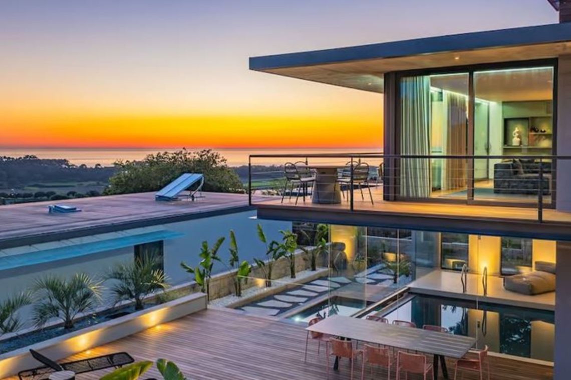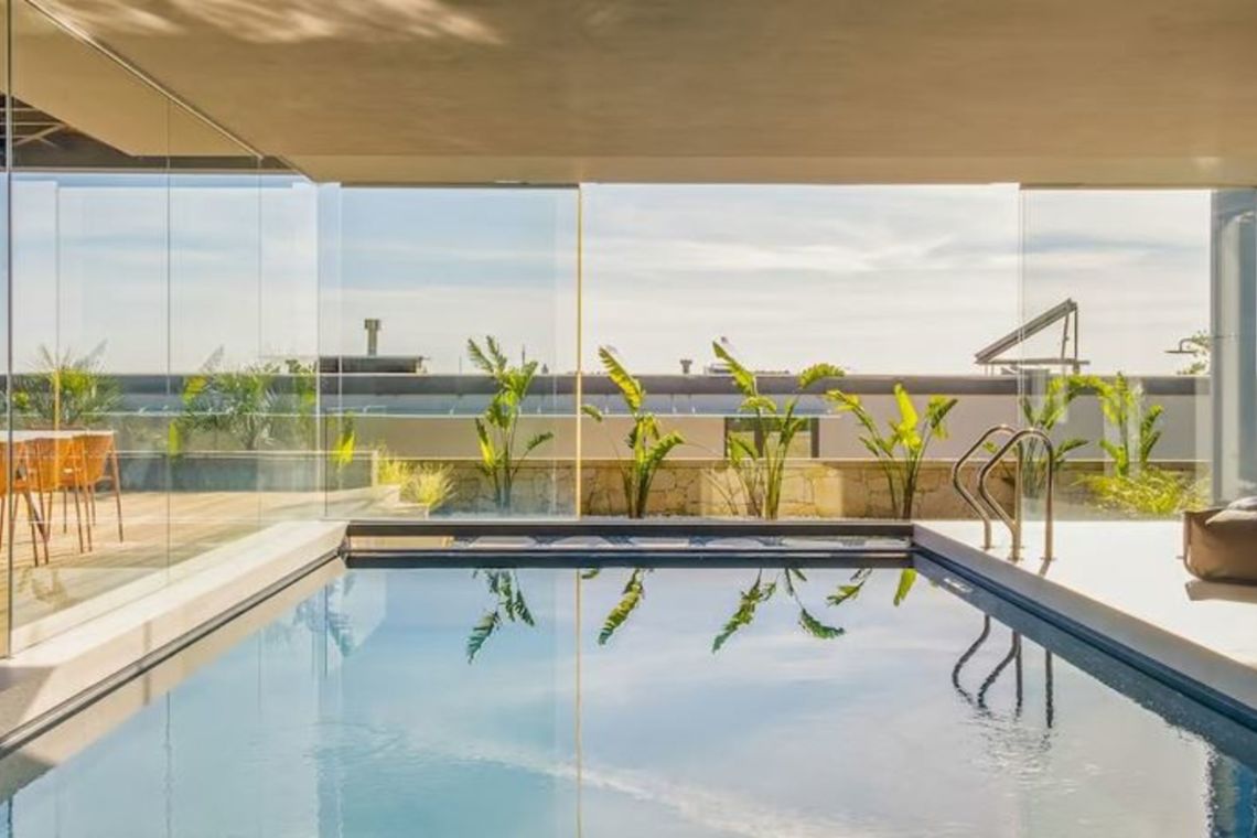 The 400 sqm villa features a spacious living room with a fireplace, comfortable seating area, TV, and large glass sliding doors opening onto a balcony with beautiful views. There is a dining area and an open plan kitchen equipped with Smeg appliances. The property also offers a games room with a pool table and TV, as well as a unique indoor/outdoor swimming pool with a pool ladder, separated by large glass panels.