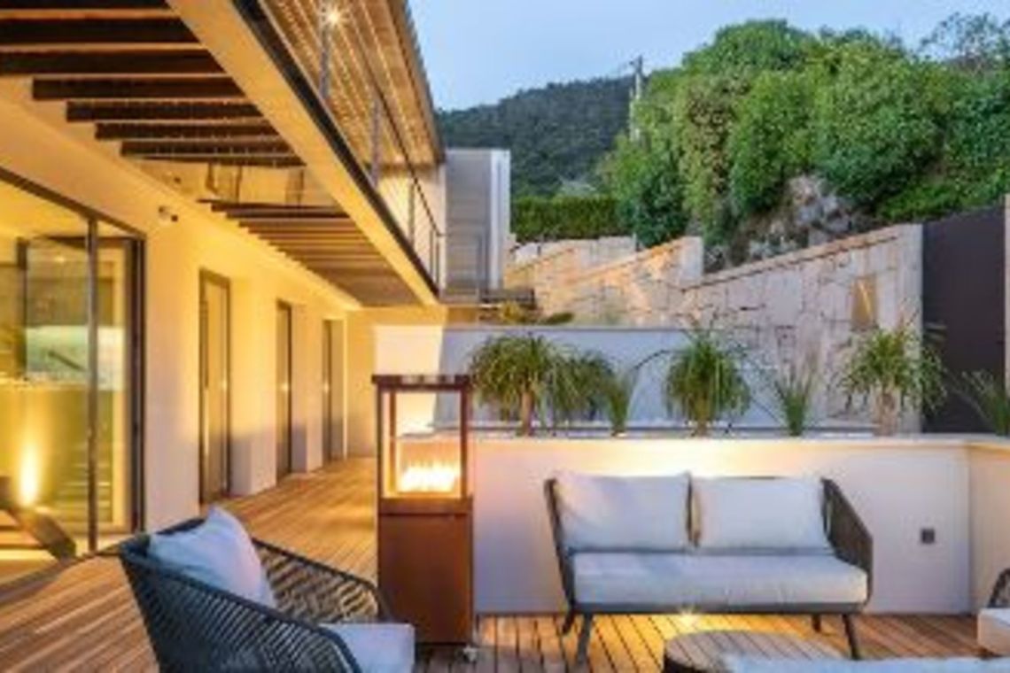 Villa Anaras is an elegant villa with gorgeous distant sea views, featuring both indoor and a small outdoor heatable swimming pool, a games room with a pool table, and relaxing outdoor spaces with a fireplace and al fresco dining, offering a perfect blend of modern elegance and artistic flair.