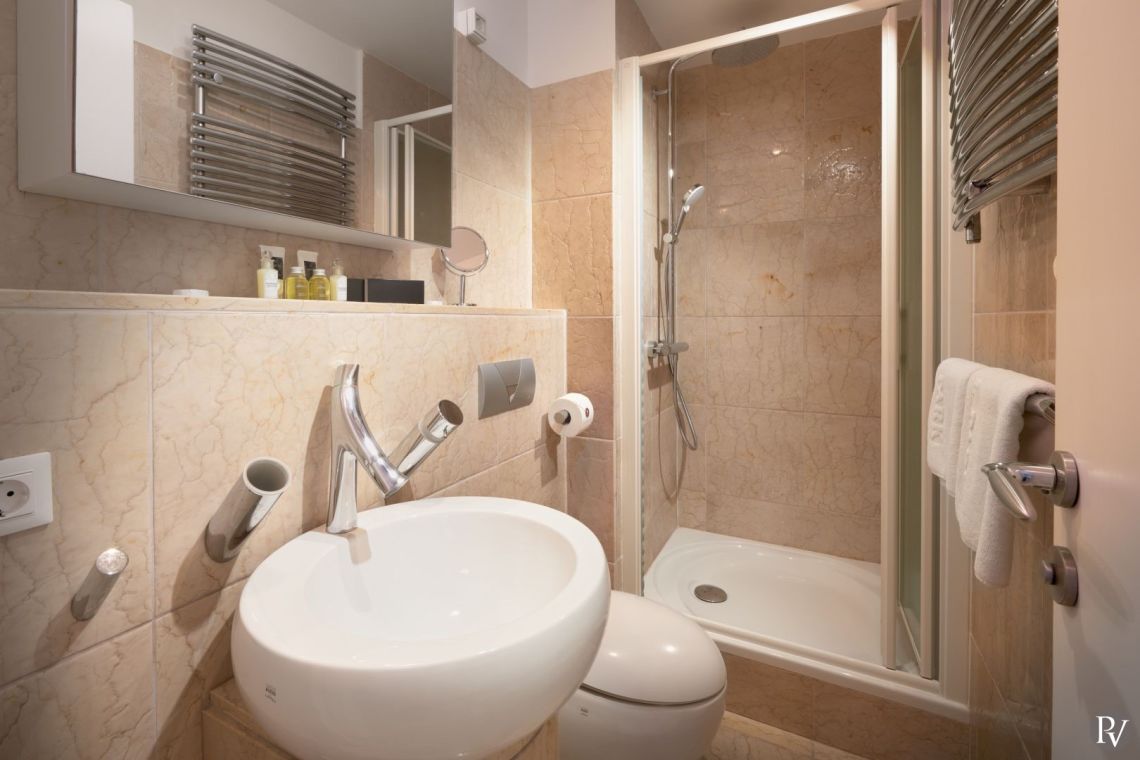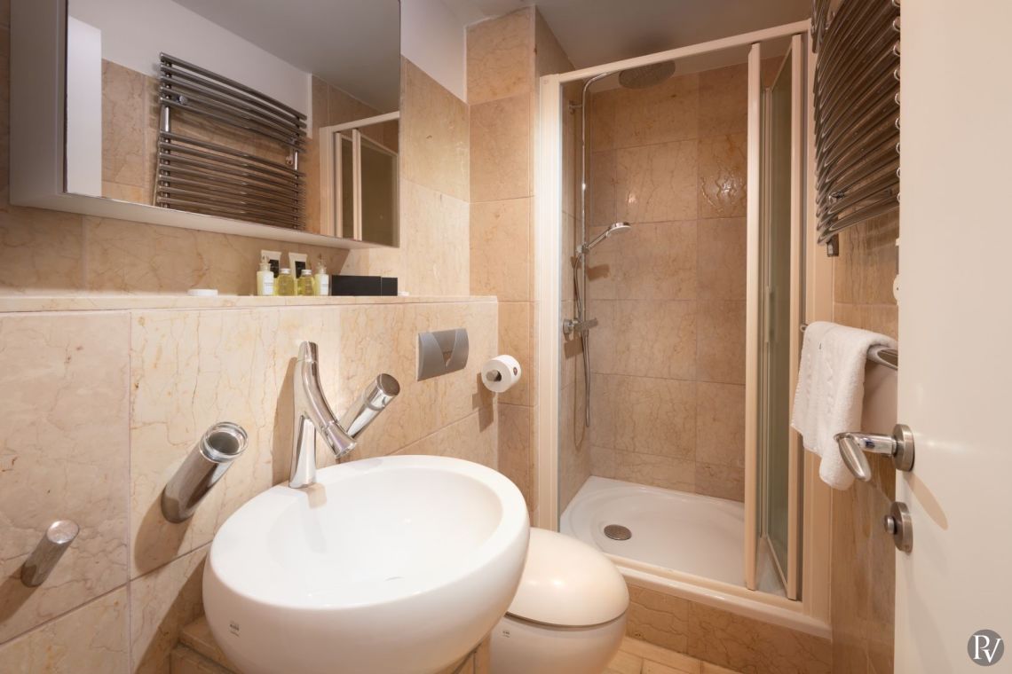 The first residence is spread over two floors. On the ground floor, there is a modern, fully equipped kitchen with an indoor dining area, a spacious living room with a fireplace, and a large master bedroom featuring a private bathroom and balcony. This level also includes a recreation room and an additional double bedroom with a private bathroom, shower, and balcony.