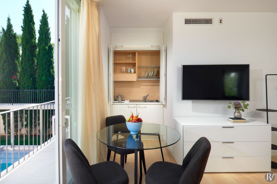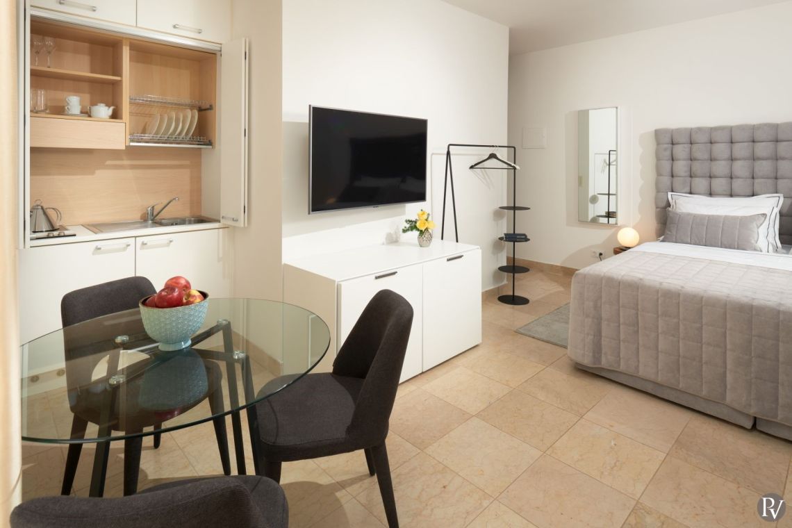 The second residence contains four apartment-style bedrooms, each with a double bed, private bathroom, and its own kitchenette and storage space. In addition, there are four sofa beds available, providing extra sleeping capacity for individual guests.