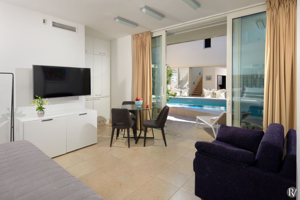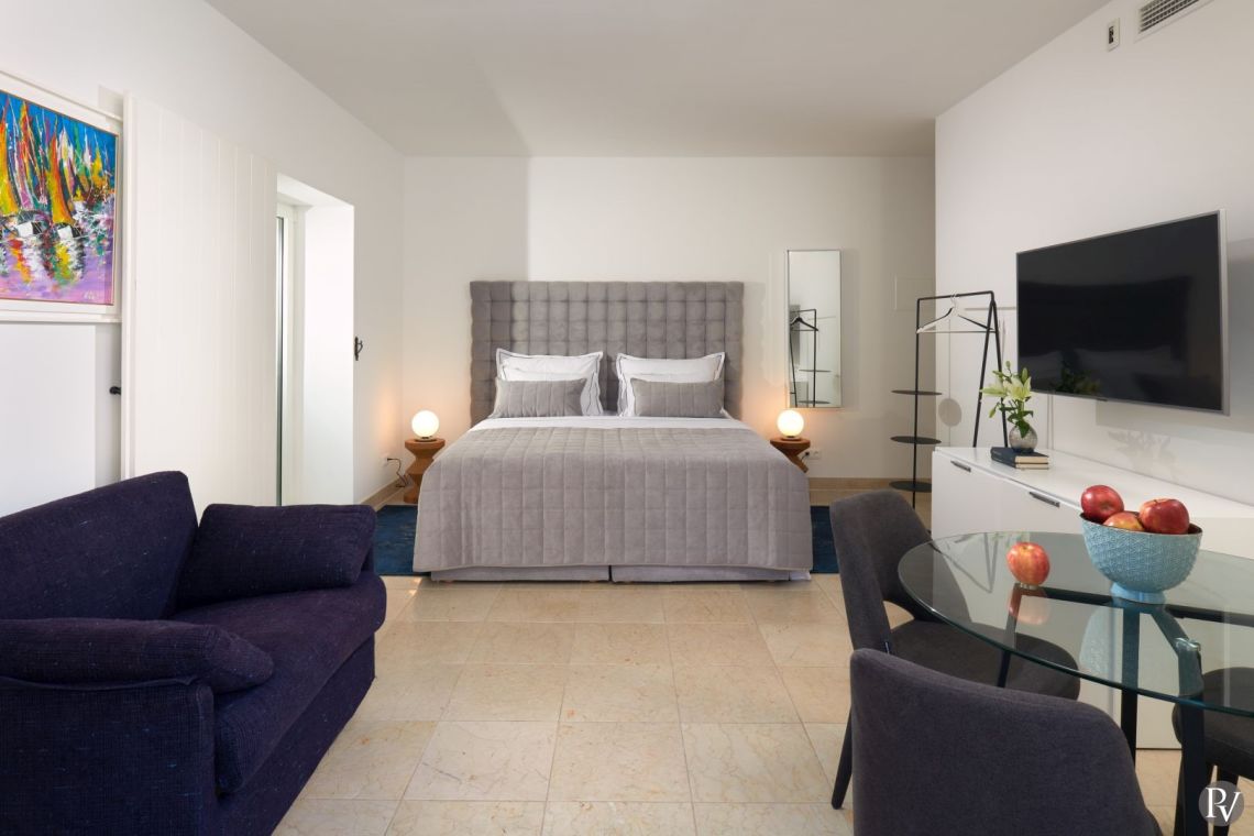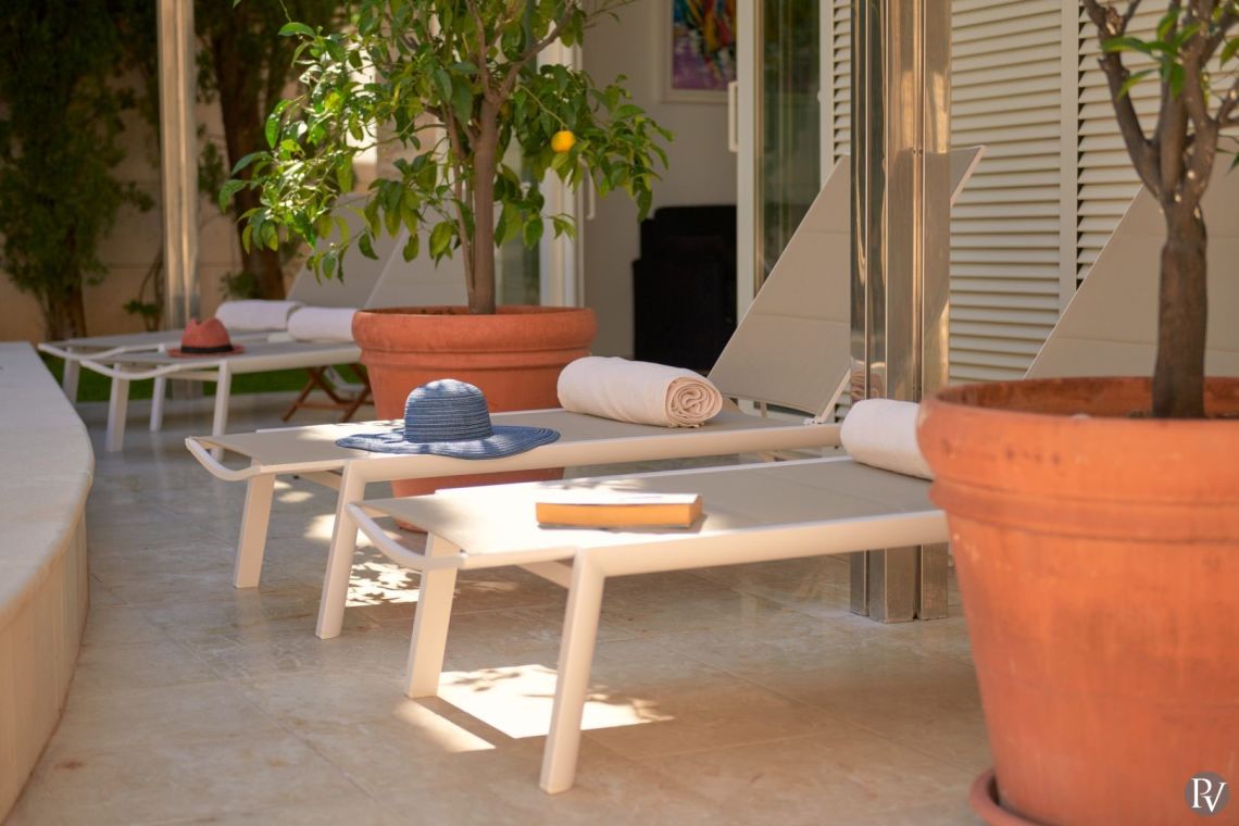A private courtyard links the two residential buildings, creating a pleasant shared space for guests. The villa is located just steps from the beach, where deck chairs are available for use, allowing you to fully enjoy the coastal setting.
