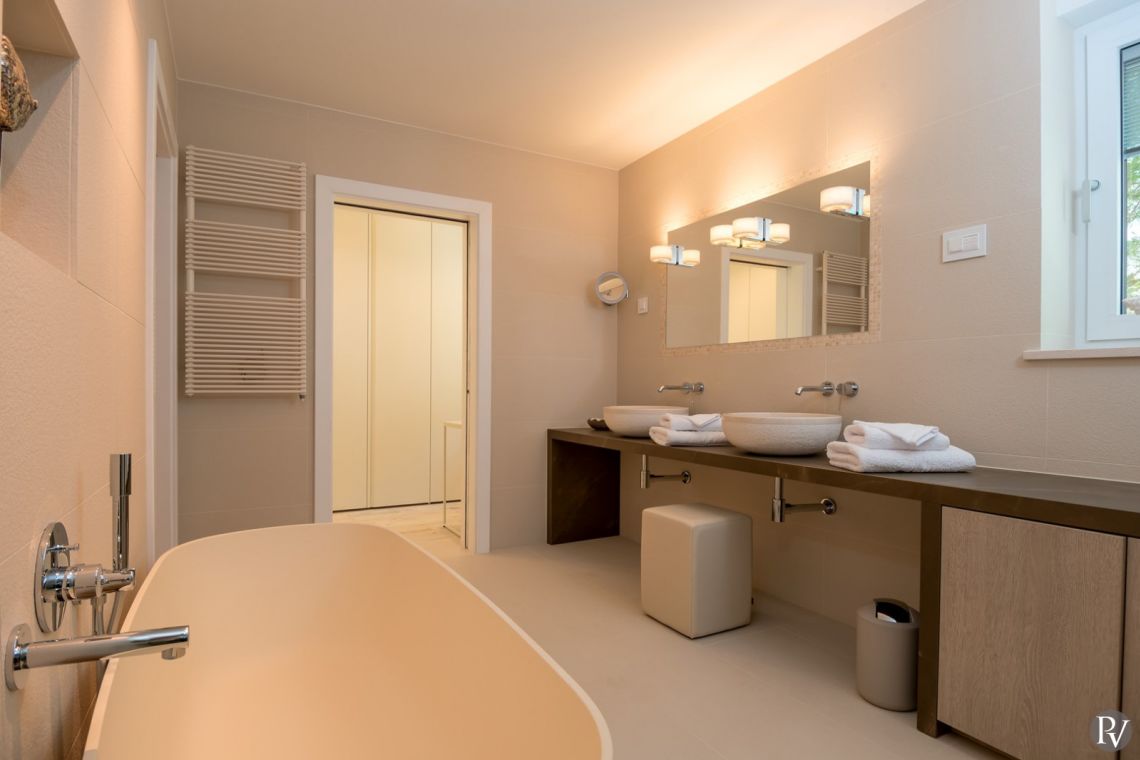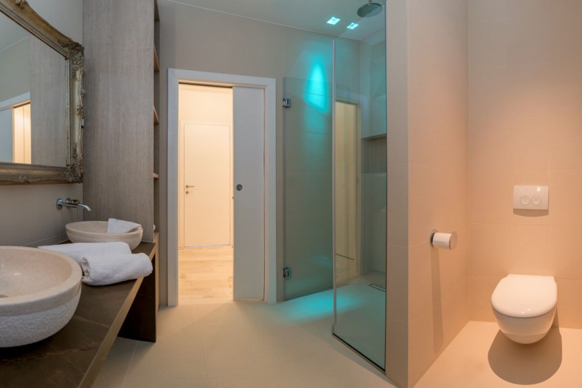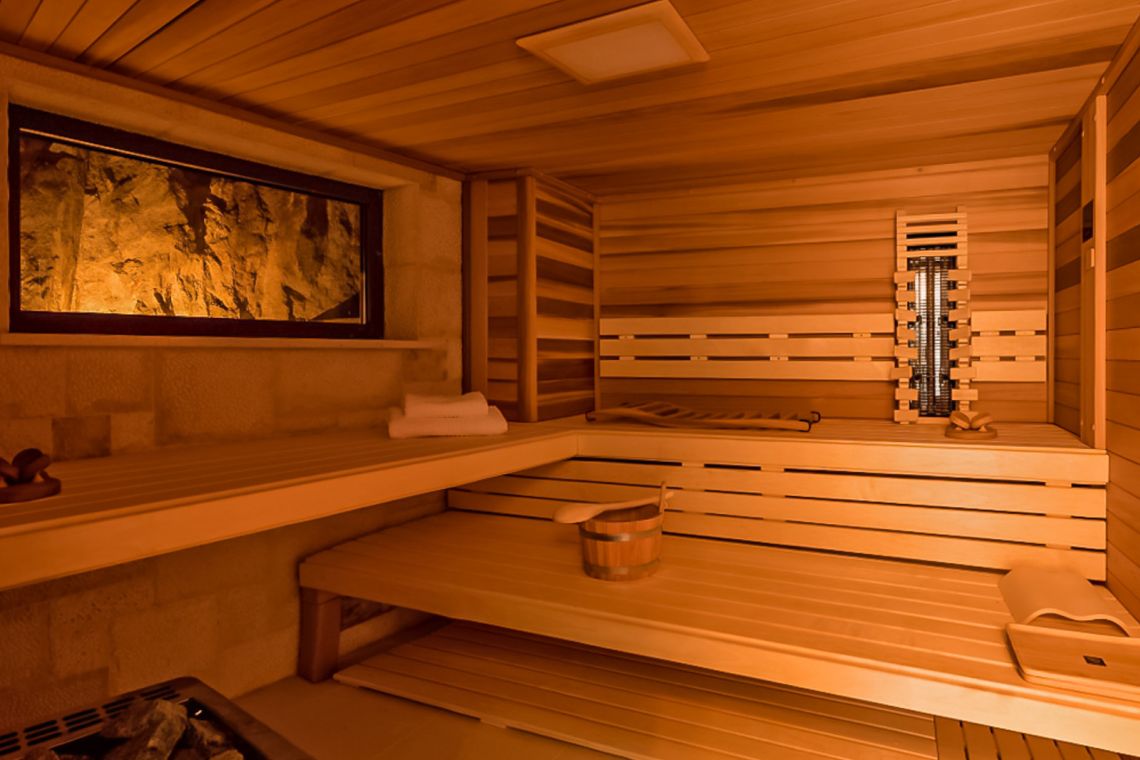 The ground floor features a large, fully equipped kitchen and a dining area with seating for 12 guests, centred on a spacious living room ideal for family evenings. A dedicated wellness and leisure area includes a sauna, shower and toilet, alongside a billiard room. The villa is fully air conditioned and provides Wi Fi throughout plus private outdoor parking.