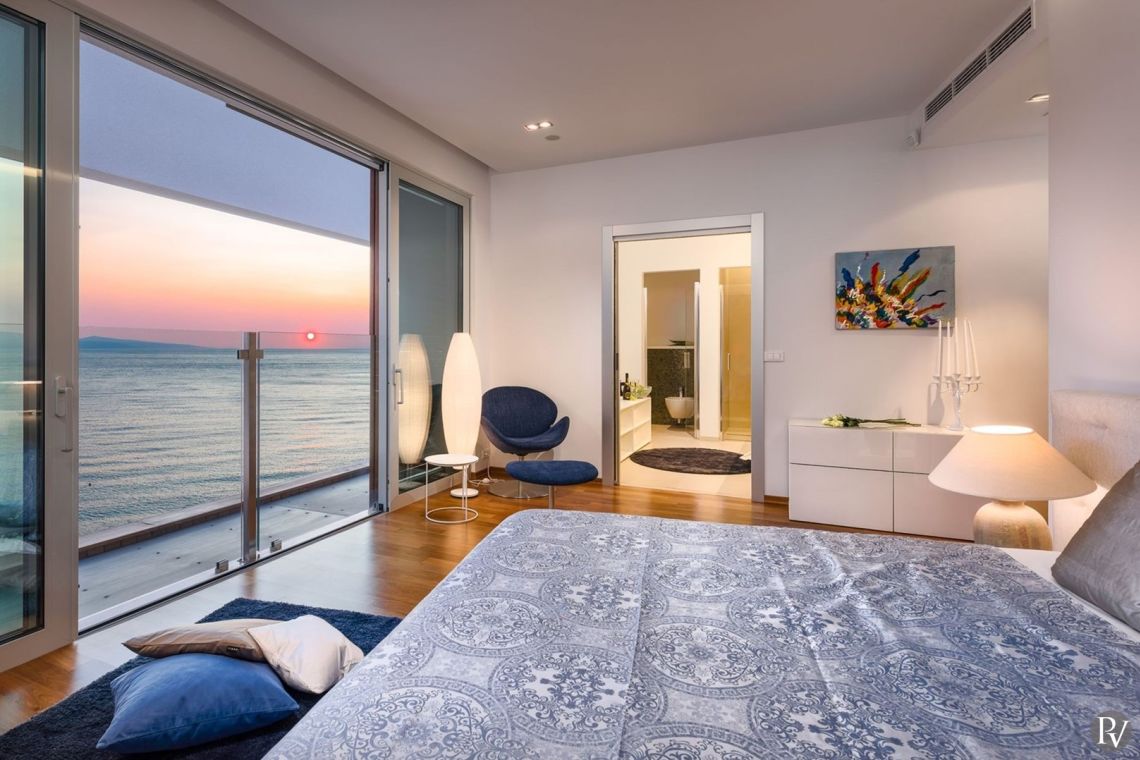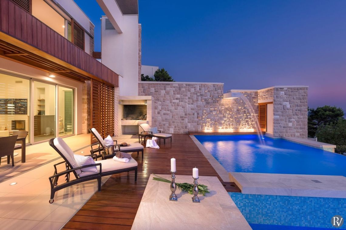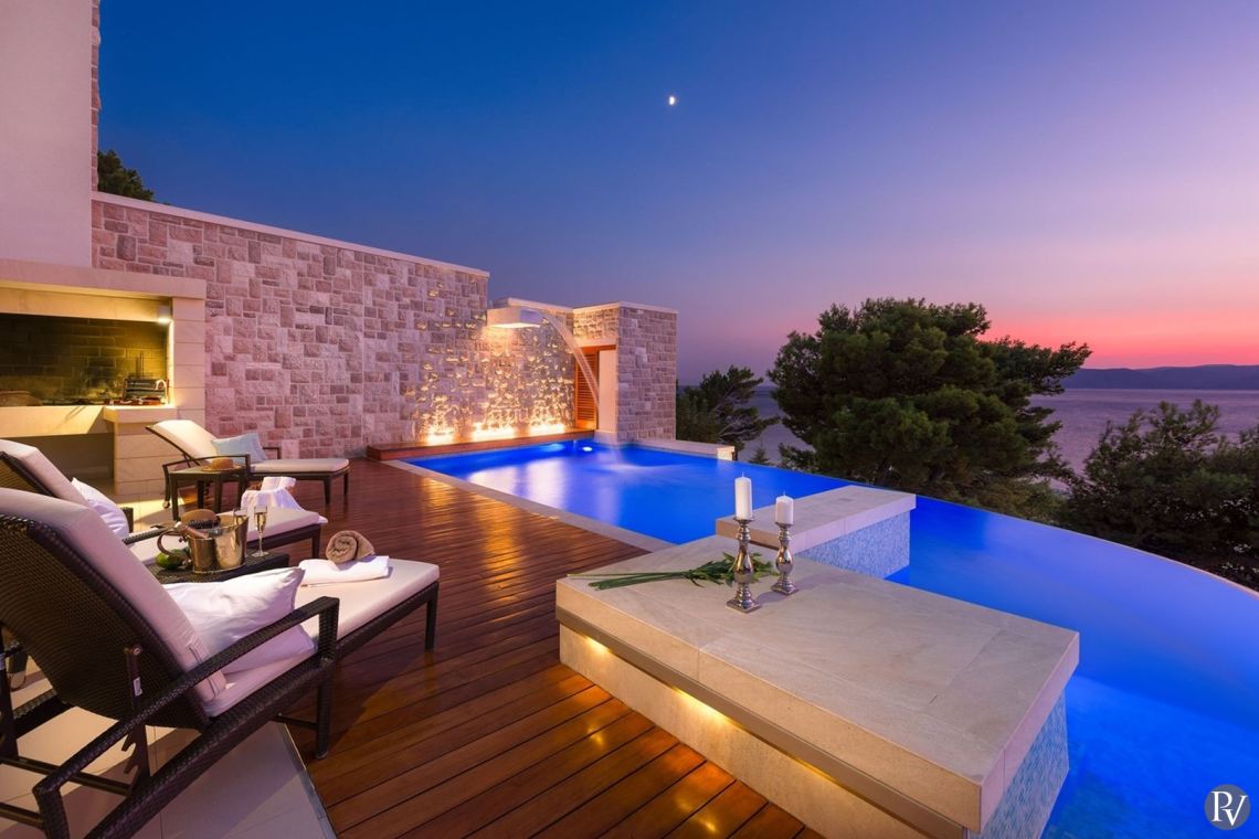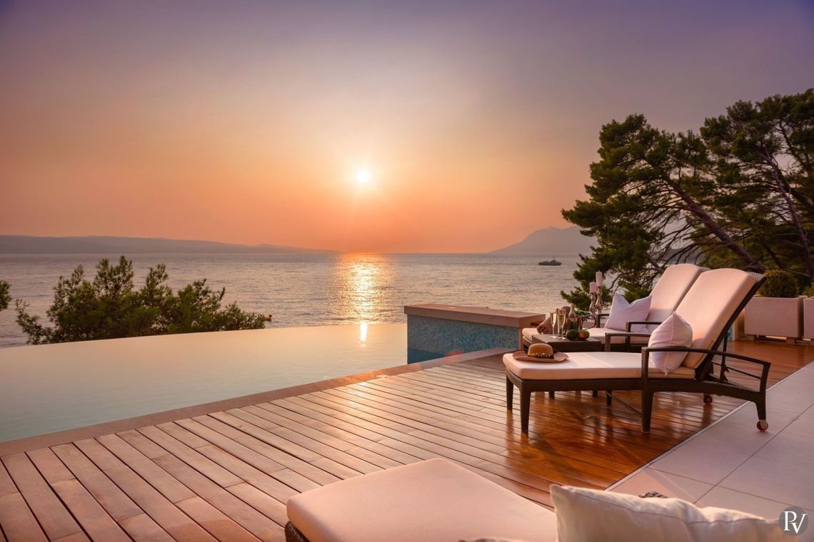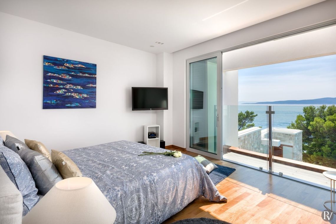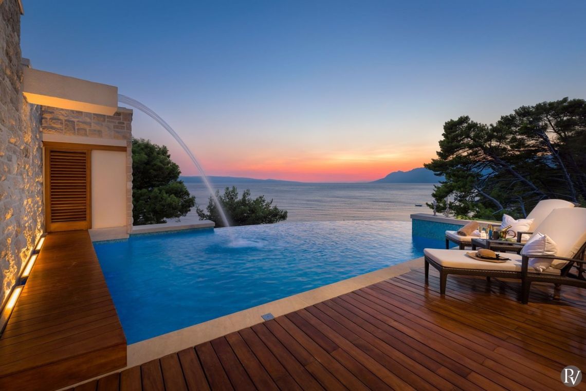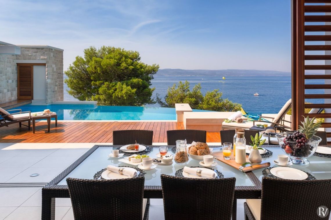 Step outside to enjoy a heated pool, sun terraces, and alfresco dining with panoramic views of the Adriatic Sea. The villa’s beachfront location allows guests to walk directly onto the pebble beach, while nearby cafés, restaurants, and coastal paths enhance the experience of Brela’s scenic Makarska Riviera.