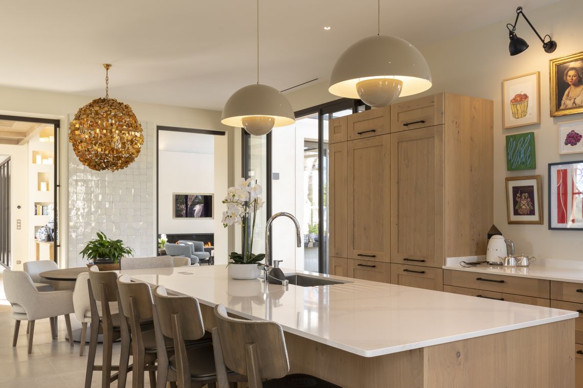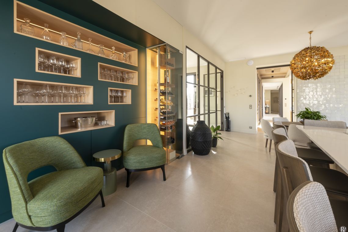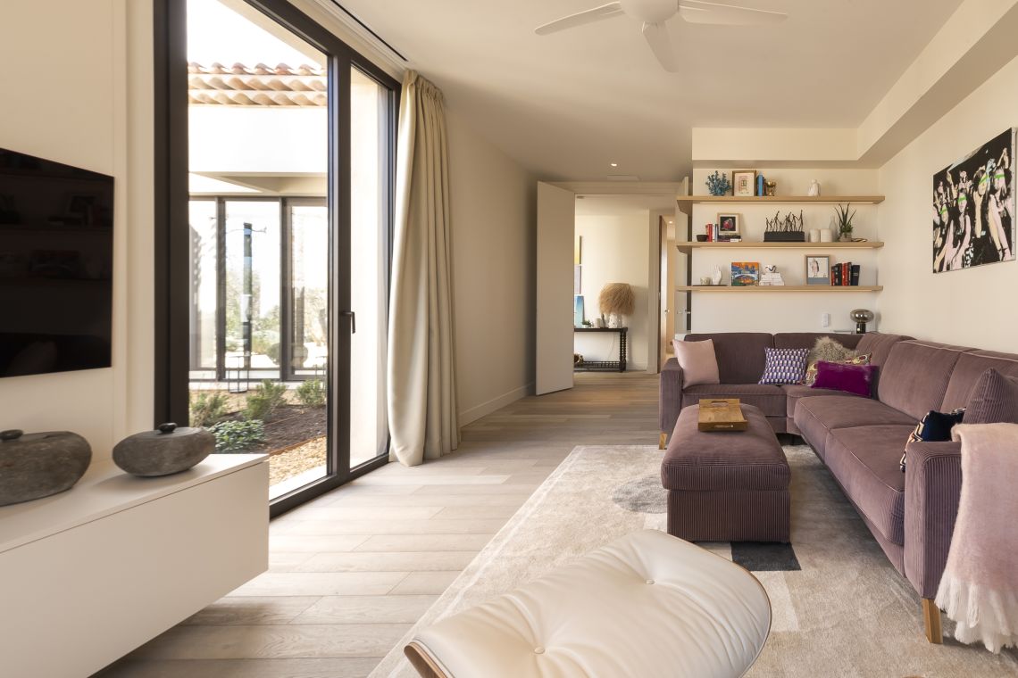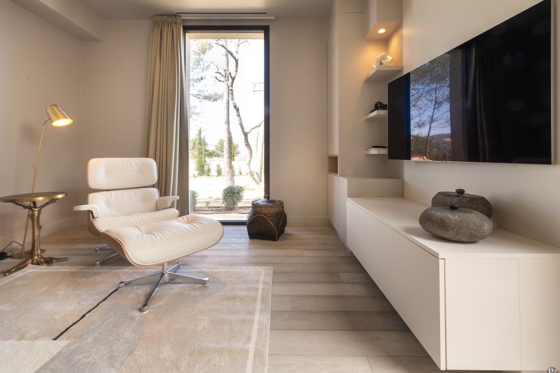 The interior spaces are bright, spacious, and designed for both relaxation and entertaining. Villa Pepin features a comfortable TV room with a large sofa and Eames armchair, a stylish living room with TV and fireplace, and an open-plan kitchen with dining area enjoying lovely views and direct access to the garden. An office area provides a dedicated workspace, while a well-equipped laundry room includes an additional fridge, washing machine, and dryer.