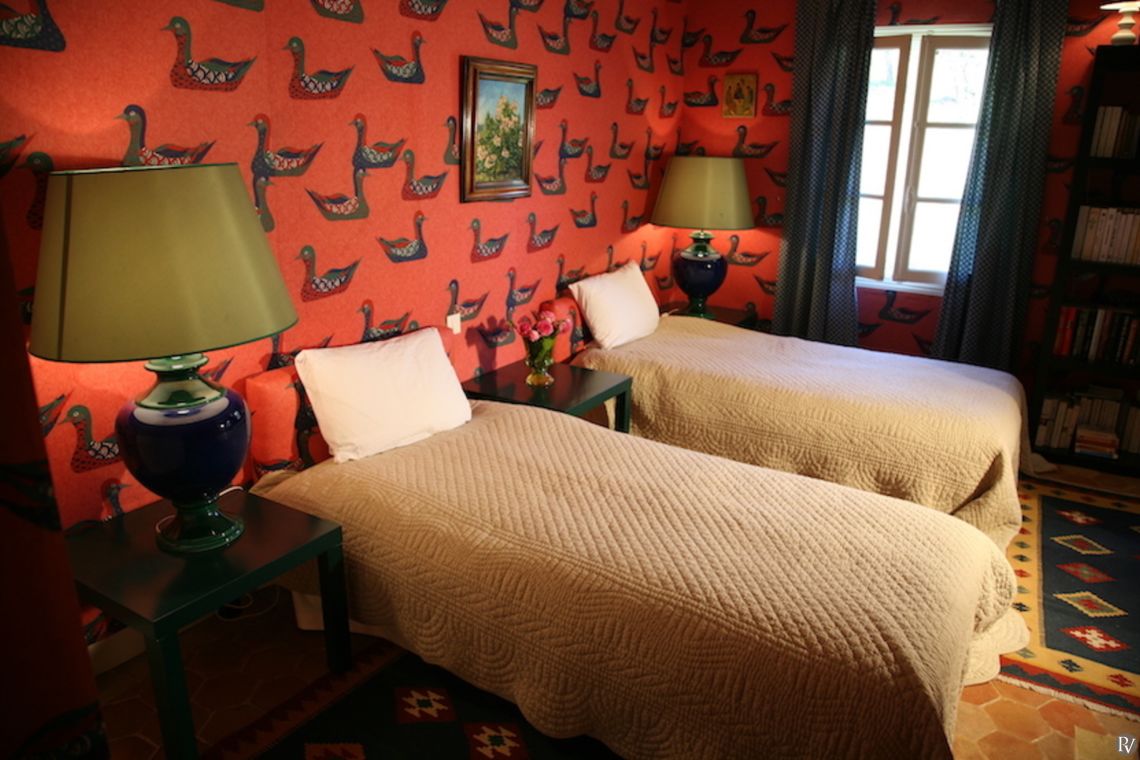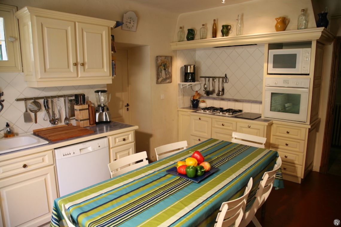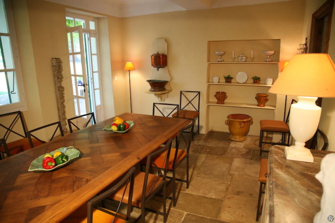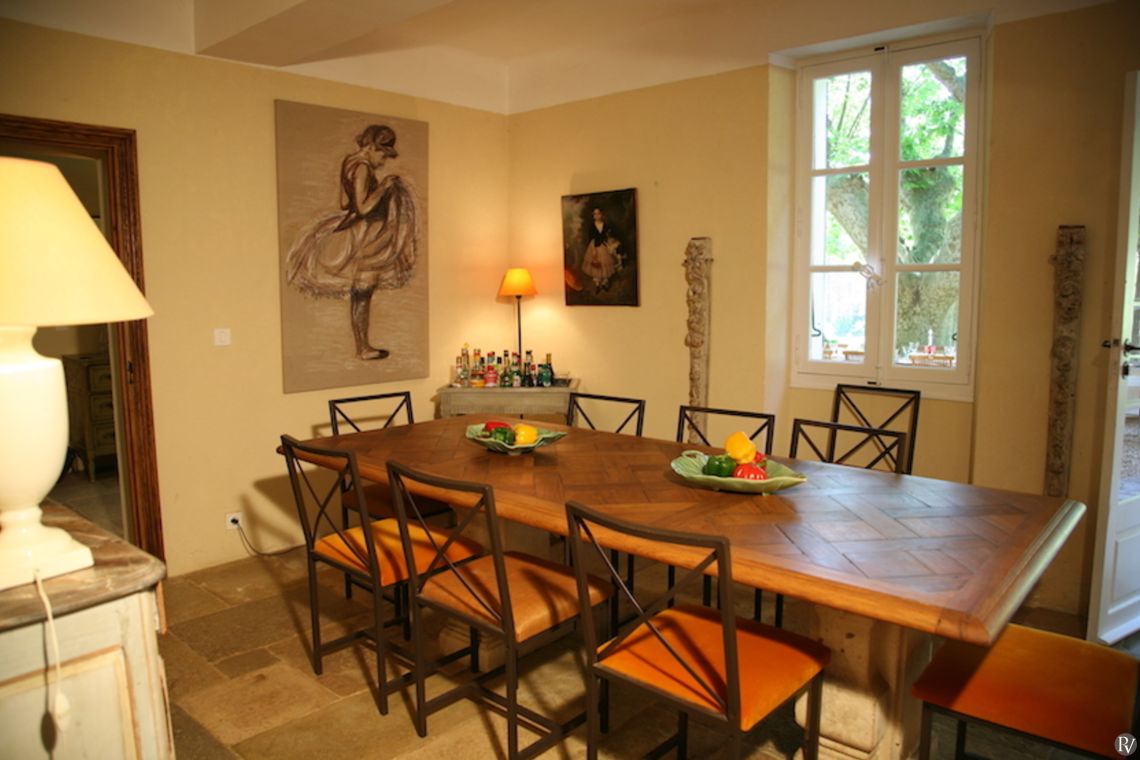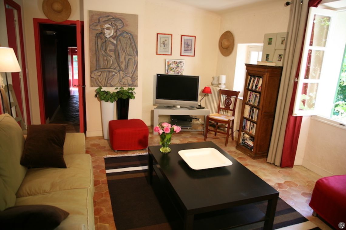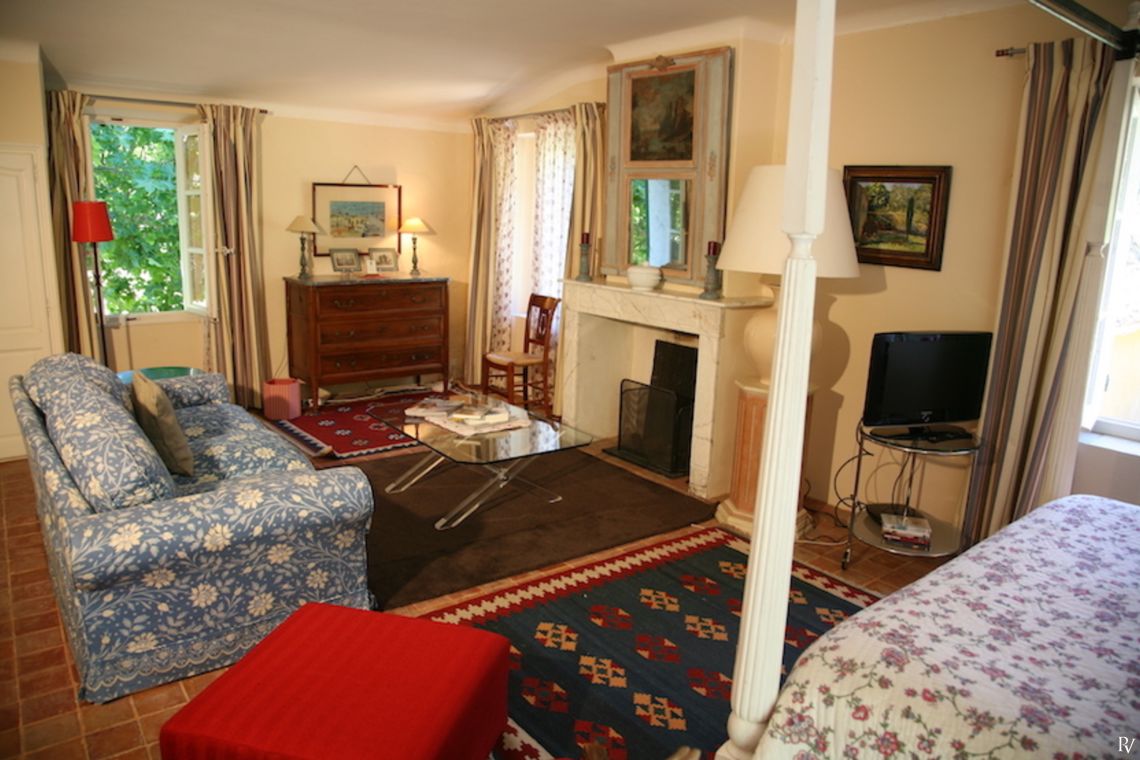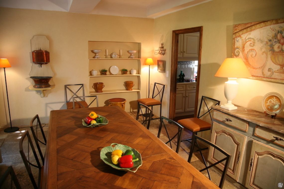 The property has been tastefully decorated, blending original features with modern comforts to create a truly inviting retreat. The elegant main living room, complete with a large fireplace for cooler autumn evenings, opens onto a charming lower terrace. Traditional natural flagstone flooring throughout the ground floor helps keep the interiors cool during the summer months. A fully equipped kitchen and separate dining room lead directly to a shaded terrace, where comfortable seating invites you to dine al fresco beneath the dappled shade of plane trees; the perfect setting to enjoy the tranquillity of the surroundings.