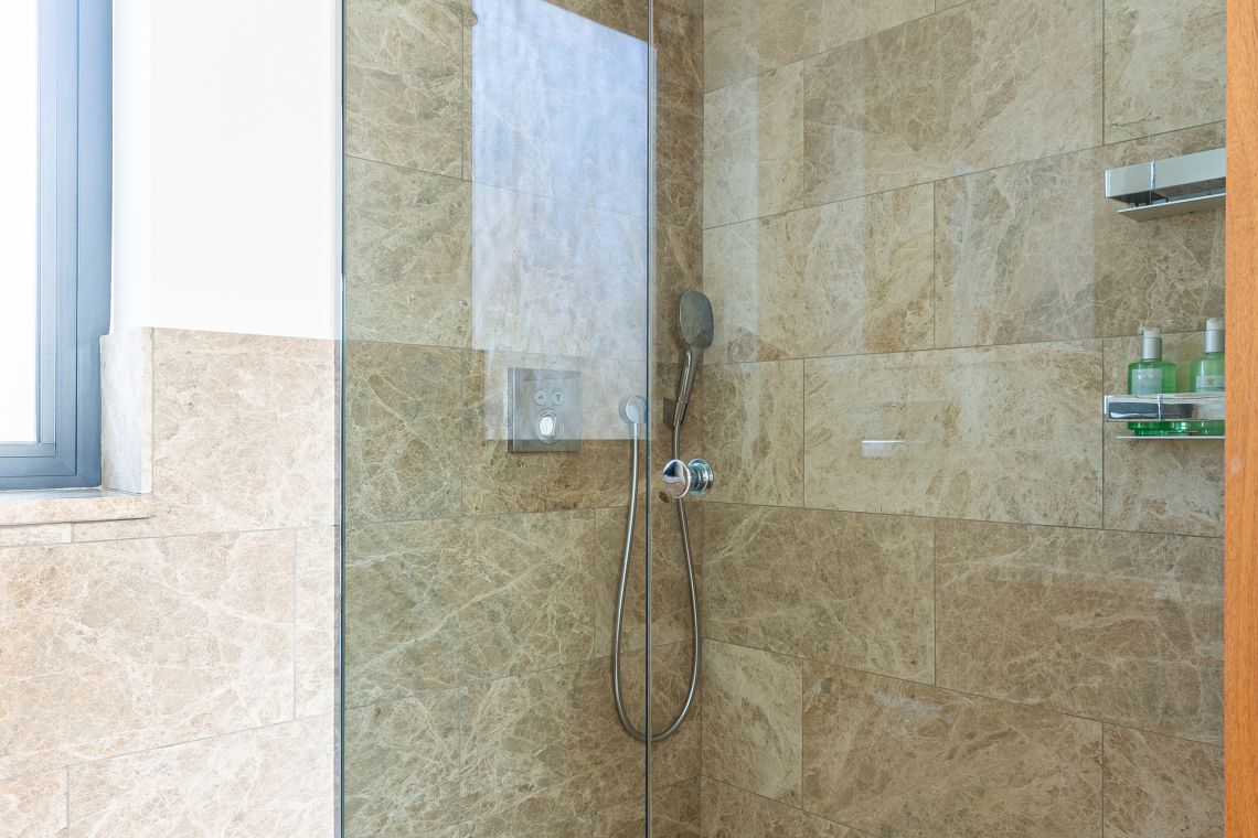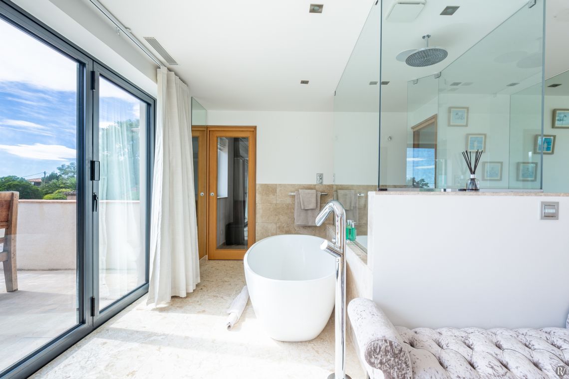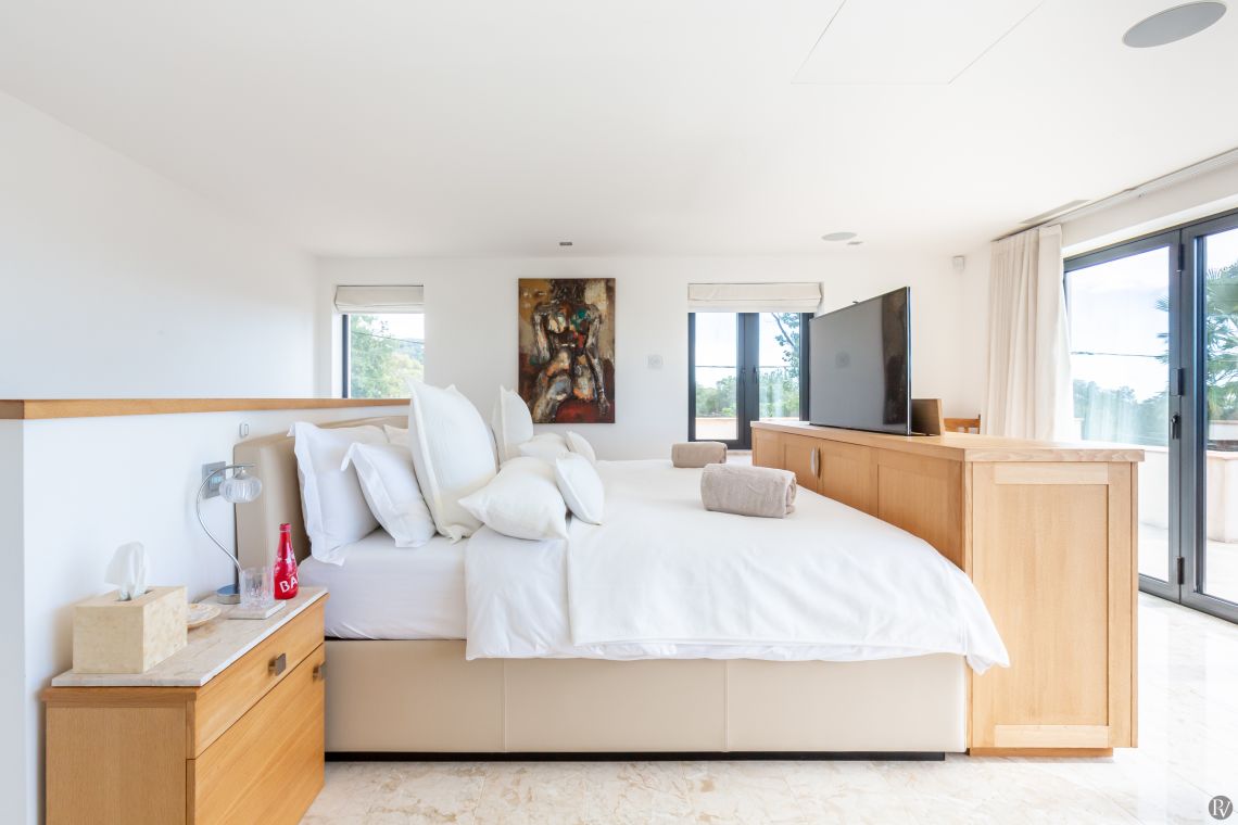 Bedroom 3: Master bedroom (220 x 200) with en suite bathroom featuring shower and open bath, double sinks, separate WC, dressing room, integrated TV, and a balcony overlooking the golf course with sea views.