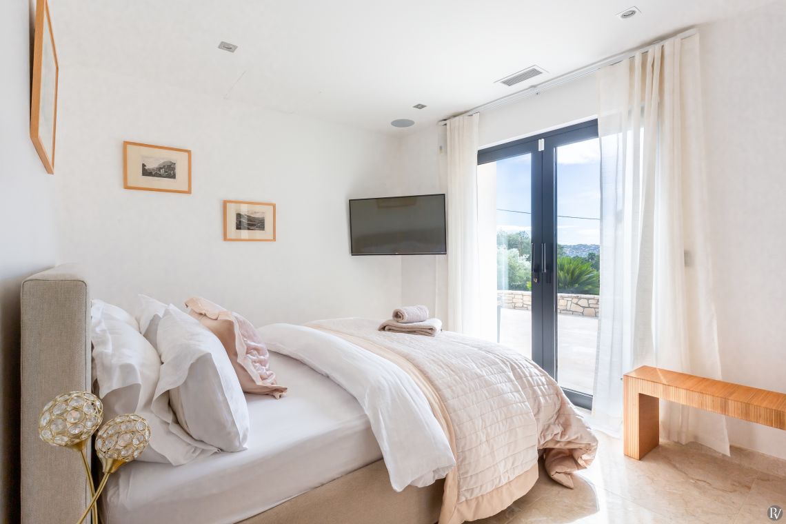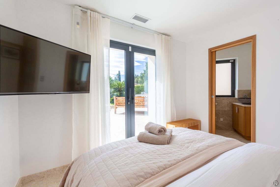 Bedroom 2: Double bedroom (160 x 200) with en suite shower room, fitted wardrobes, TV, and patio doors opening onto the poolside terrace.