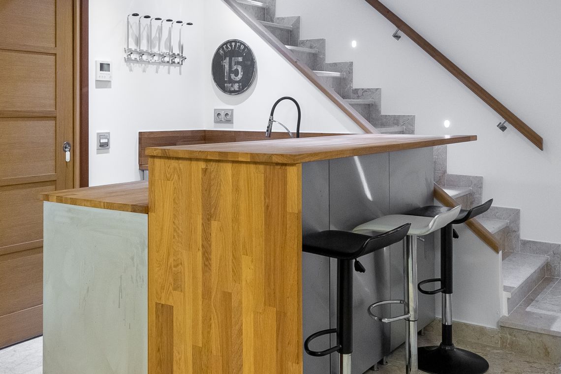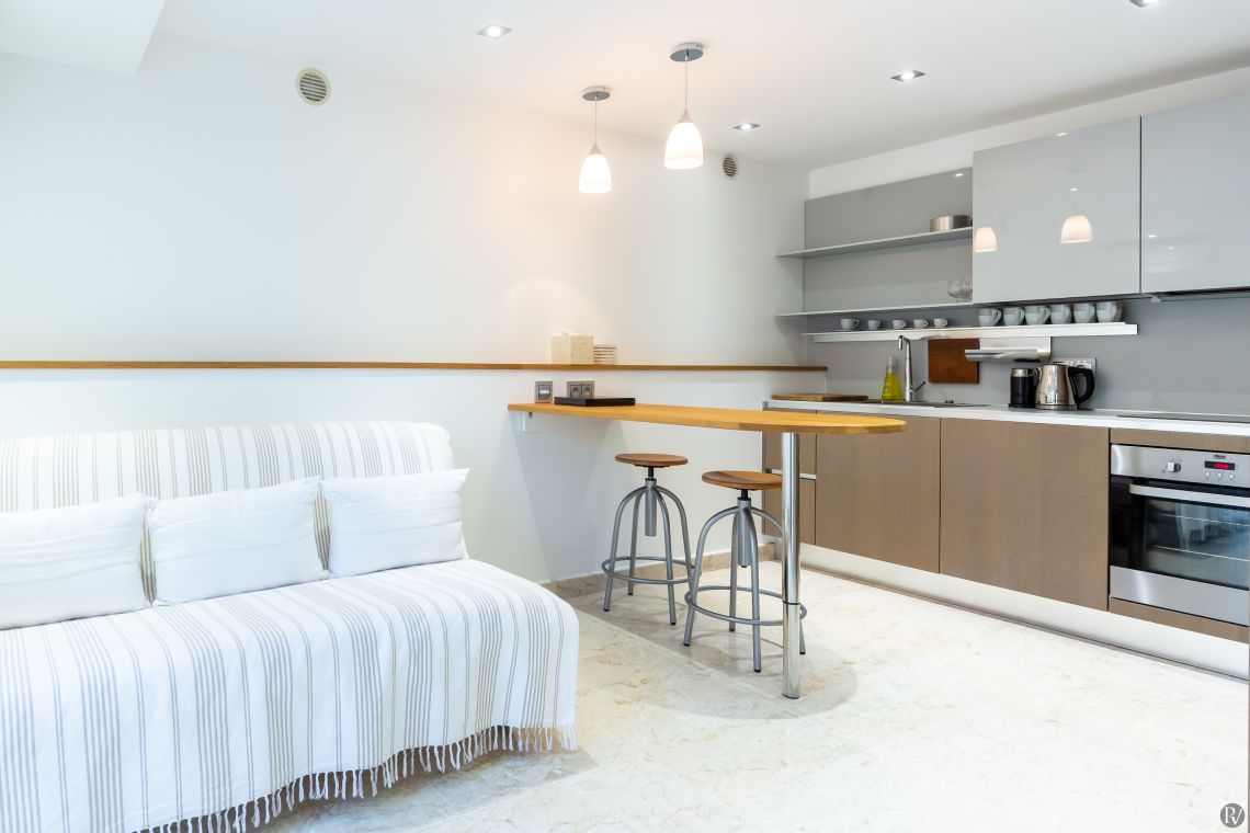 Villa Florent is arranged over three levels and designed to combine contemporary comfort with elegant open-plan living. On the ground floor, the entrance opens into a spacious open-plan living area with lounge, dining space, and a fully fitted kitchen equipped with Miele appliances and an American-style fridge freezer with ice machine. A second smaller kitchen and pantry with additional fridge freezer and workspace is located just off the main kitchen, along with a separate WC. Fully opening folding doors from the lounge lead directly onto the terrace, garden, and pool area, while an outdoor breakfast dining area is conveniently positioned beside the kitchen.