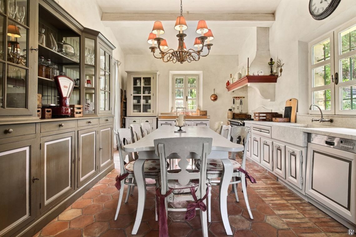 The ground floor features a welcoming living room with fireplace and TV, opening onto the terrace and pool area. A separate dining room leads to a covered terrace with al fresco dining facilities. The fully equipped traditional kitchen retains its terracotta flooring and opens directly onto the outdoor gas BBQ area. Two bedrooms are located on this level, both with direct access to the garden, along with a large bathroom with walk-in shower and a guest WC.