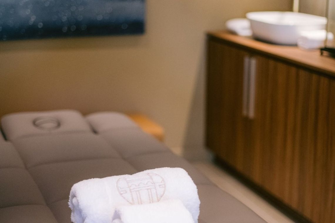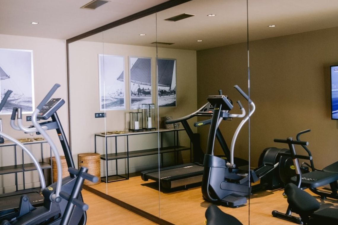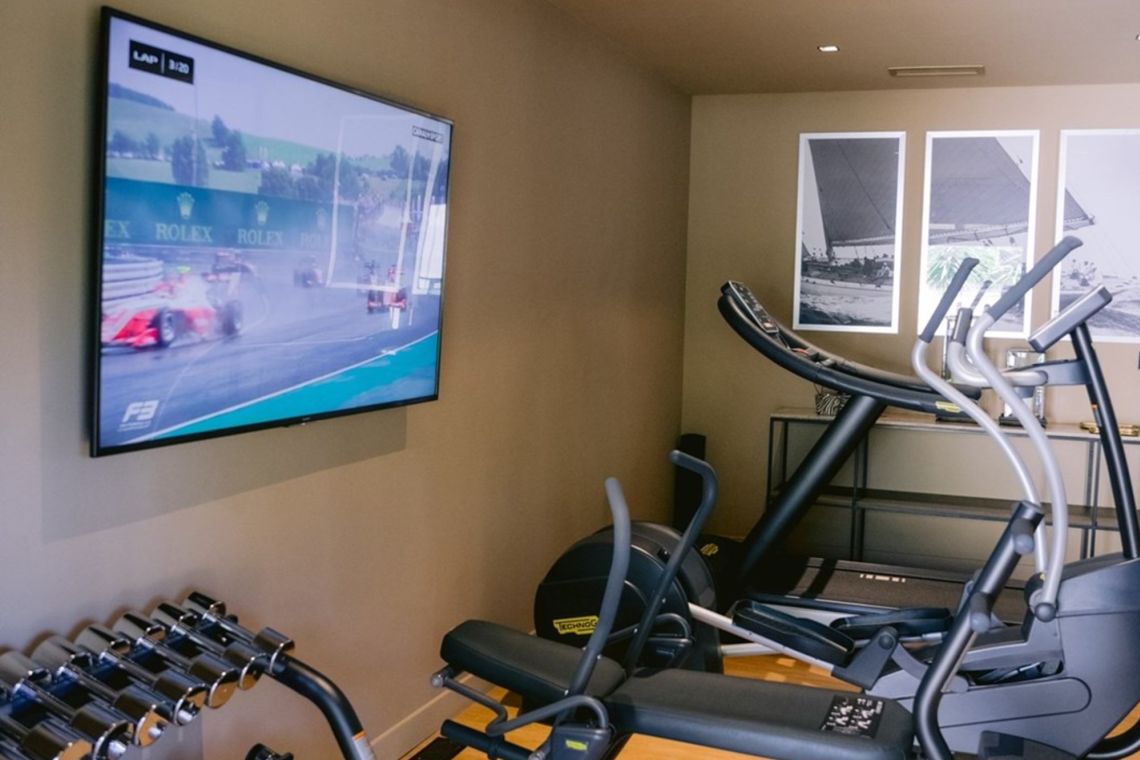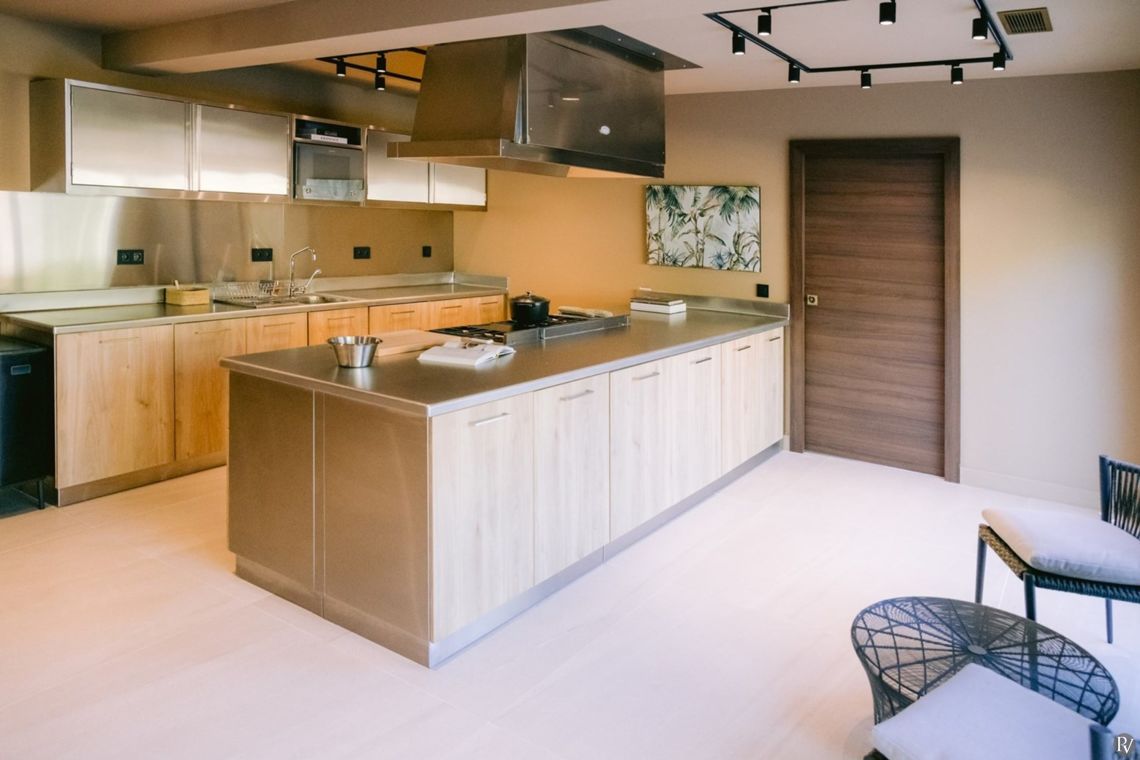 The first floor, which serves as the entrance level, features a spacious open-plan living area with direct access to a terrace. A family-style open kitchen is complemented by a bar and wine cellar, alongside a formal dining room, main living room, and TV room. Wellness facilities on this level include a massage room and a fully equipped fitness room. A laundry room and guest WC complete the floor.
