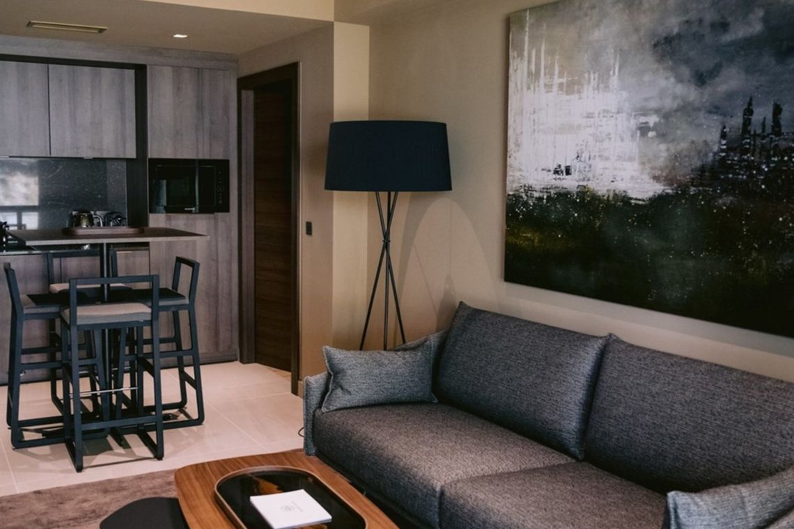 An independent apartment with separate access provides additional privacy, featuring its own living room, kitchenette, and bathrooms.