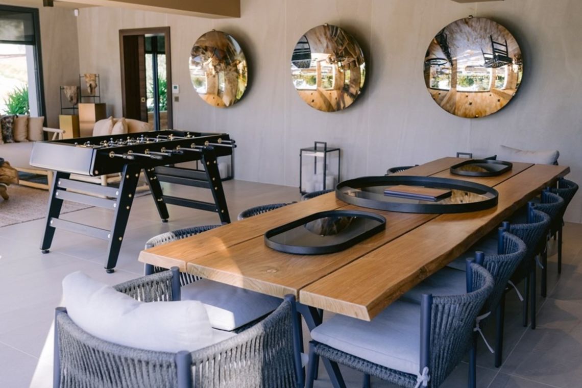 Set within 4,500 sqm of fully enclosed parkland, the villa is surrounded by manicured gardens, mature planting, palm trees, and expansive lawn areas. The outdoor spaces include a private 16 x 6 metre heatable swimming pool with Roman steps, a large sunbathing terrace, and an impressive 360 sqm fully equipped terrace designed for outdoor living and dining. Additional features include a fire brasero, barbecue grill, table football, covered private parking, and helipad access. A direct private path leads to the beach, located just 400 metres away.