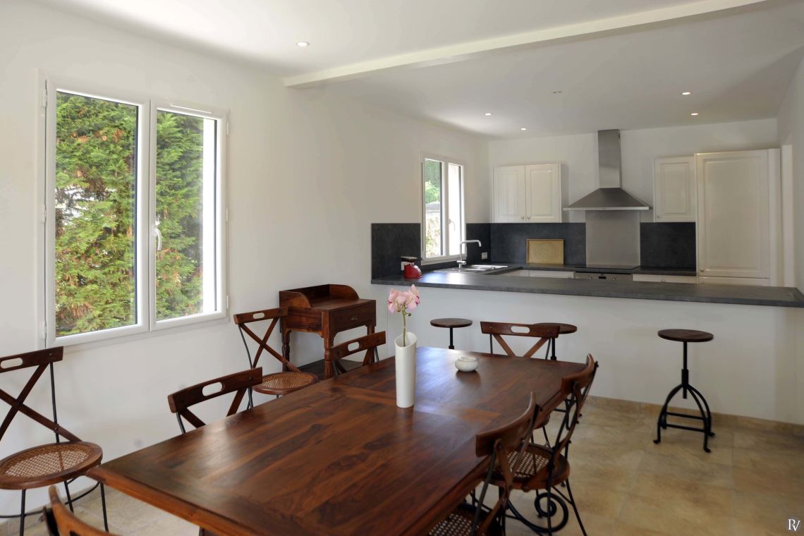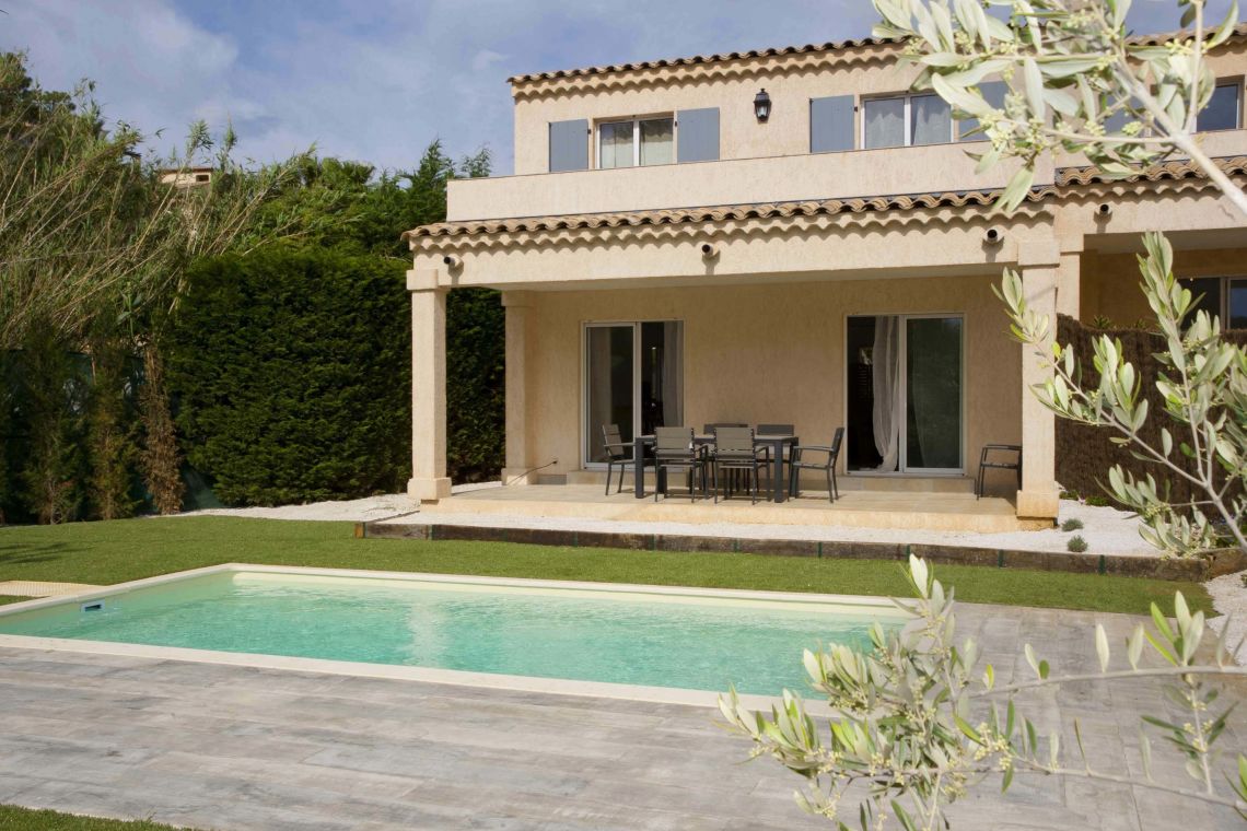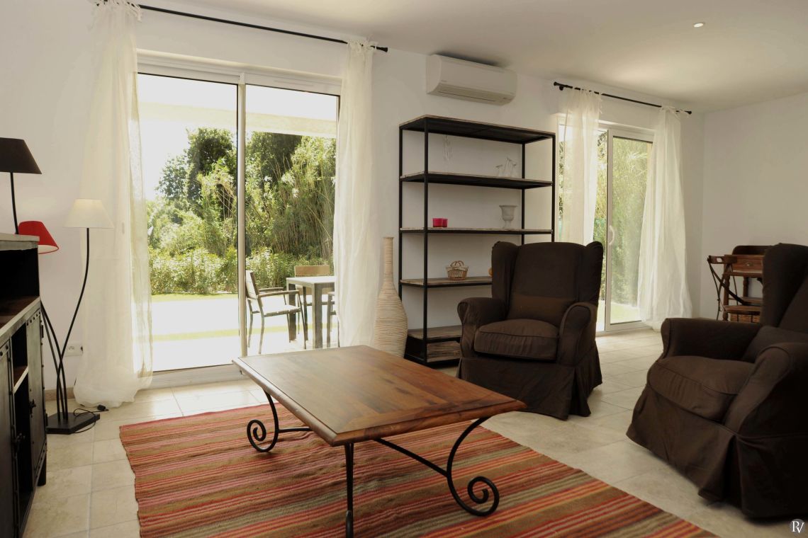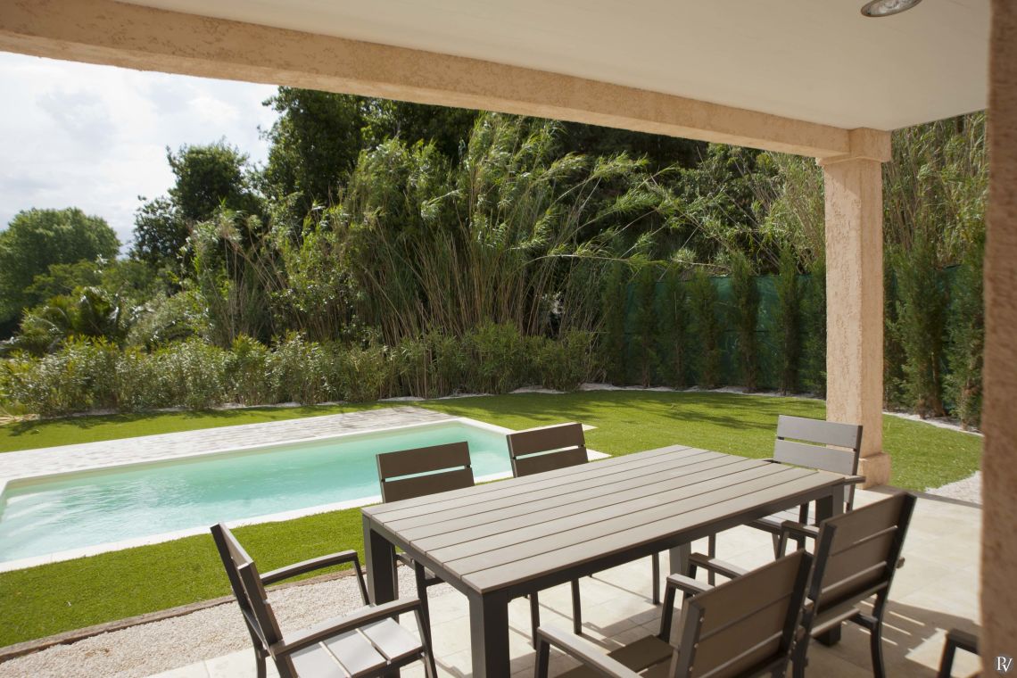 The villa sits on flat, beautifully maintained grounds, mostly laid to lawn and framed by hedgerows and mature trees for privacy. A covered terrace with a dining table invites you to enjoy meals al fresco, while the private 6.5 m × 3.5 m pool, complete with Roman steps, offers the perfect spot for a refreshing swim. Surrounding the pool, a sunbathing terrace with loungers provides a relaxing place to soak up the French Riviera sun. Private parking is also available on the property.