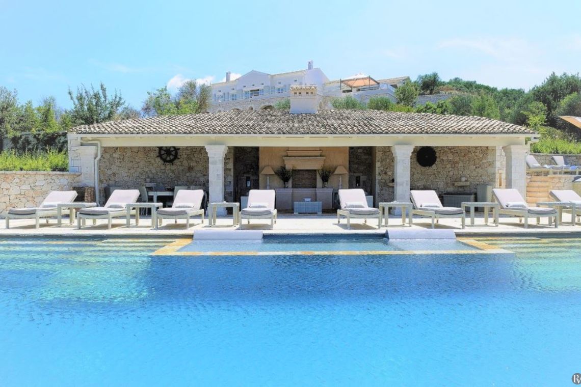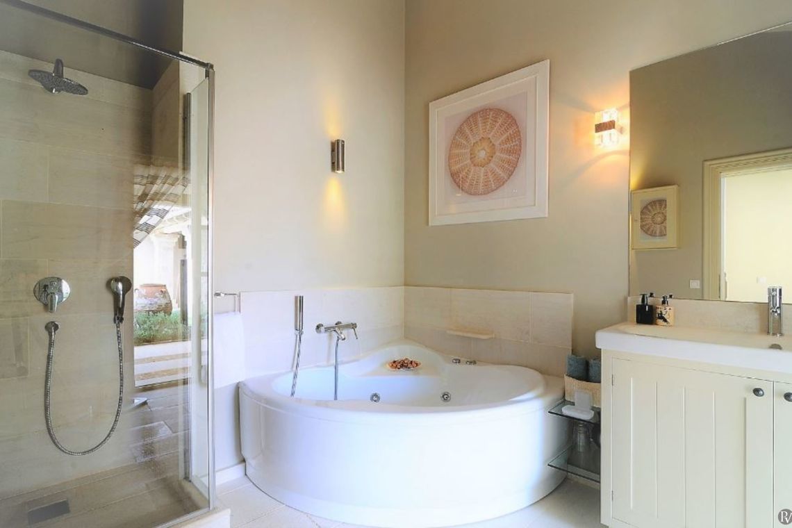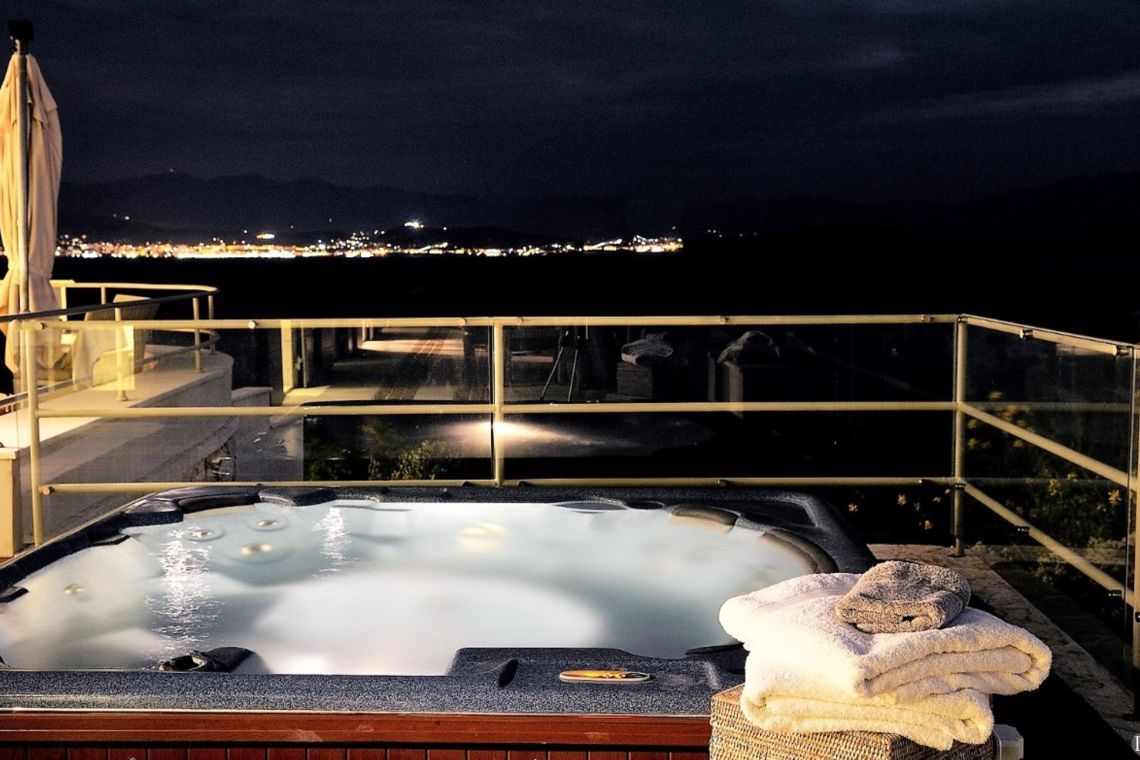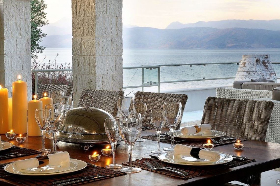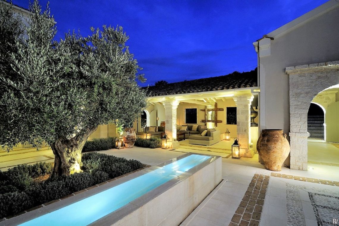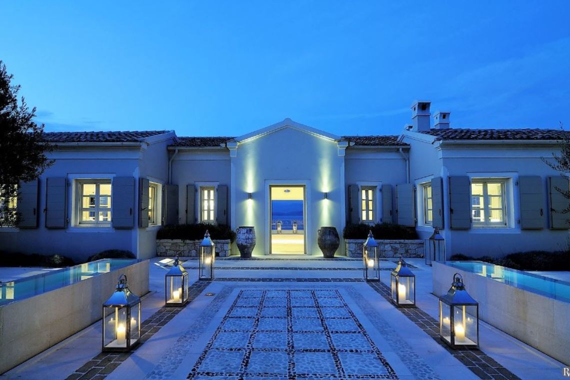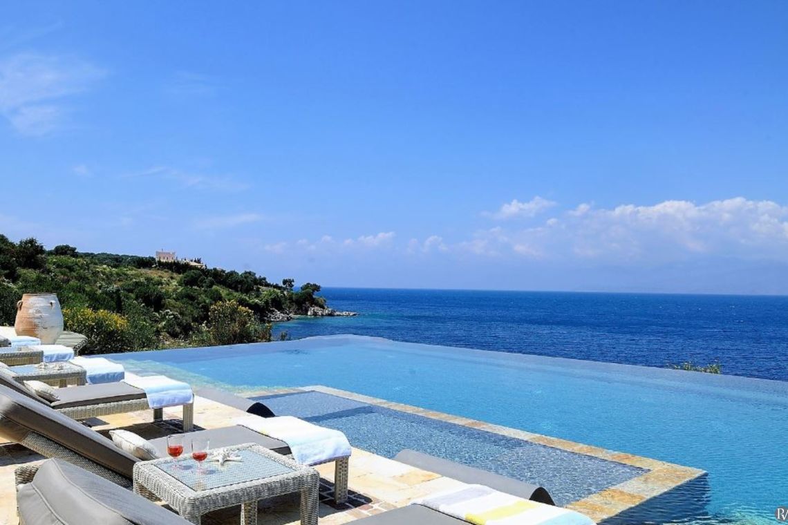 The outdoor area of Villa Nemesis is a sanctuary of relaxation and entertainment, offering breathtaking views of the Ionian Sea. The centerpiece is a private salt-water infinity pool (20m x 9m) accompanied by a children’s pool and a 9-seater Jacuzzi. Sun loungers and two built-in sunken daybeds provide the perfect spots for soaking up the sun.