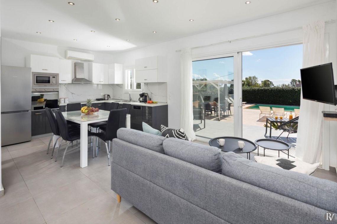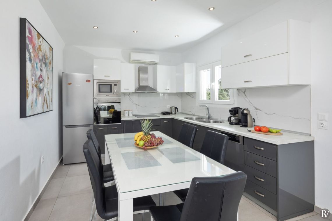 Inside, the villa welcomes guests with a bright and comfortable interior. The open-plan living area includes plush seating, a 36-inch television, and direct access to the terrace and pool. The modern kitchen is fully fitted for a relaxed stay, featuring a dishwasher, oven, microwave, coffee machine, and a dining table for six.