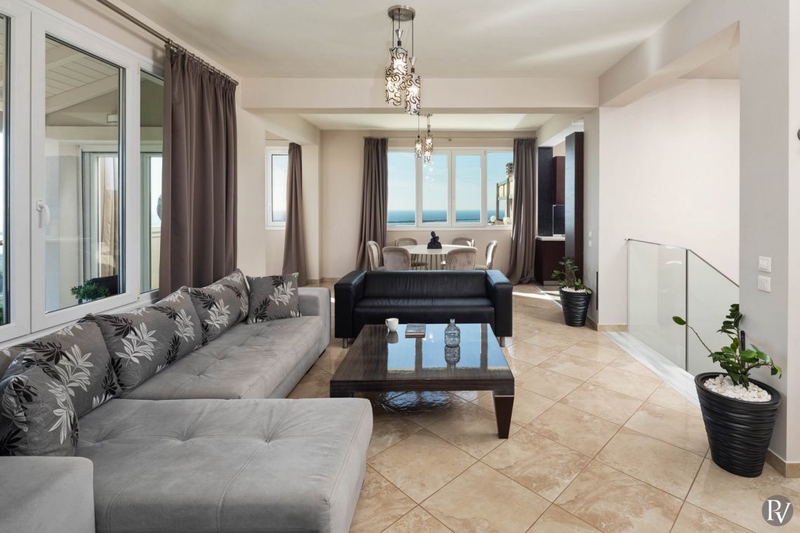 An elegant staircase leads to the upper floor, where a bright and spacious open-plan living and dining area unfolds. Large picture windows flood the space with natural light and showcase uninterrupted views of the sea. Carefully selected furnishings and tasteful décor create a welcoming atmosphere ideal for both relaxation and entertaining. For added convenience, a second modern shower room is located just off the living area.