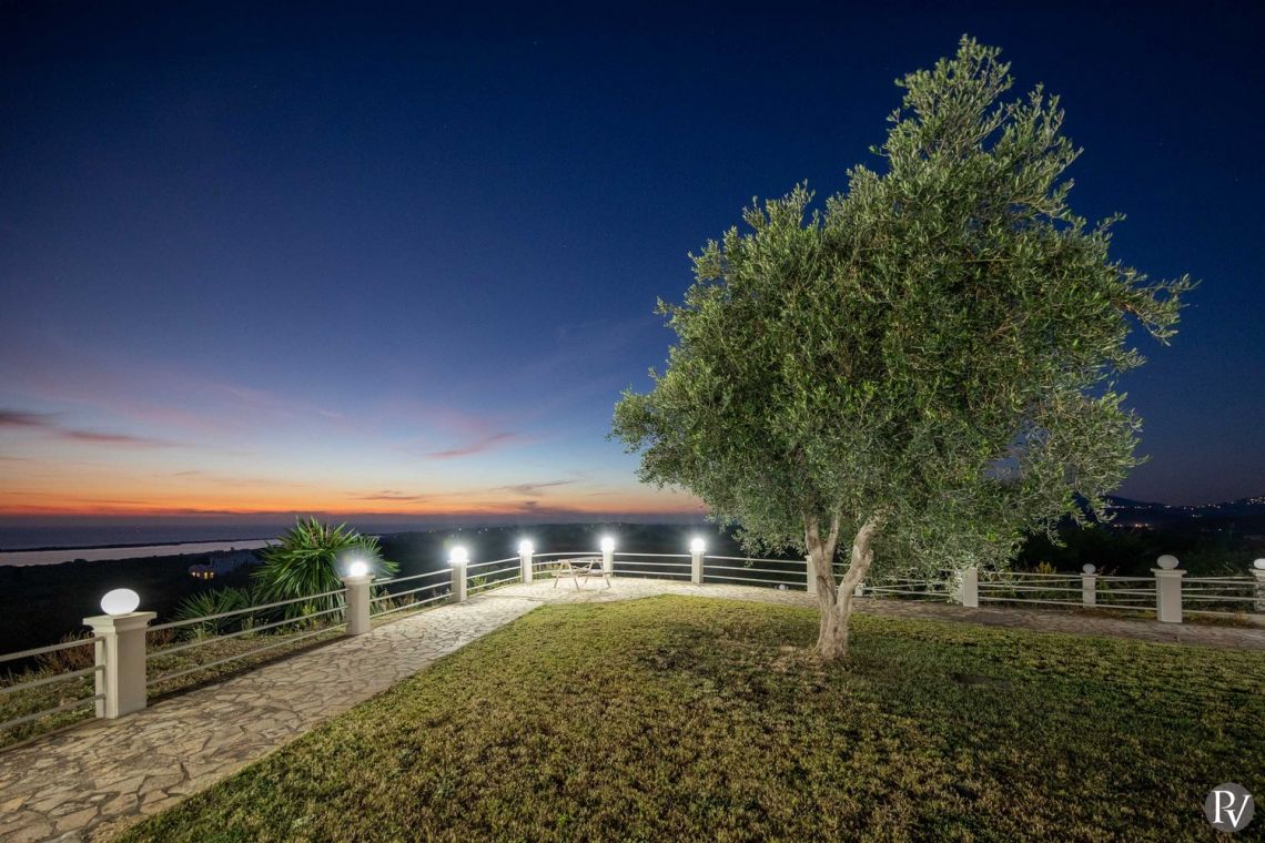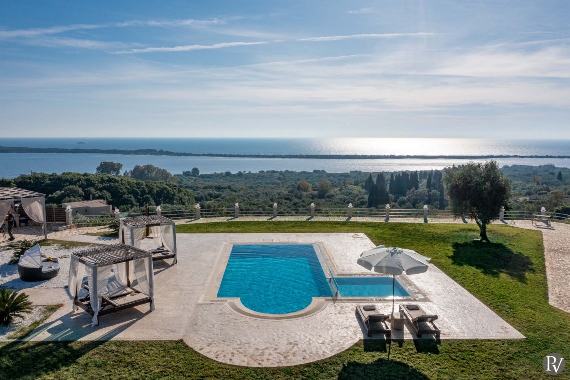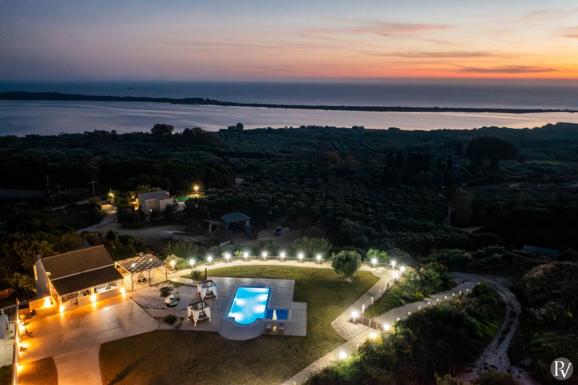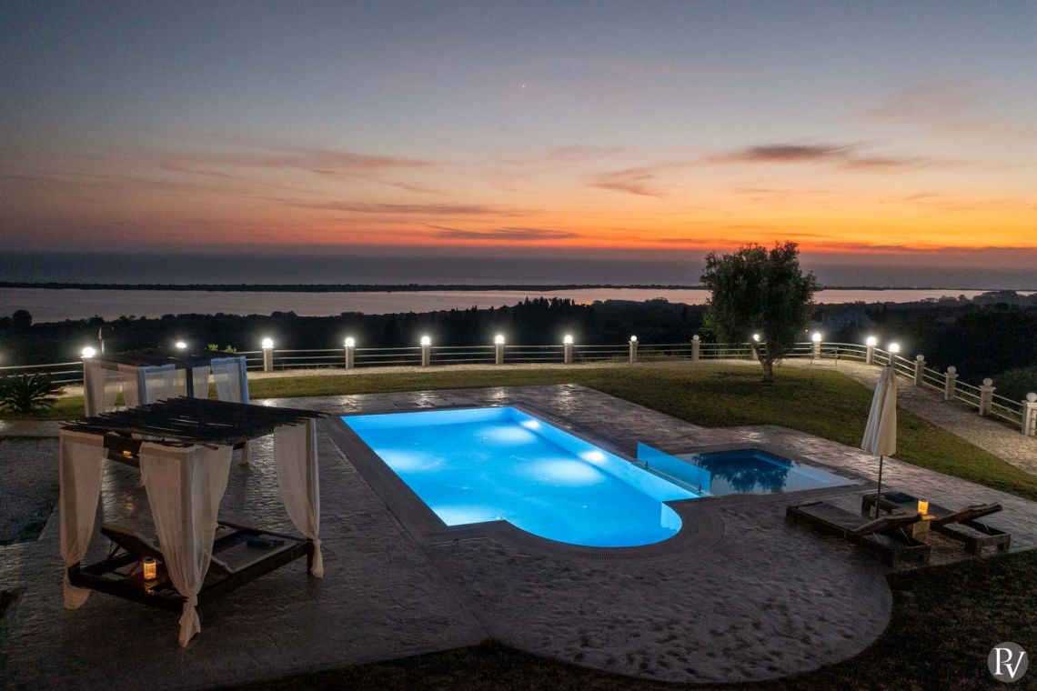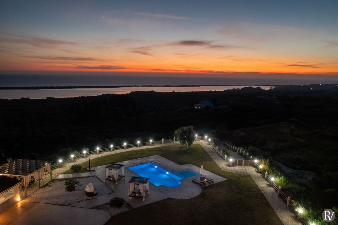 Set high above the peaceful waters of Lake Korission, Villa Lumina is a refined coastal haven offering uninterrupted panoramic views across the shimmering Mediterranean Sea and the calm lake below. Its privileged position guarantees privacy while surrounding guests with unspoiled natural beauty. Just a short distance away, the golden sands of Halikounas Beach invite you to enjoy the sun and crystal-clear waters.