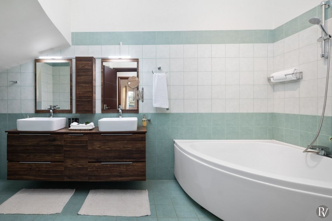 Entered via a spacious private parking area, the villa’s lower level accommodates two stylishly furnished double bedrooms. Both rooms open onto a shared sea facing balcony, creating a perfect setting for morning coffee or sunset drinks while admiring the breathtaking views. This level also includes a beautifully finished family bathroom fitted with contemporary, high quality fixtures.