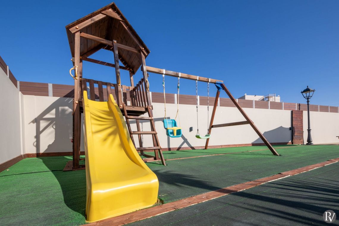 The spacious grounds form a private haven, complete with expertly designed gardens, expansive lawns, and a dedicated playground for children. A large swimming pool, including a shallow section for younger guests, offers the perfect balance of fun and relaxation. Every element has been thoughtfully arranged to combine comfort, elegance, and family-friendly living.