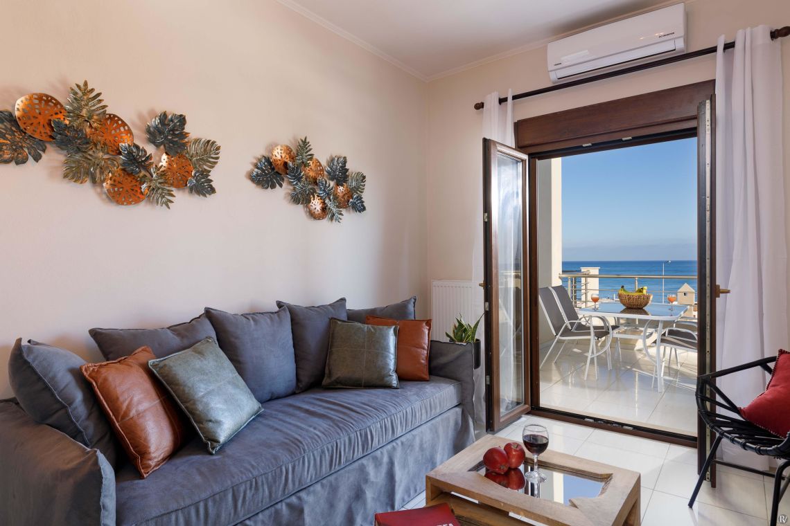 The outdoor areas are designed for relaxation and enjoyment. Guests have access to the shared swimming pool, ideal for cooling off and soaking up the Cretan sun. Private terraces and balconies offer stunning sea views and are furnished with brand-new outdoor furniture for maximum comfort.